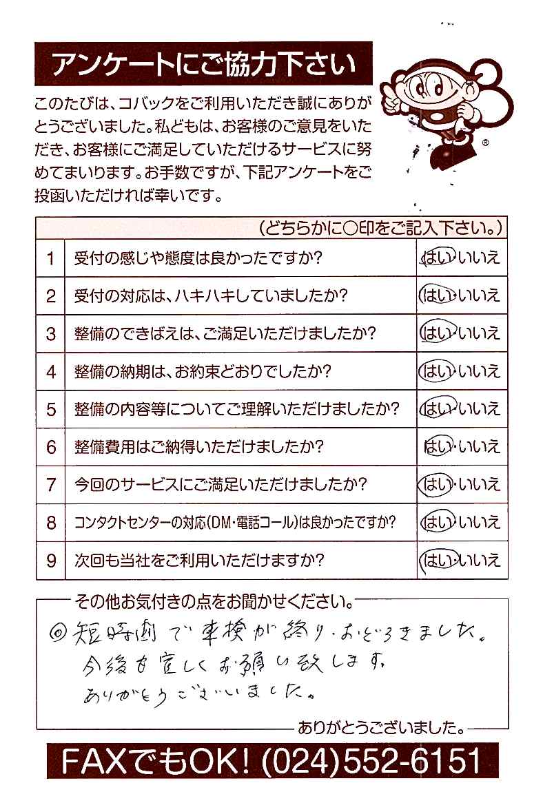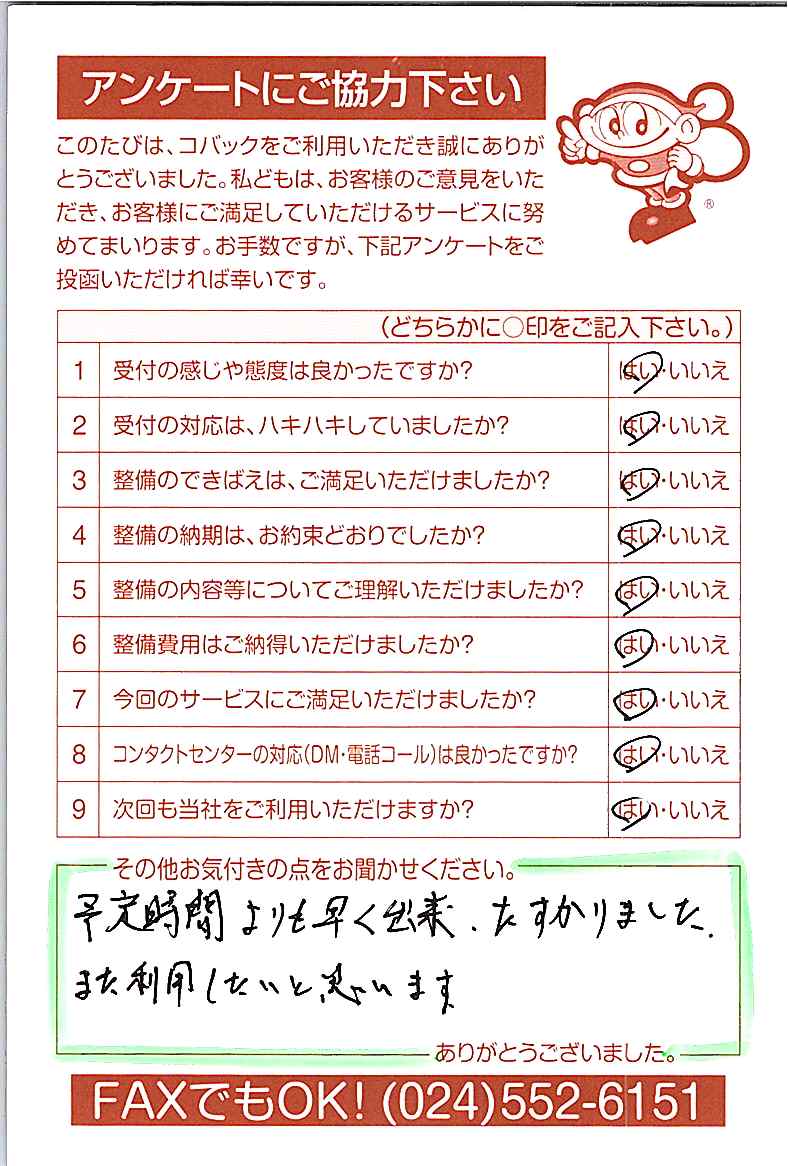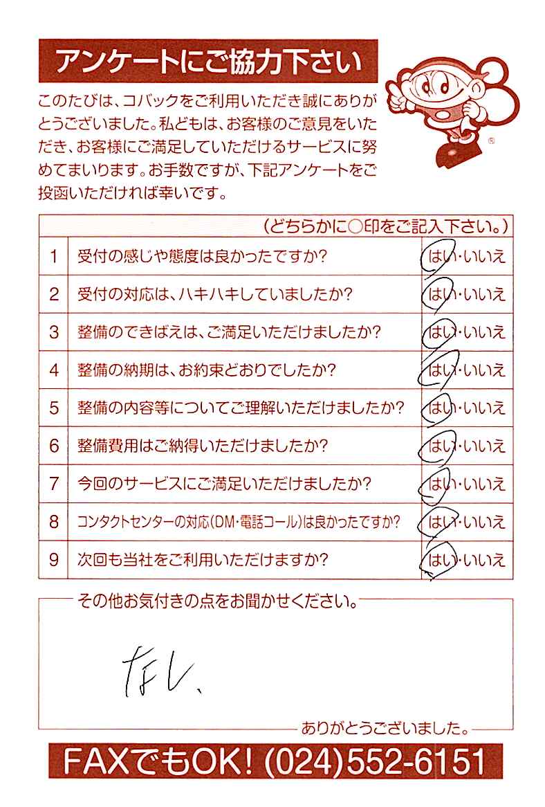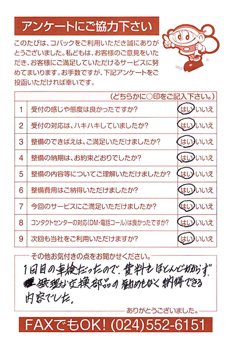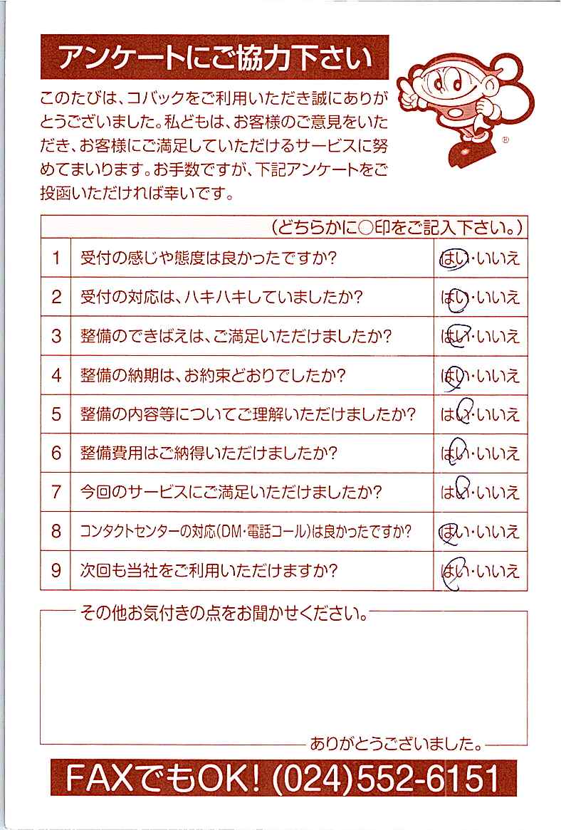 お客様からいただいたアンケートハガキをご紹介いたします。お寄せいただいた貴重なご意見は、今後の大久自動車販売のより良いサービスに繋げて行きたいと思っております。