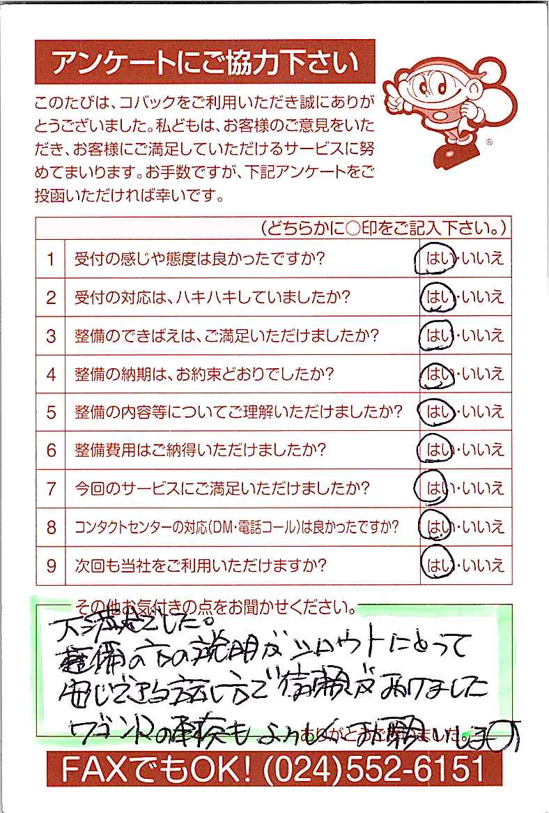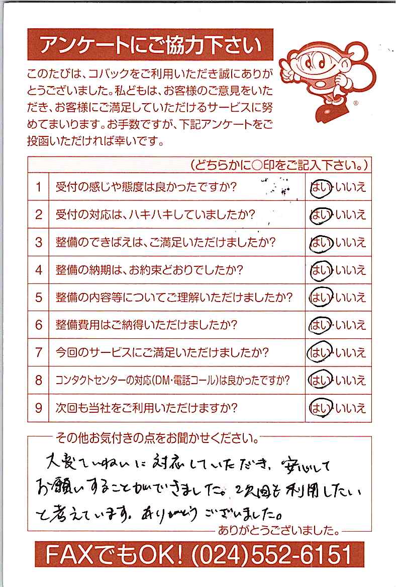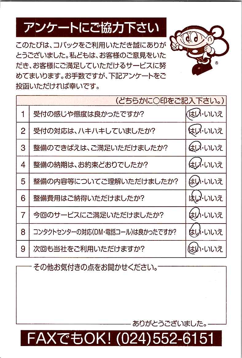 お客様からいただいたアンケートハガキをご紹介いたします。お寄せいただいた貴重なご意見は、今後の大久自動車販売のより良いサービスに繋げて行きたいと思っております。