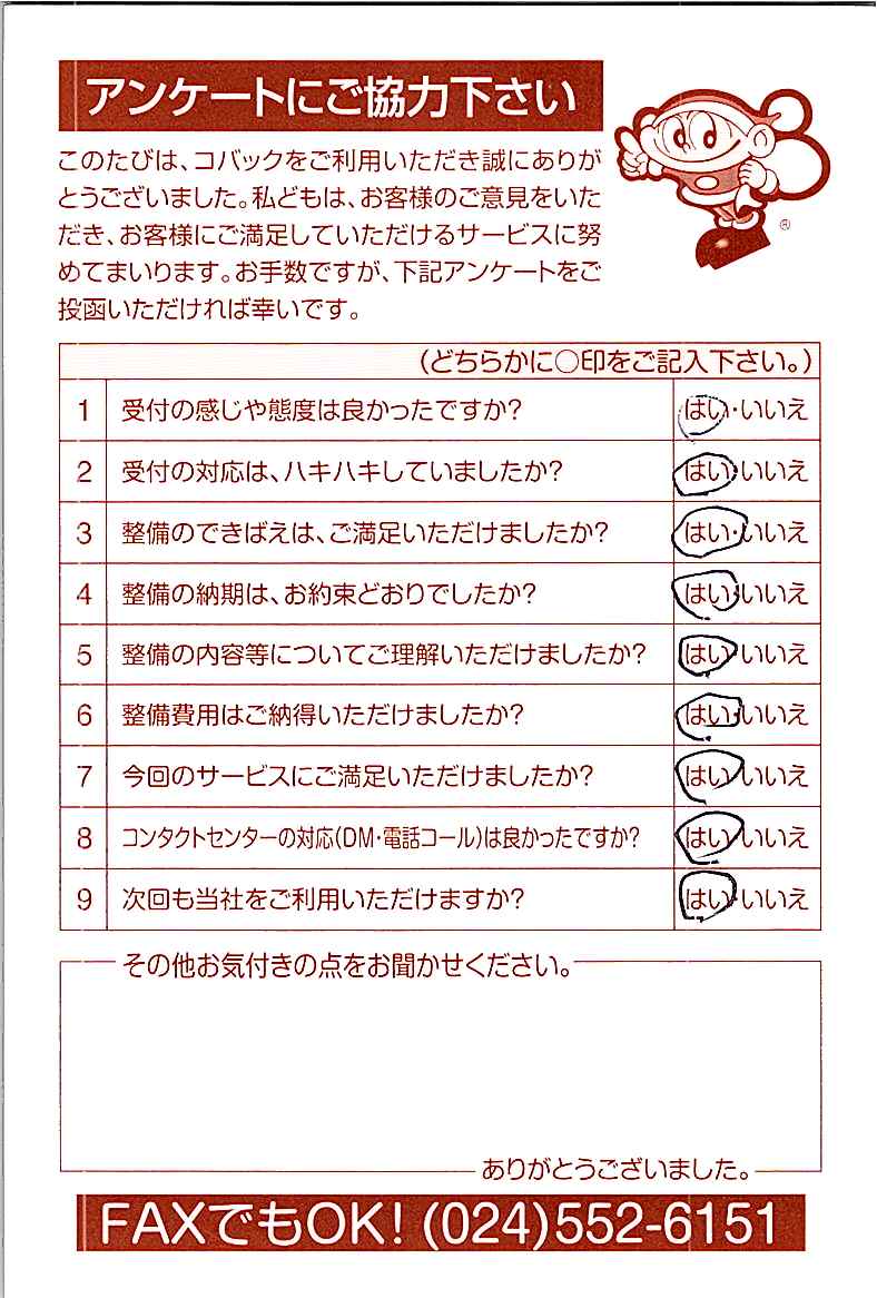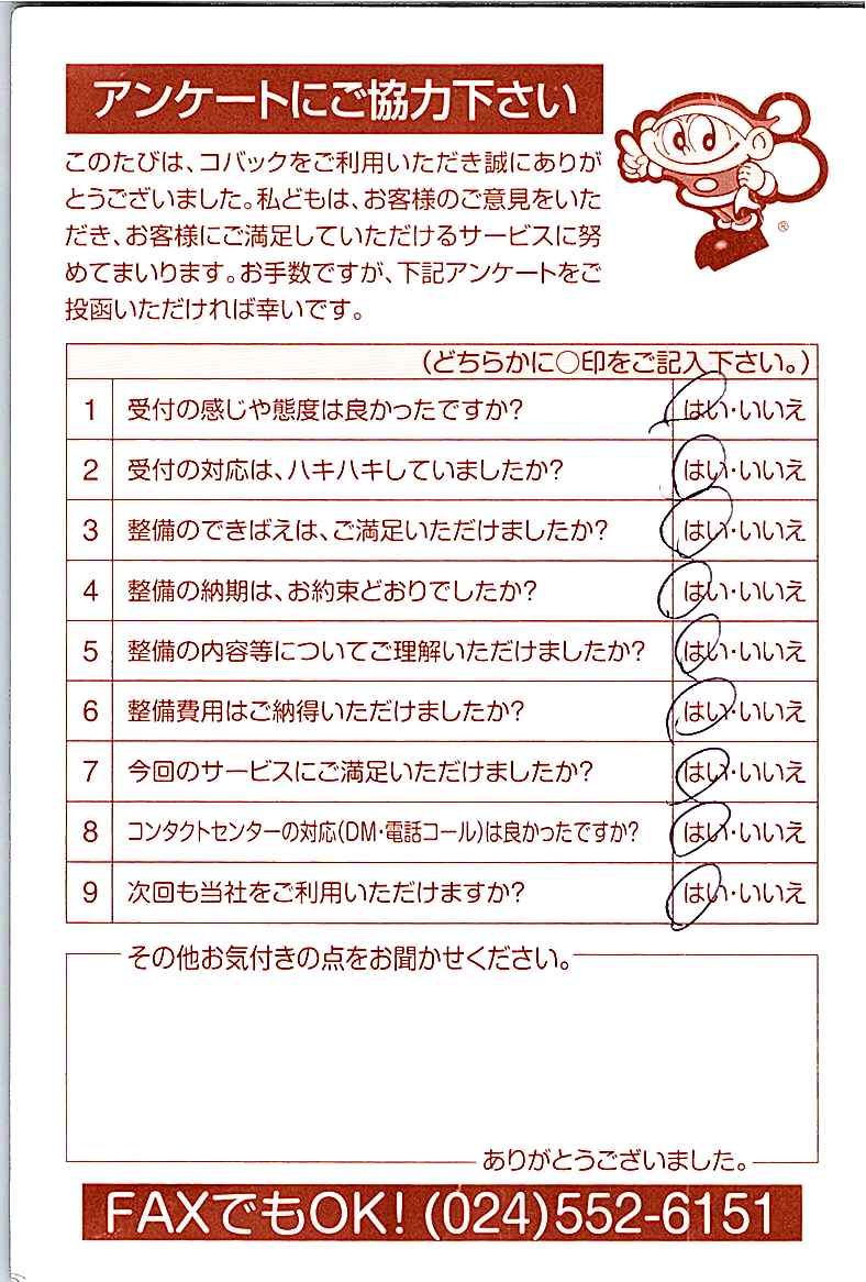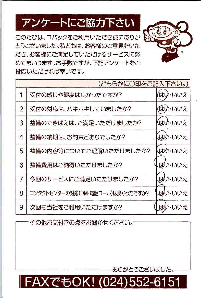 車検のコバック各店をご利用後には、ぜひアンケートのご協力をよろしくお願いいたします。