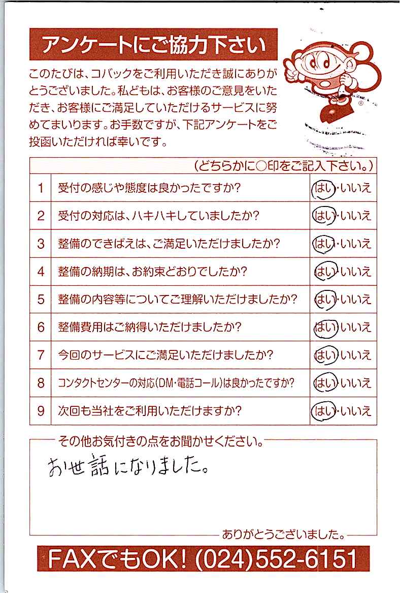 お客様からいただいたアンケートハガキをご紹介いたします。お寄せいただいた貴重なご意見は、今後の大久自動車販売のより良いサービスに繋げて行きたいと思っております。