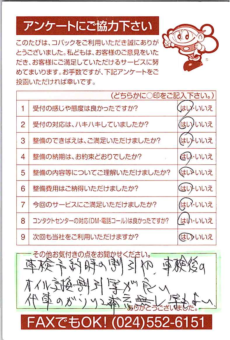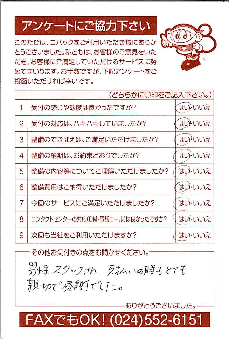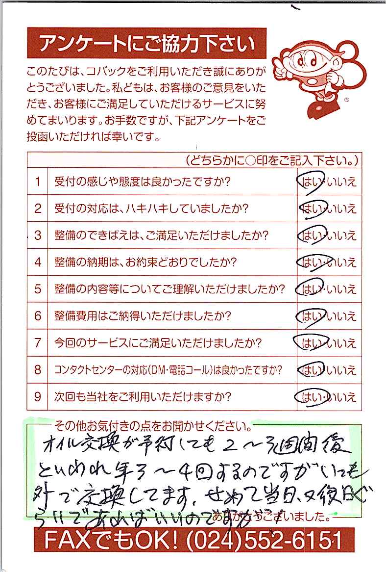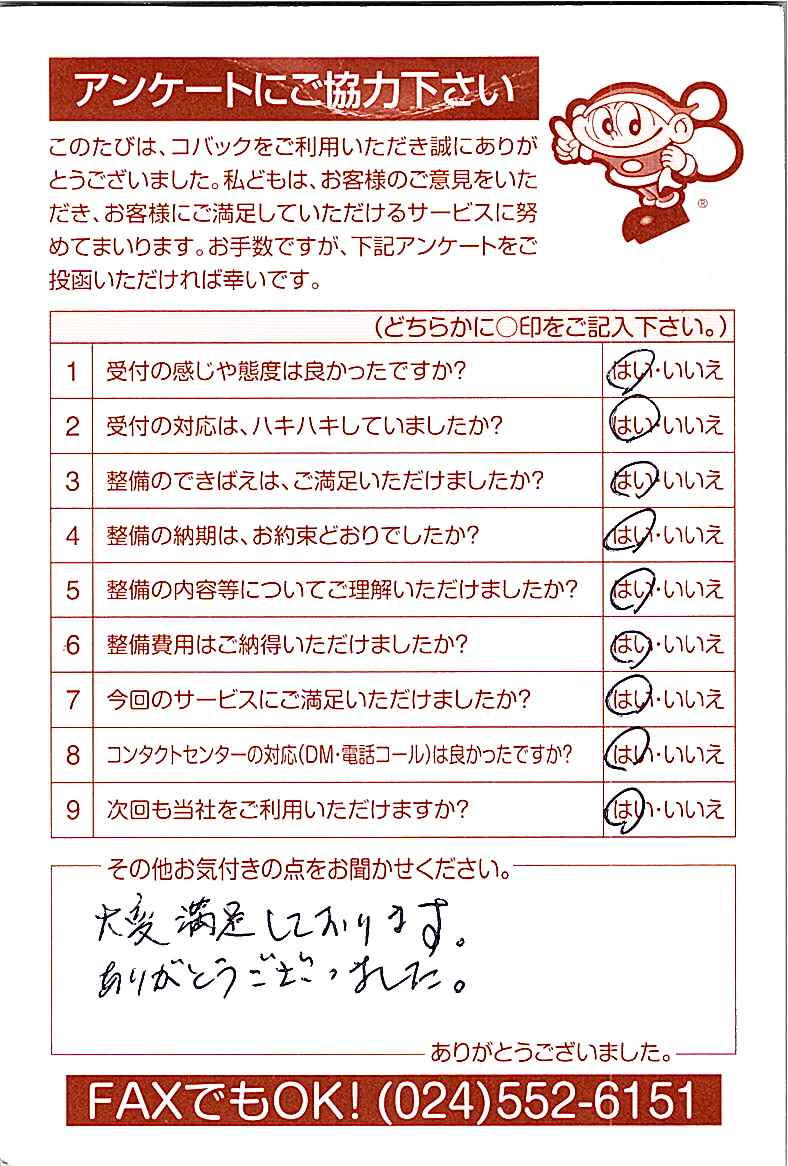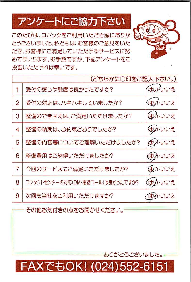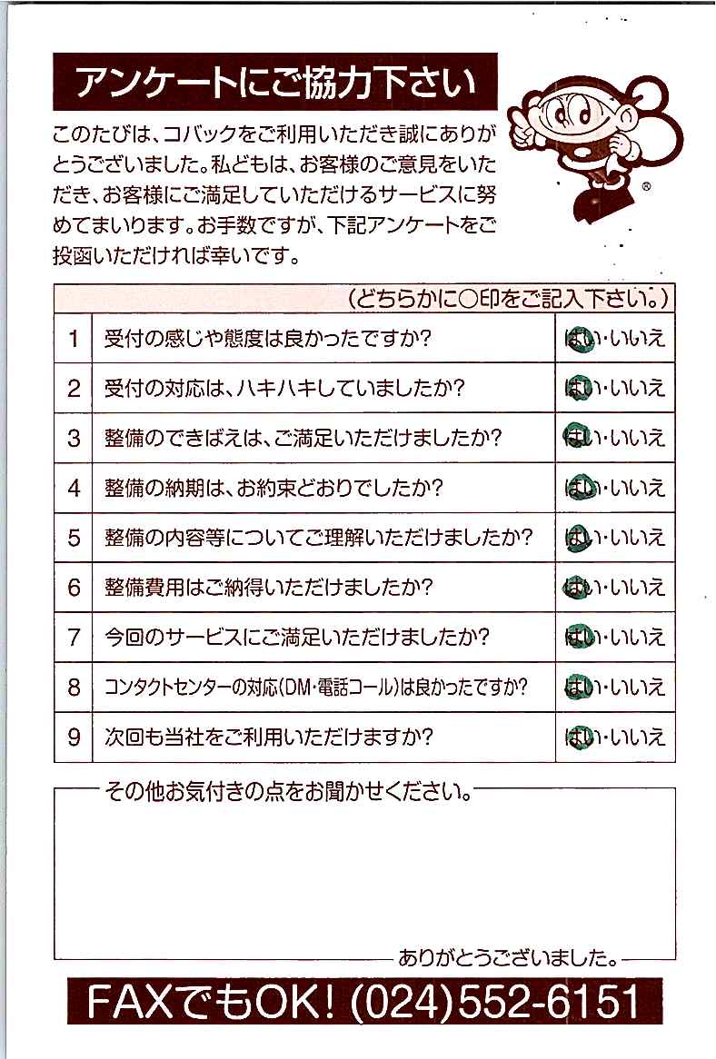 お客様からいただいたアンケートハガキをご紹介いたします。お寄せいただいた貴重なご意見は、今後の大久自動車販売のより良いサービスに繋げて行きたいと思っております。