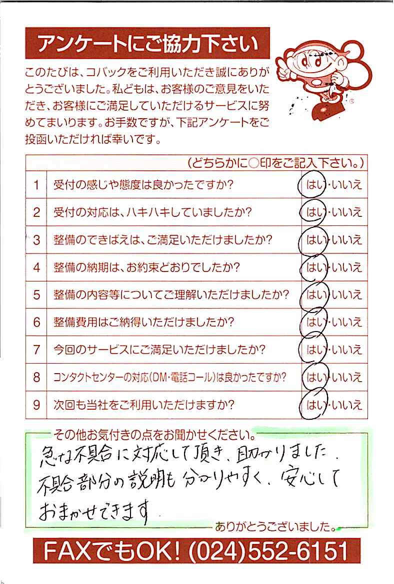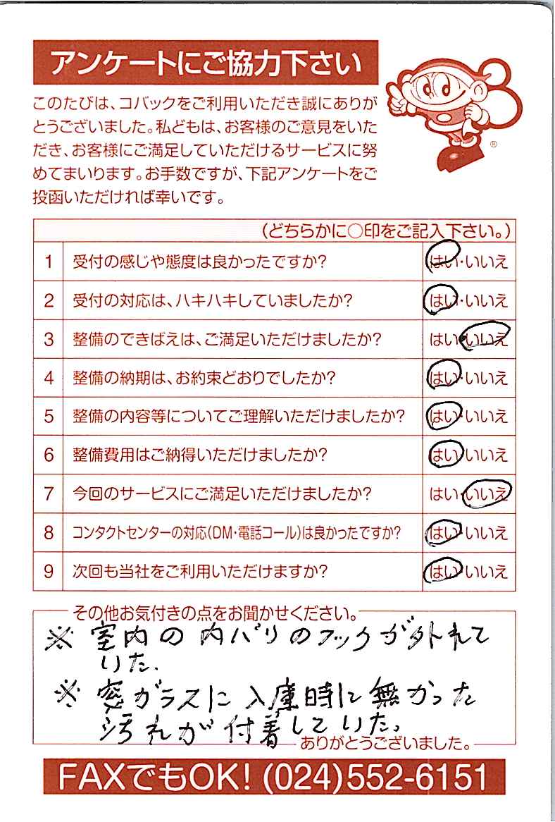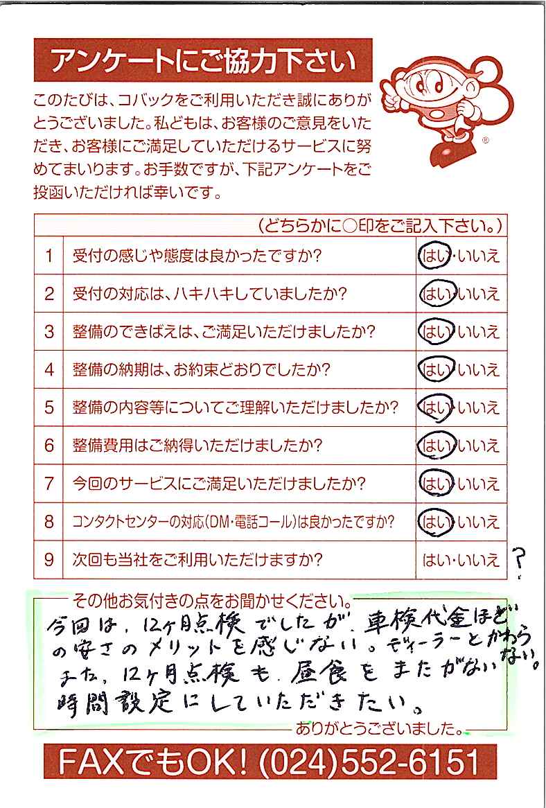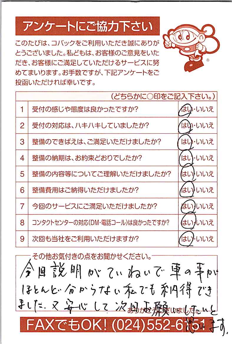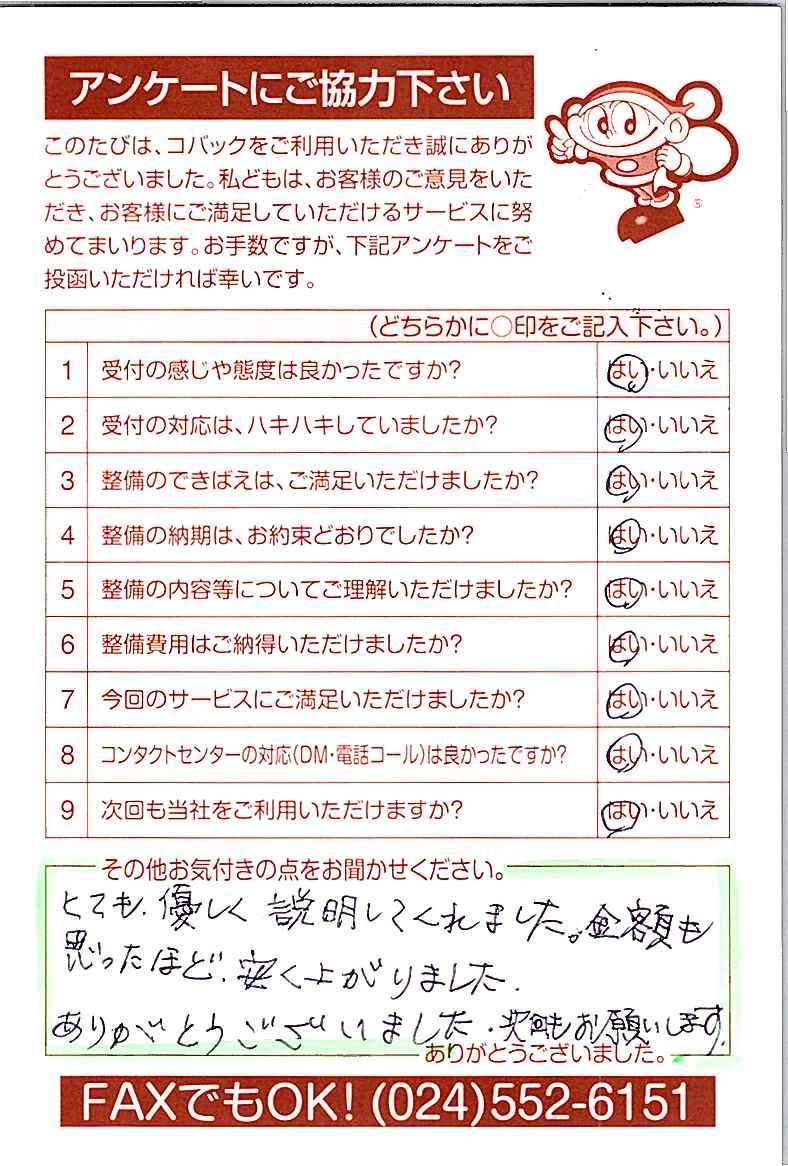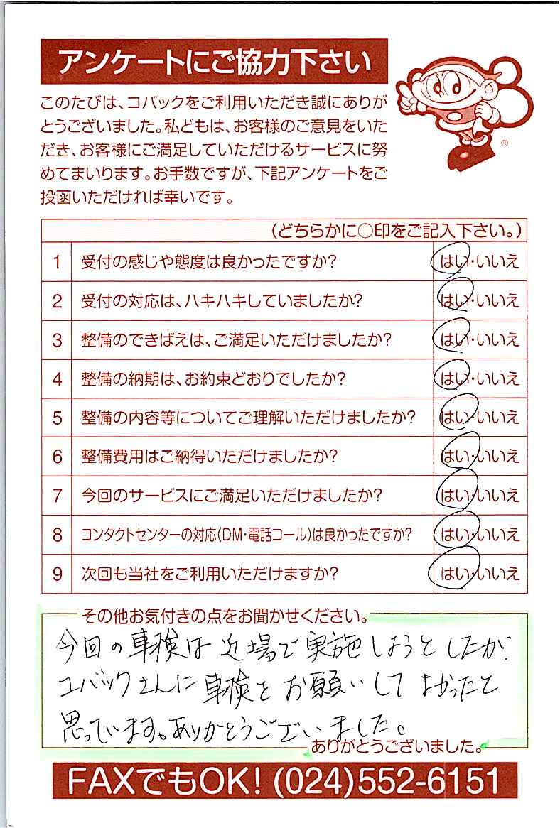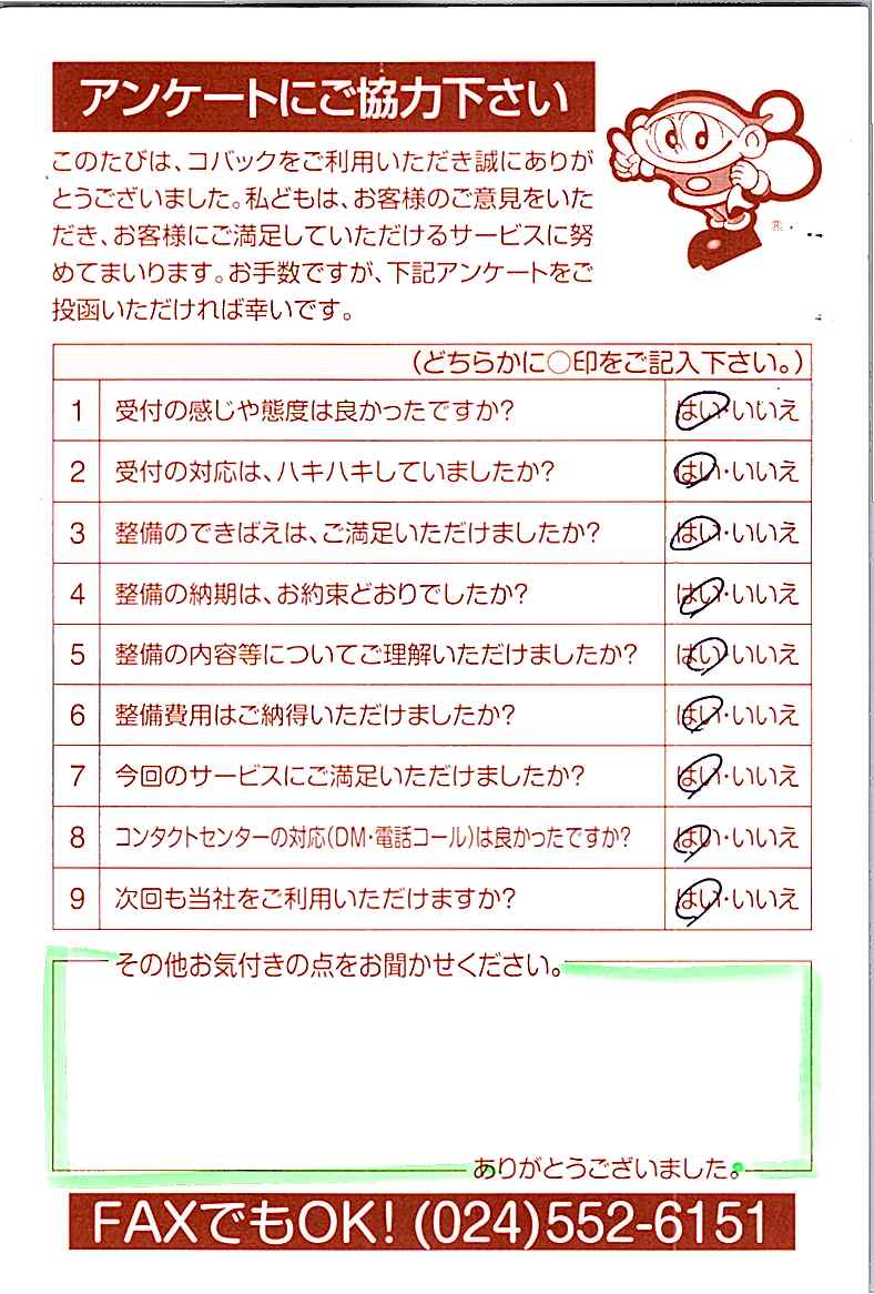 お客様からいただいたアンケートハガキをご紹介いたします。お寄せいただいた貴重なご意見は、今後の大久自動車販売のより良いサービスに繋げて行きたいと思っております。