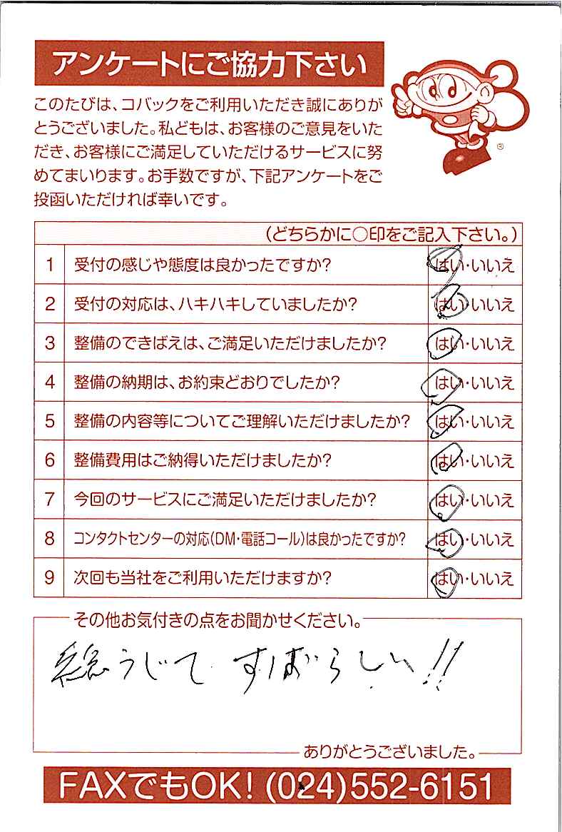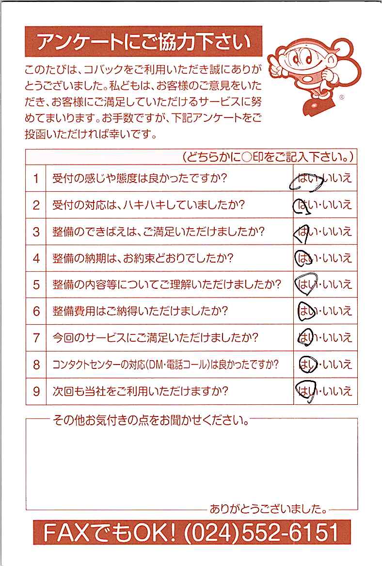 お客様からいただいたアンケートハガキをご紹介いたします。お寄せいただいた貴重なご意見は、今後の大久自動車販売のより良いサービスに繋げて行きたいと思っております。