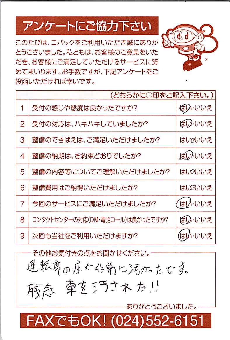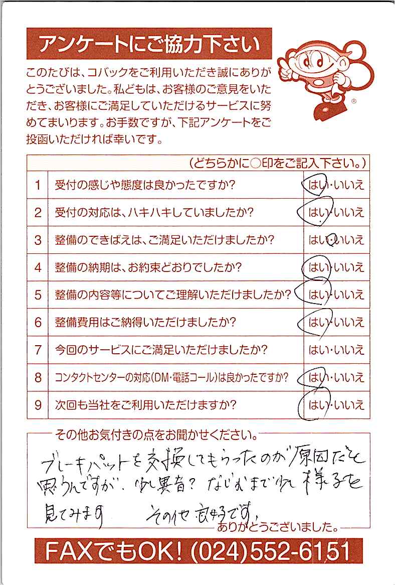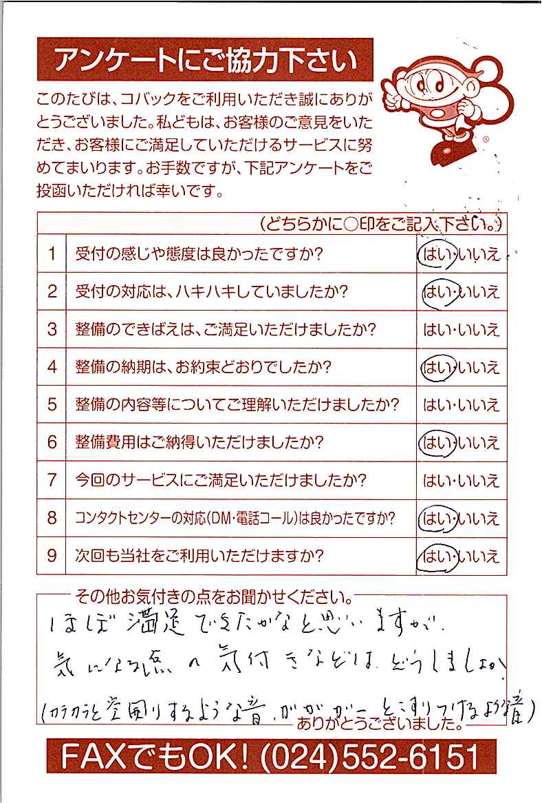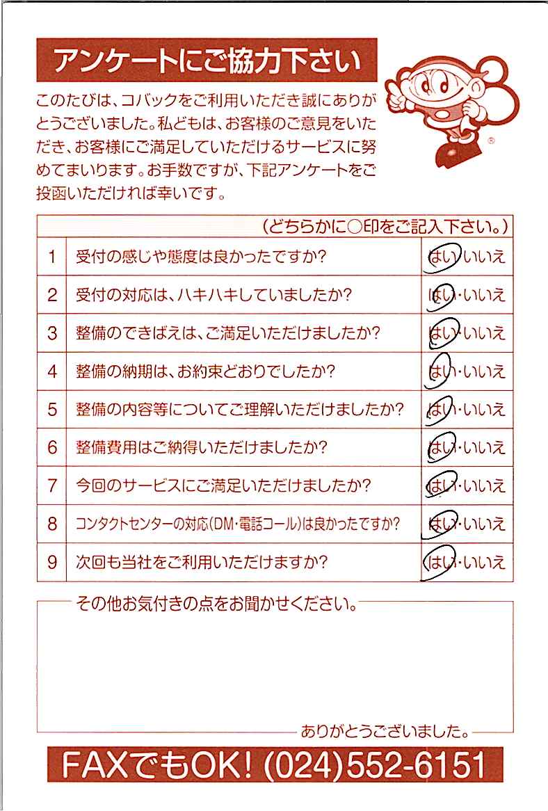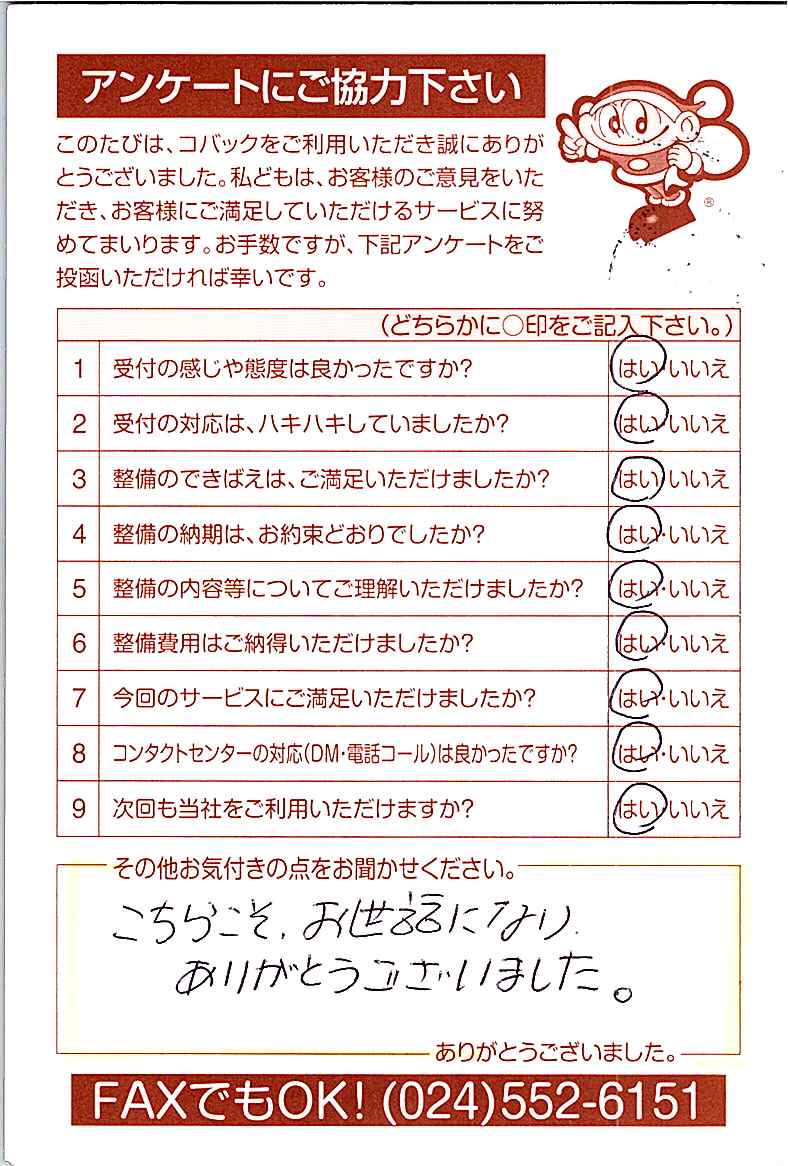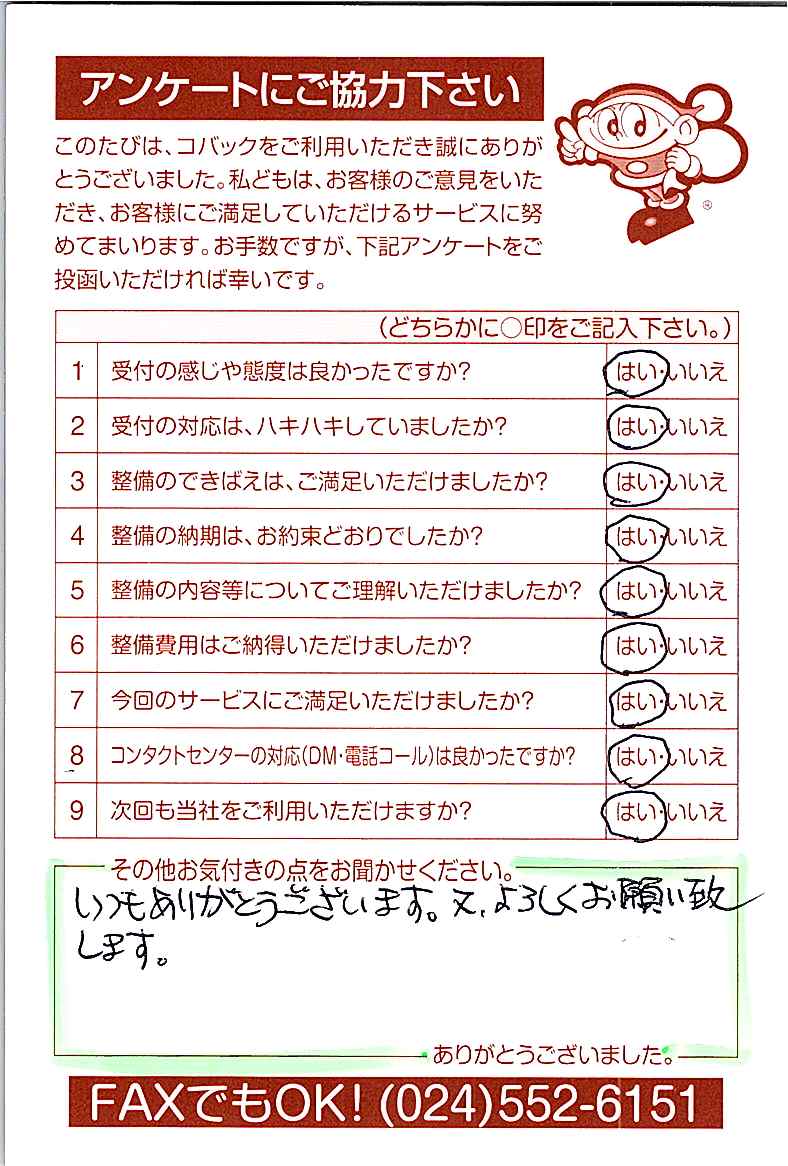 お客様からいただいたアンケートハガキをご紹介いたします。お寄せいただいた貴重なご意見は、今後の大久自動車販売のより良いサービスに繋げて行きたいと思っております。