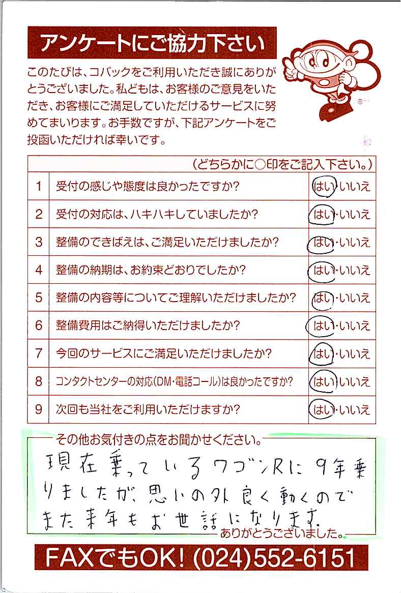 お客様からいただいたアンケートハガキをご紹介いたします。お寄せいただいた貴重なご意見は、今後の大久自動車販売のより良いサービスに繋げて行きたいと思っております。