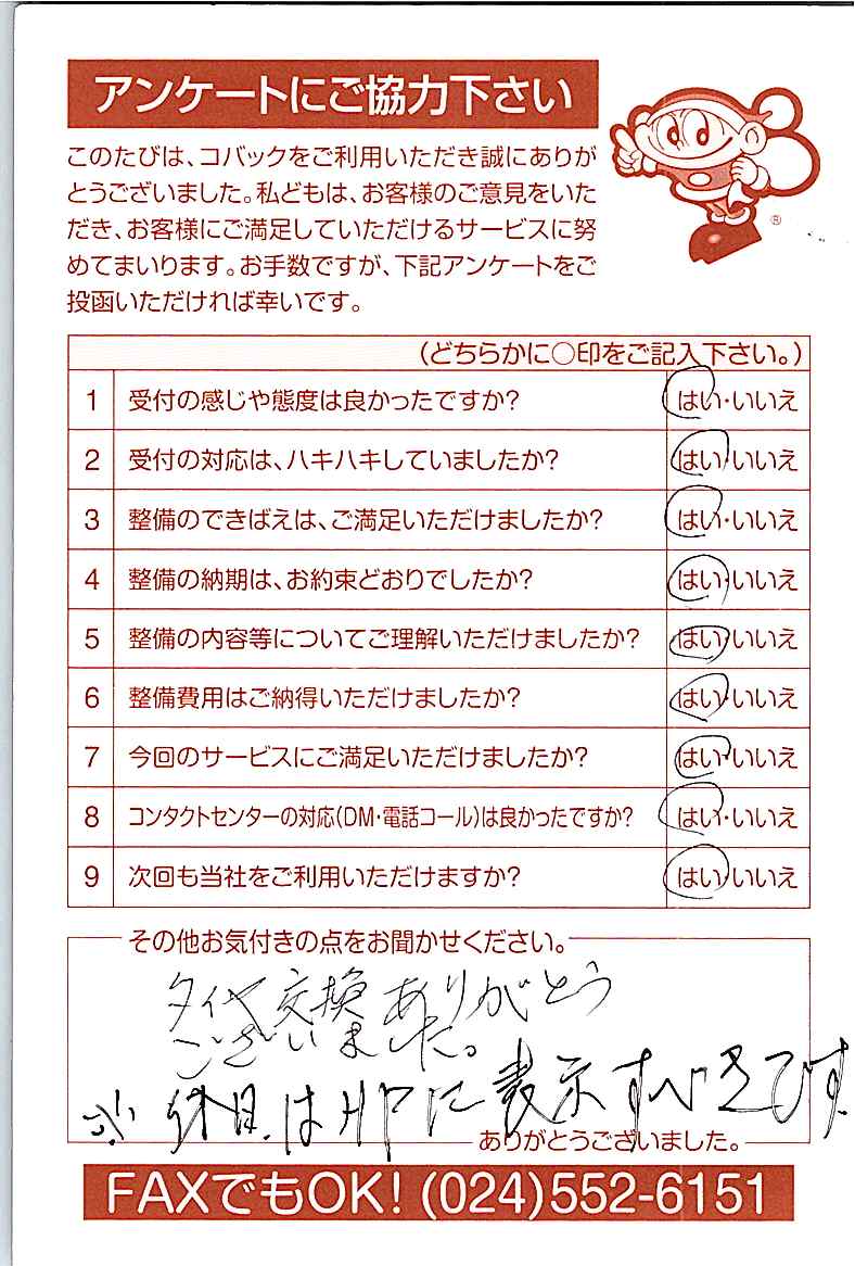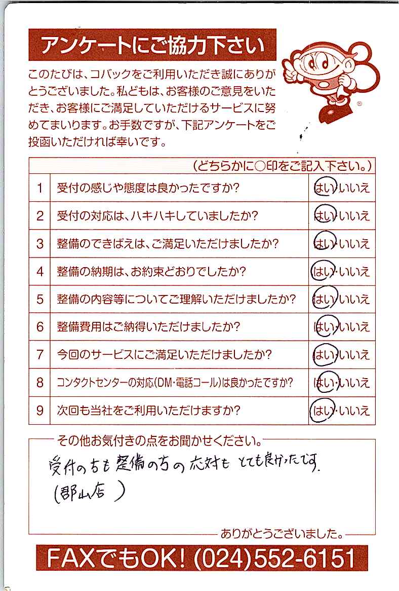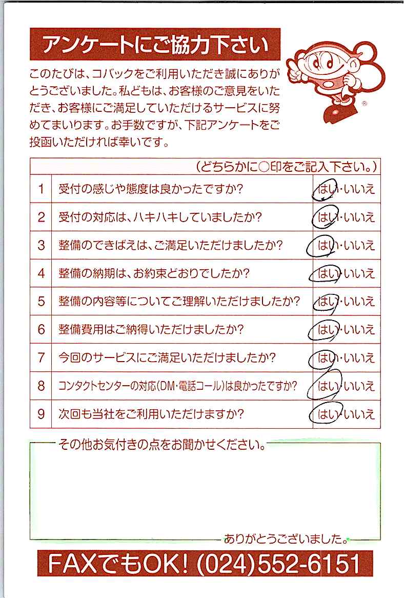 お客様からいただいたアンケートハガキをご紹介いたします。お寄せいただいた貴重なご意見は、今後の大久自動車販売のより良いサービスに繋げて行きたいと思っております。