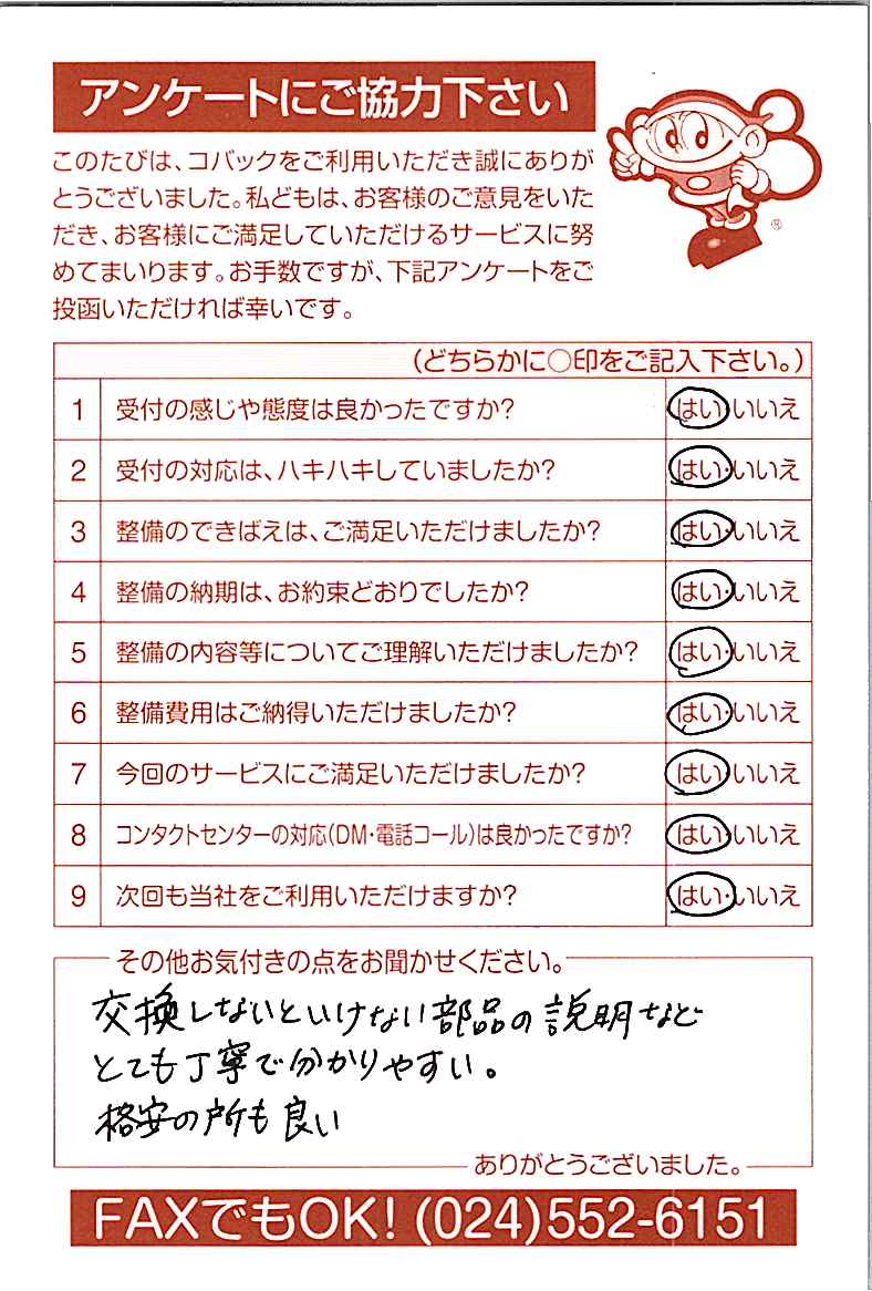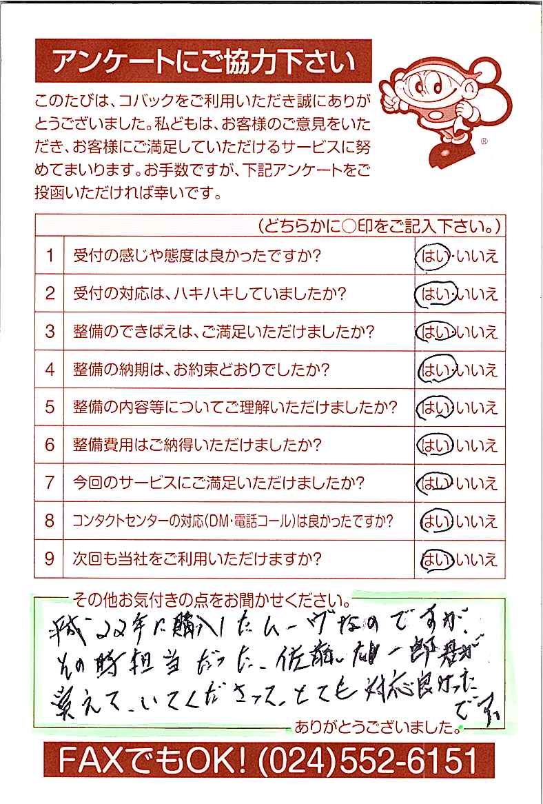 お客様からいただいたアンケートハガキをご紹介いたします。お寄せいただいた貴重なご意見は、今後の大久自動車販売のより良いサービスに繋げて行きたいと思っております。