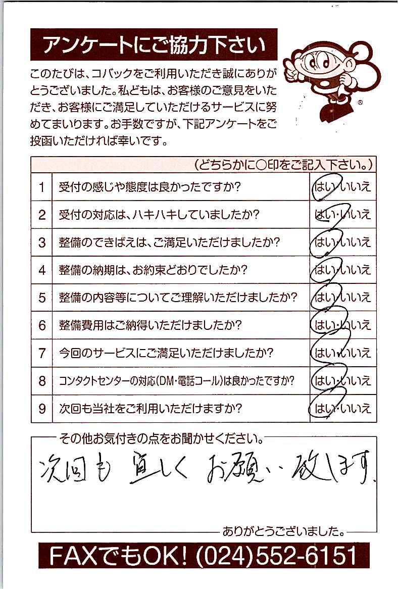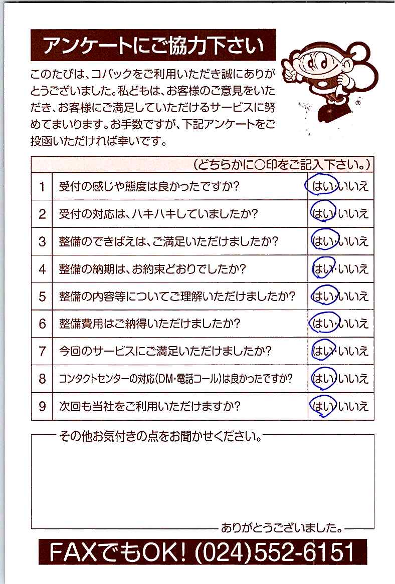 車検のコバック各店をご利用後には、ぜひアンケートのご協力をよろしくお願いいたします。