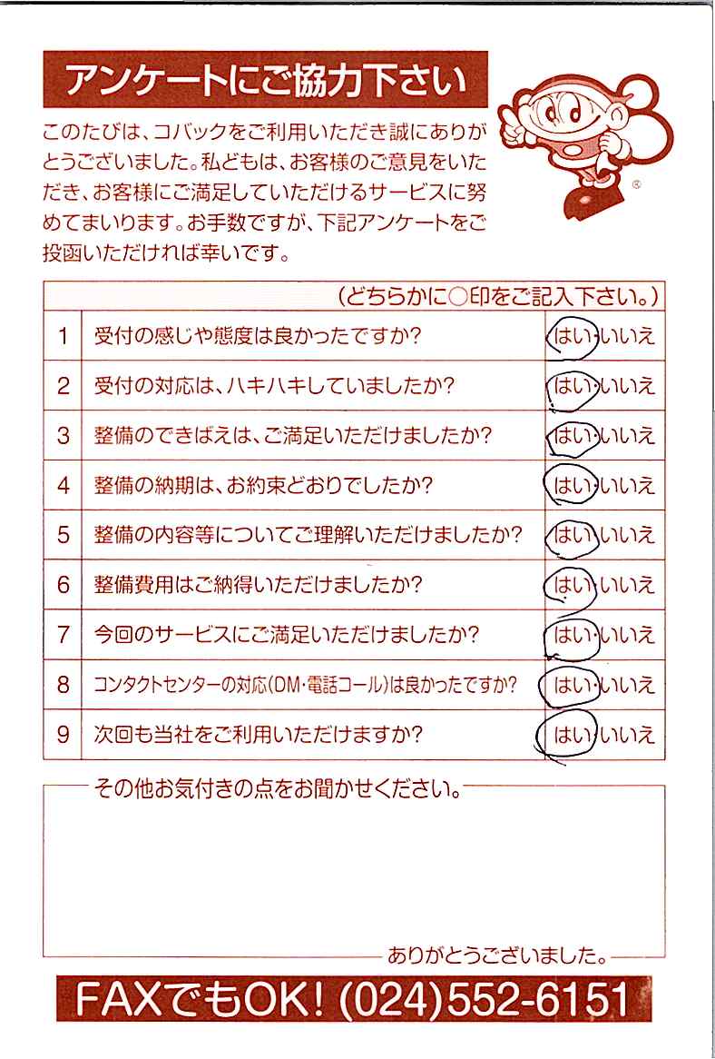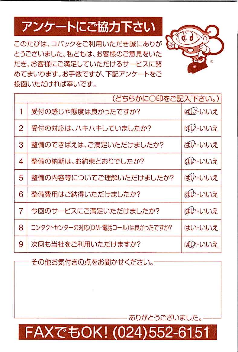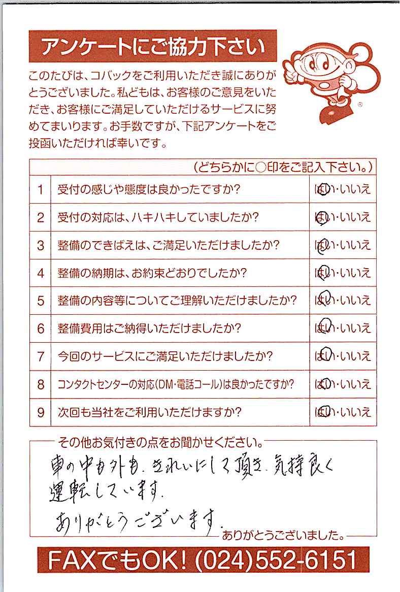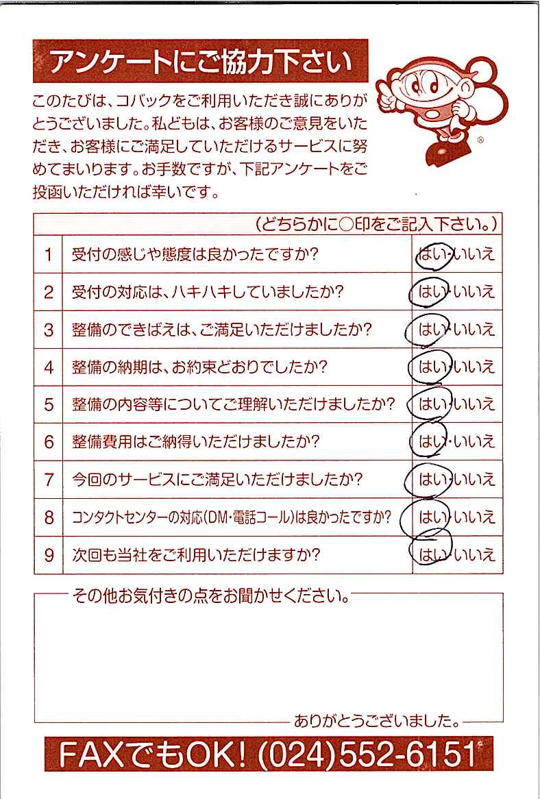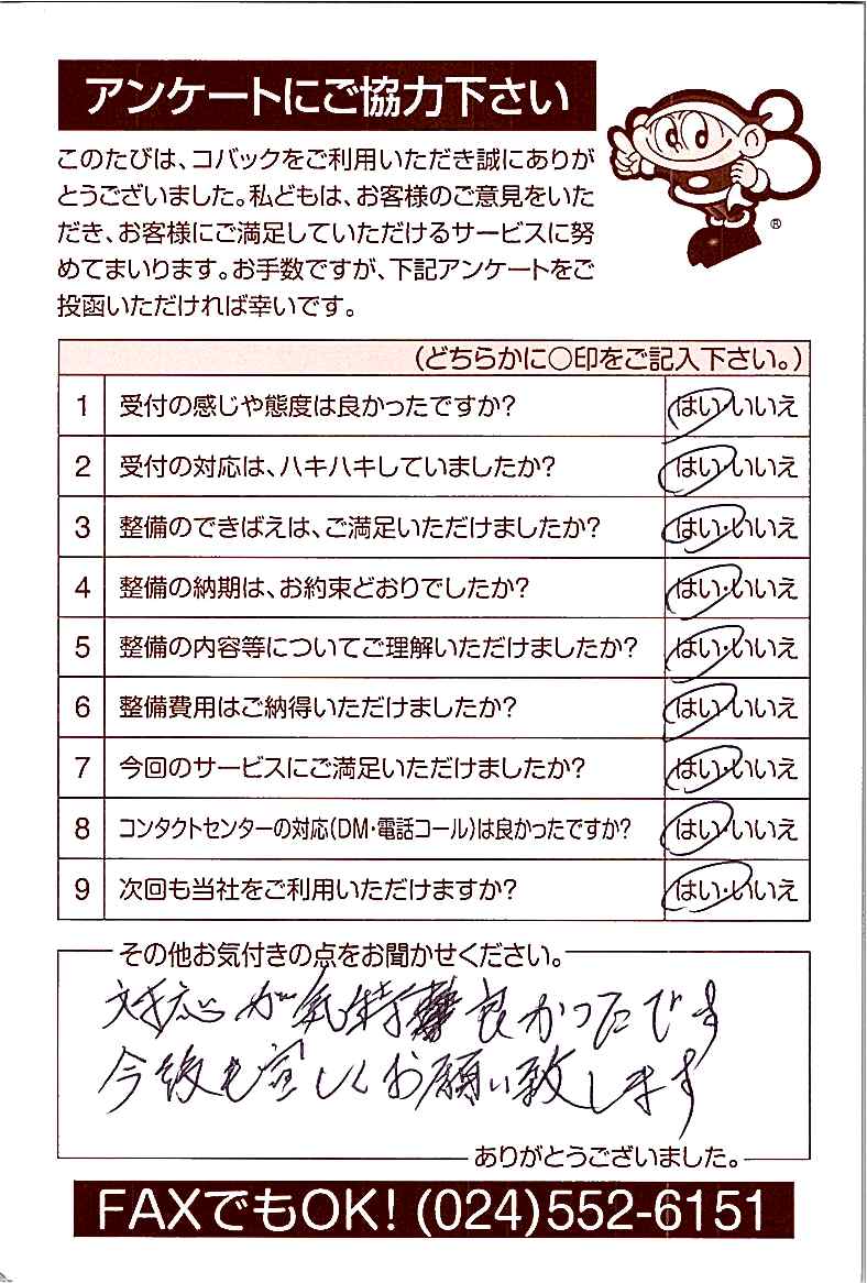 お客様からいただいたアンケートハガキをご紹介いたします。お寄せいただいた貴重なご意見は、今後の大久自動車販売のより良いサービスに繋げて行きたいと思っております。