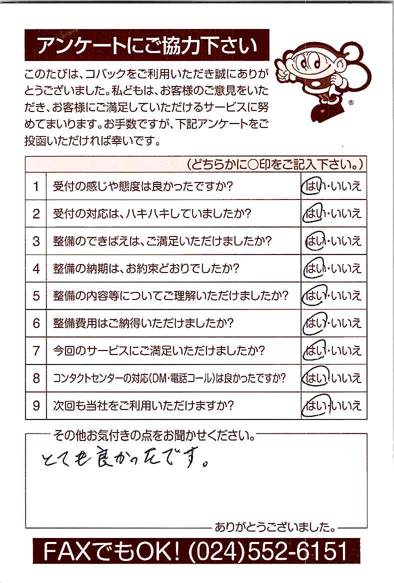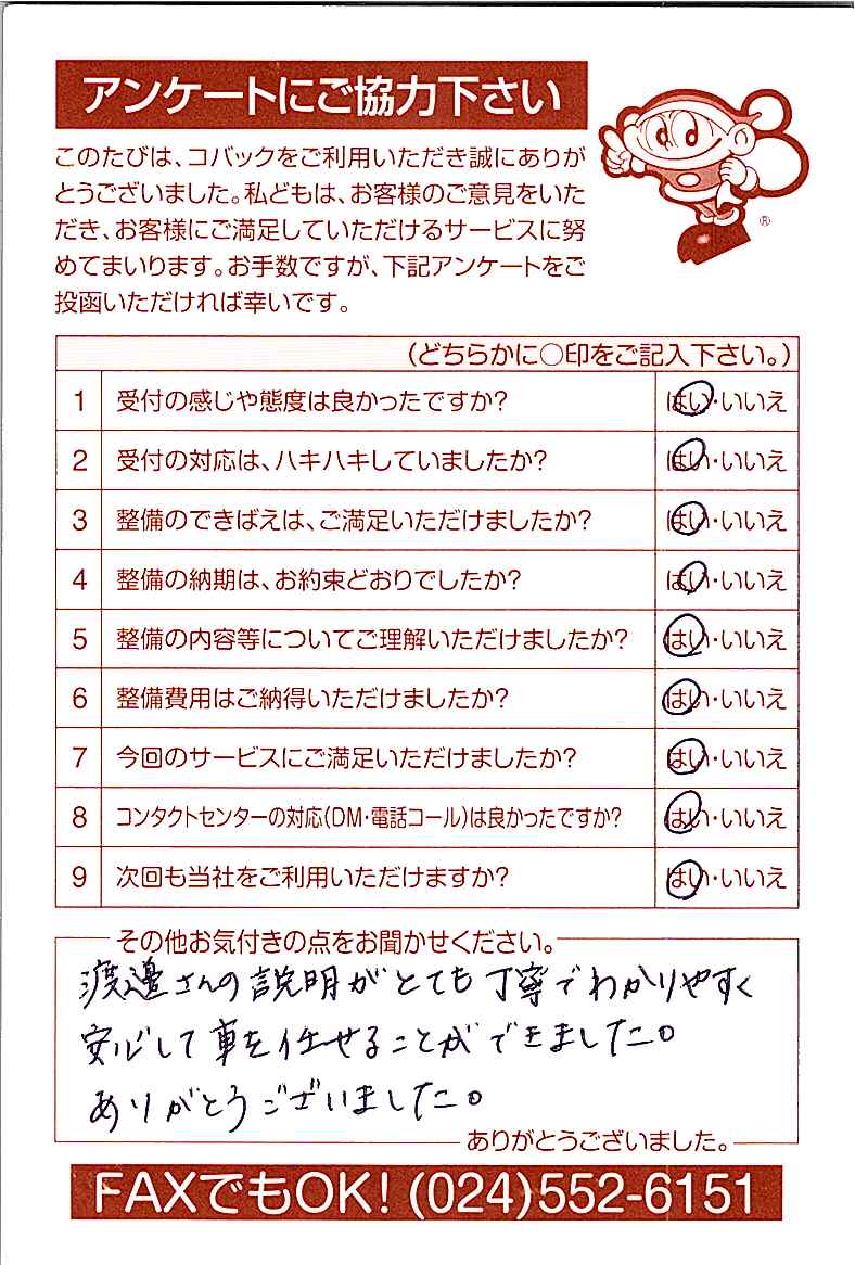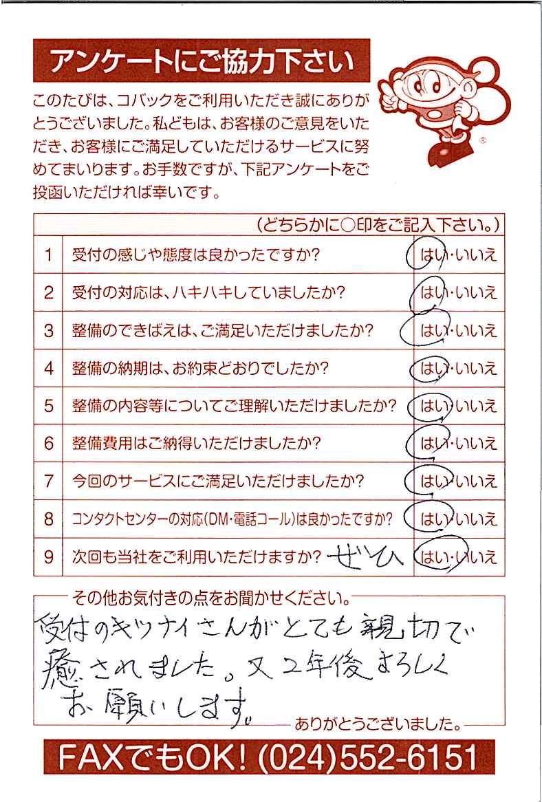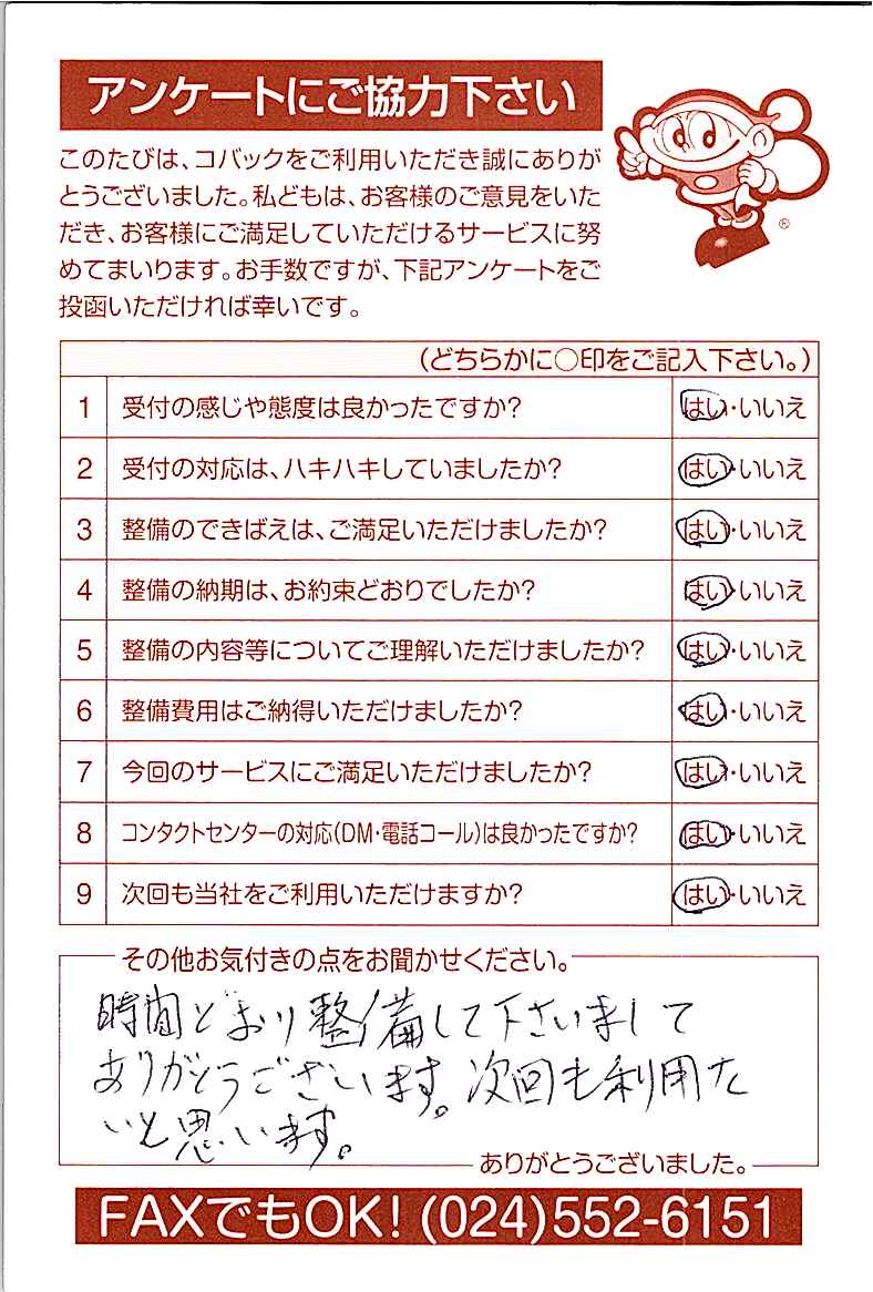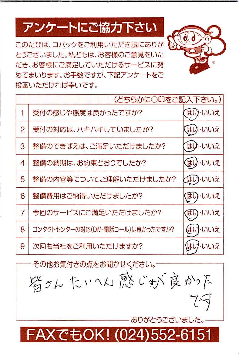 お客様からいただいたアンケートハガキをご紹介いたします。お寄せいただいた貴重なご意見は、今後の大久自動車販売のより良いサービスに繋げて行きたいと思っております。