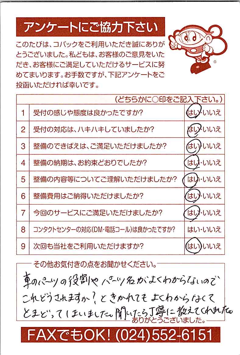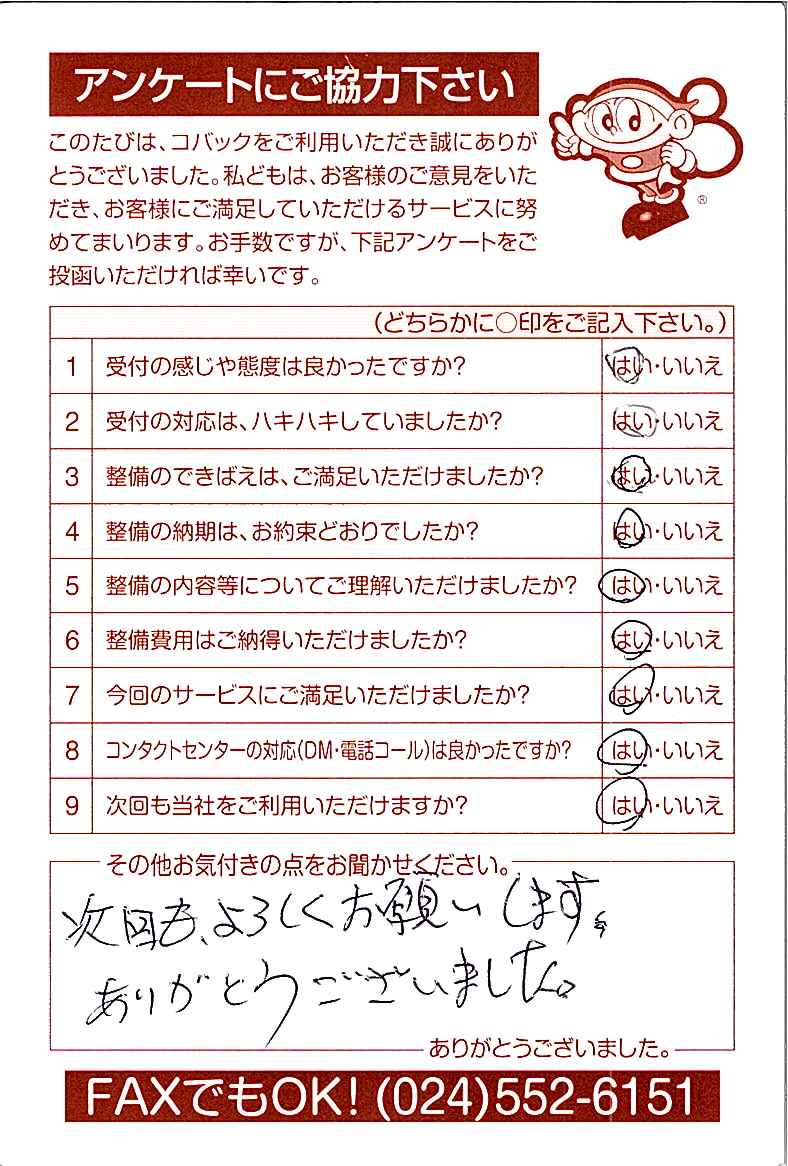 車検のコバック各店をご利用後には、ぜひアンケートのご協力をよろしくお願いいたします。