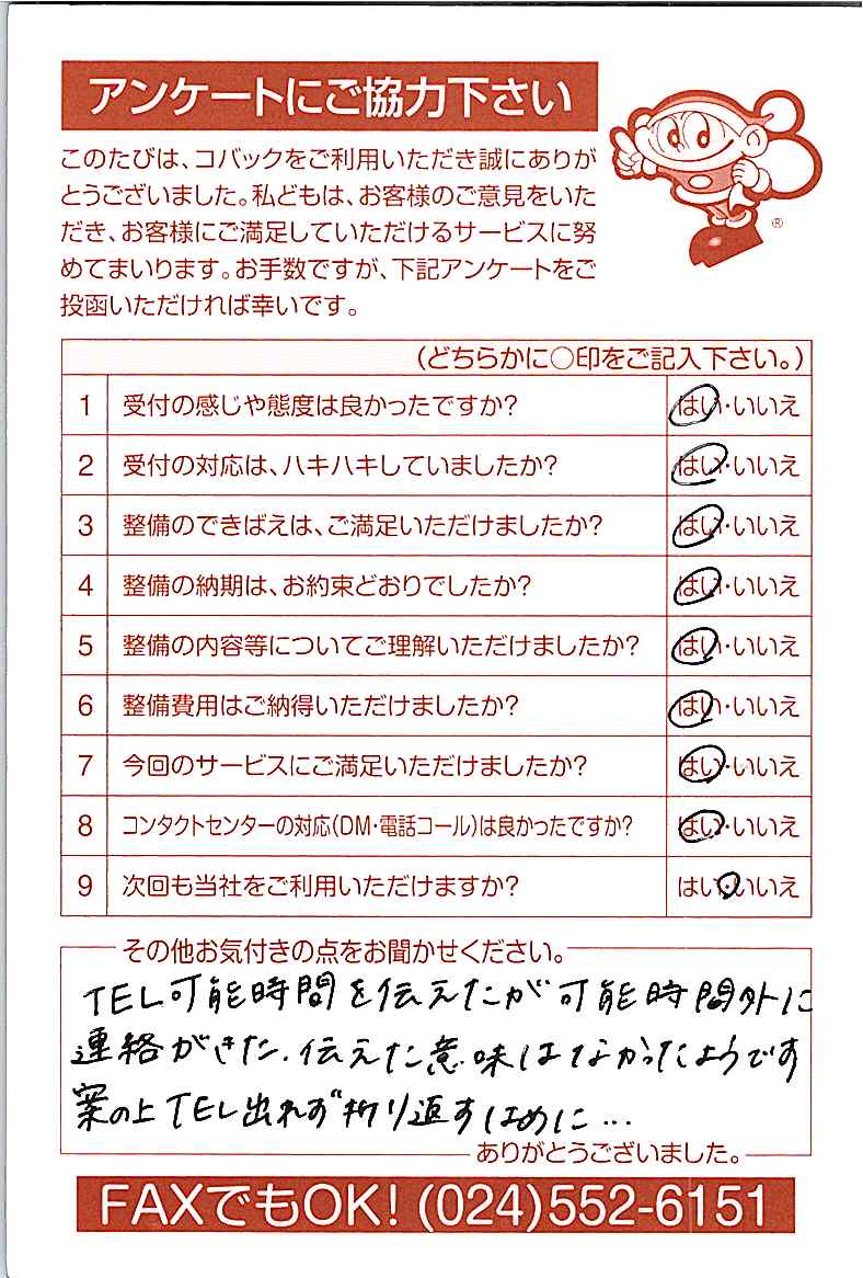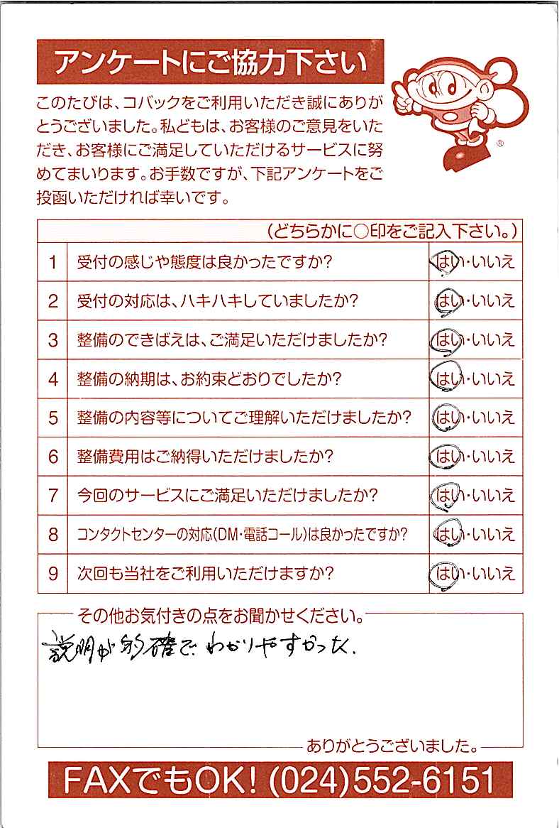 お客様からいただいたアンケートハガキをご紹介いたします。お寄せいただいた貴重なご意見は、今後の大久自動車販売のより良いサービスに繋げて行きたいと思っております。