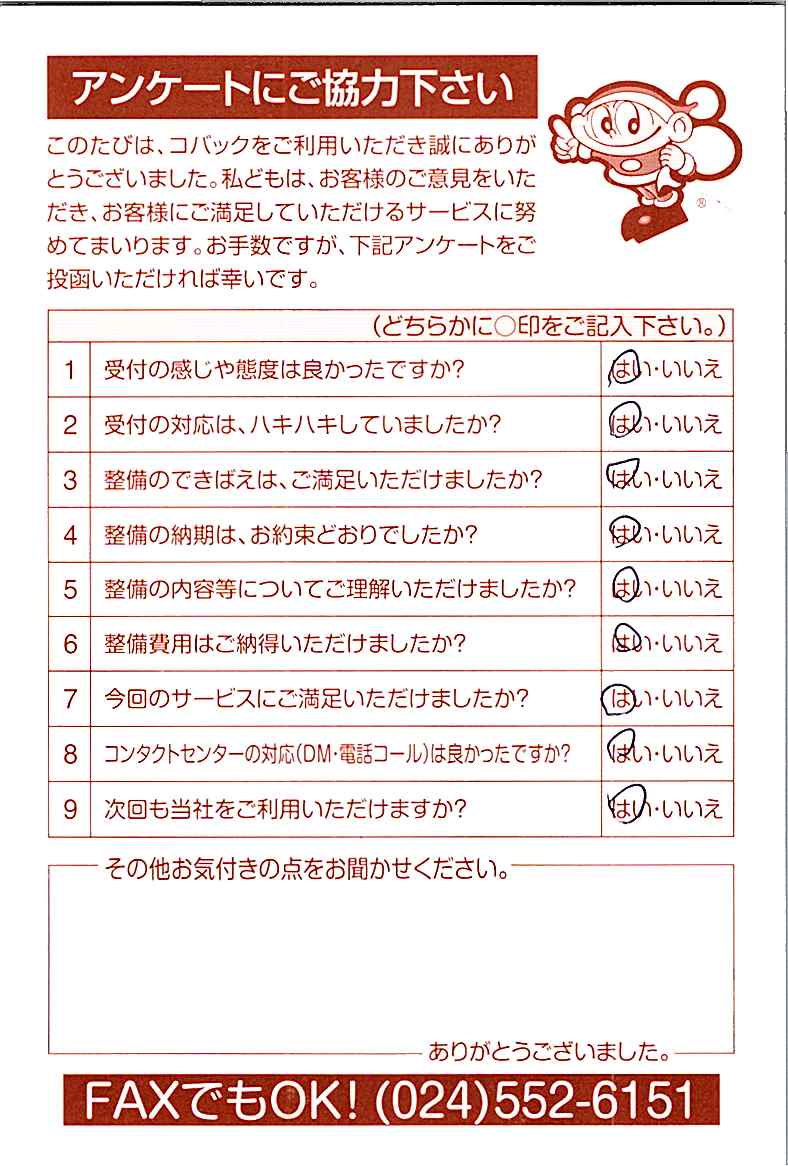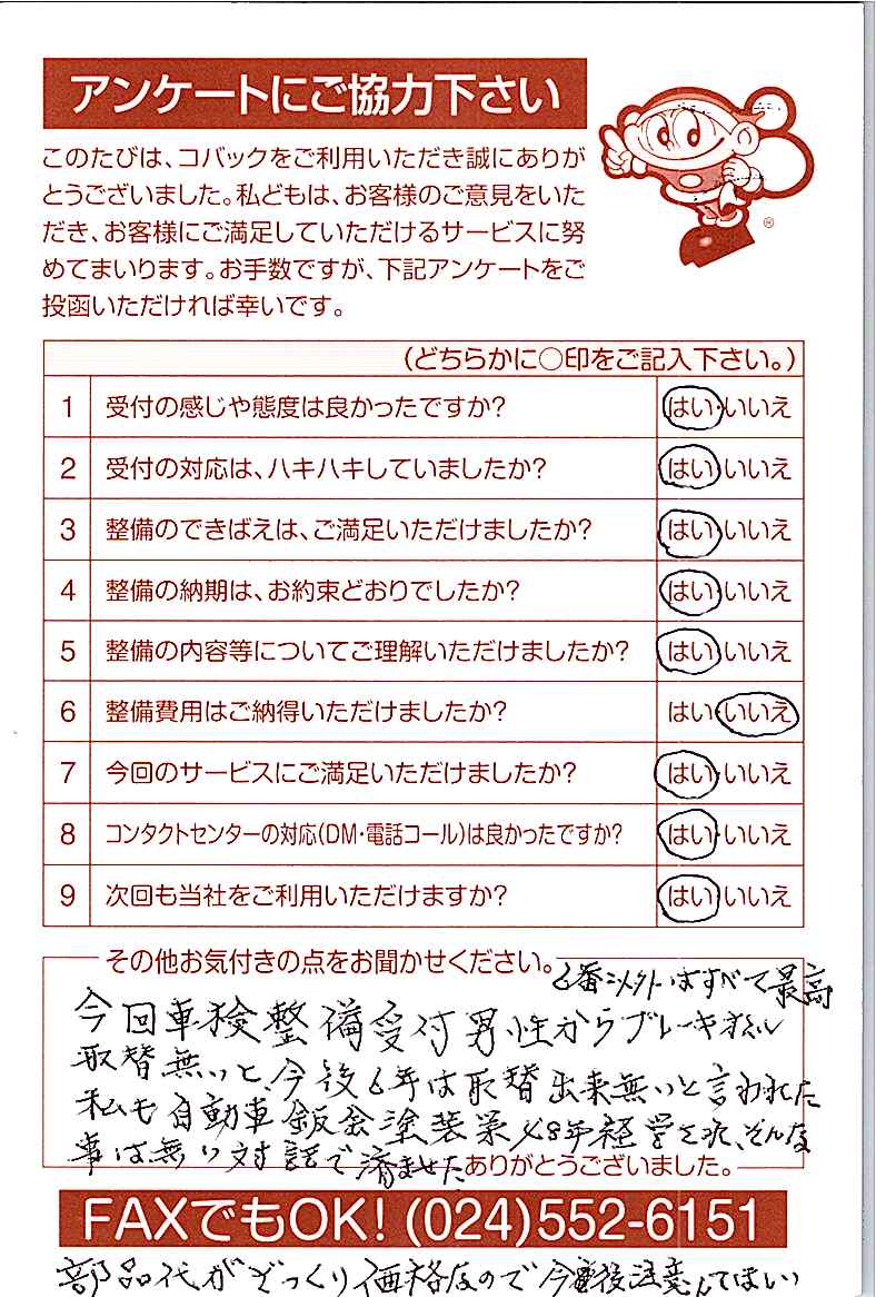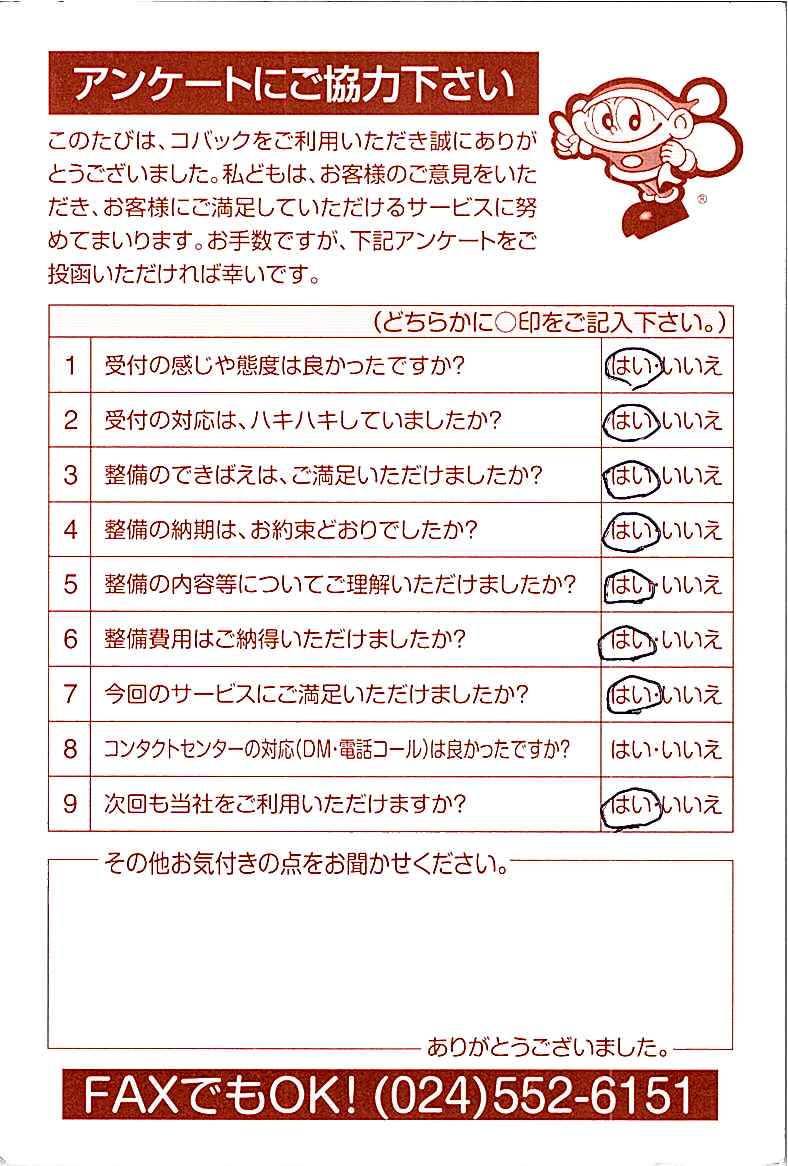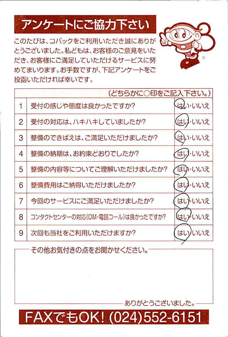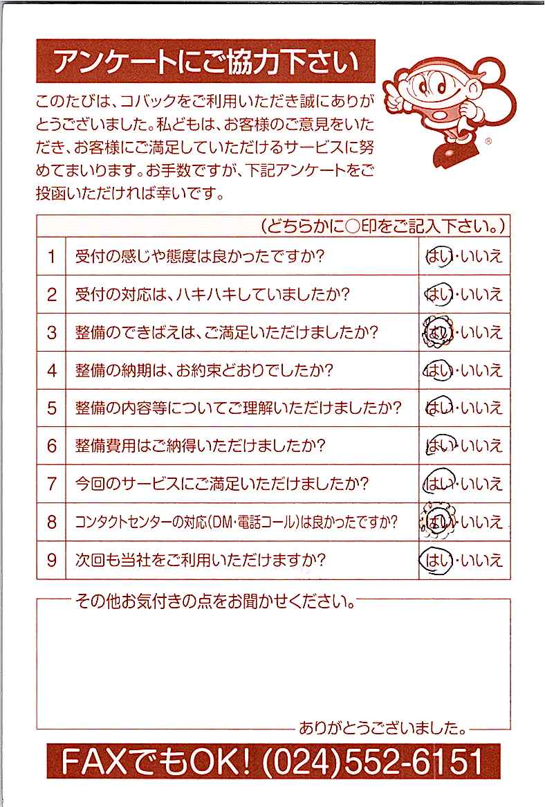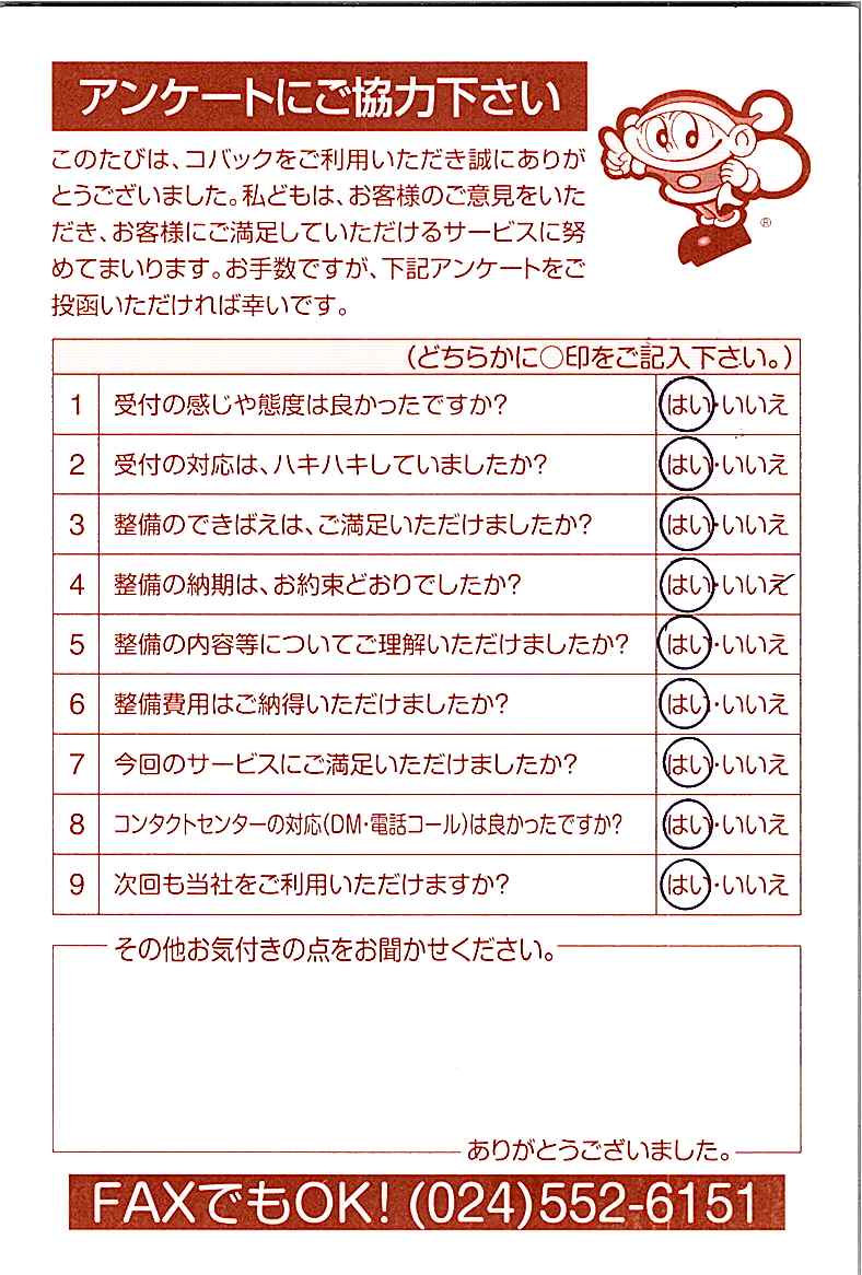 車検のコバック各店をご利用後には、ぜひアンケートのご協力をよろしくお願いいたします。