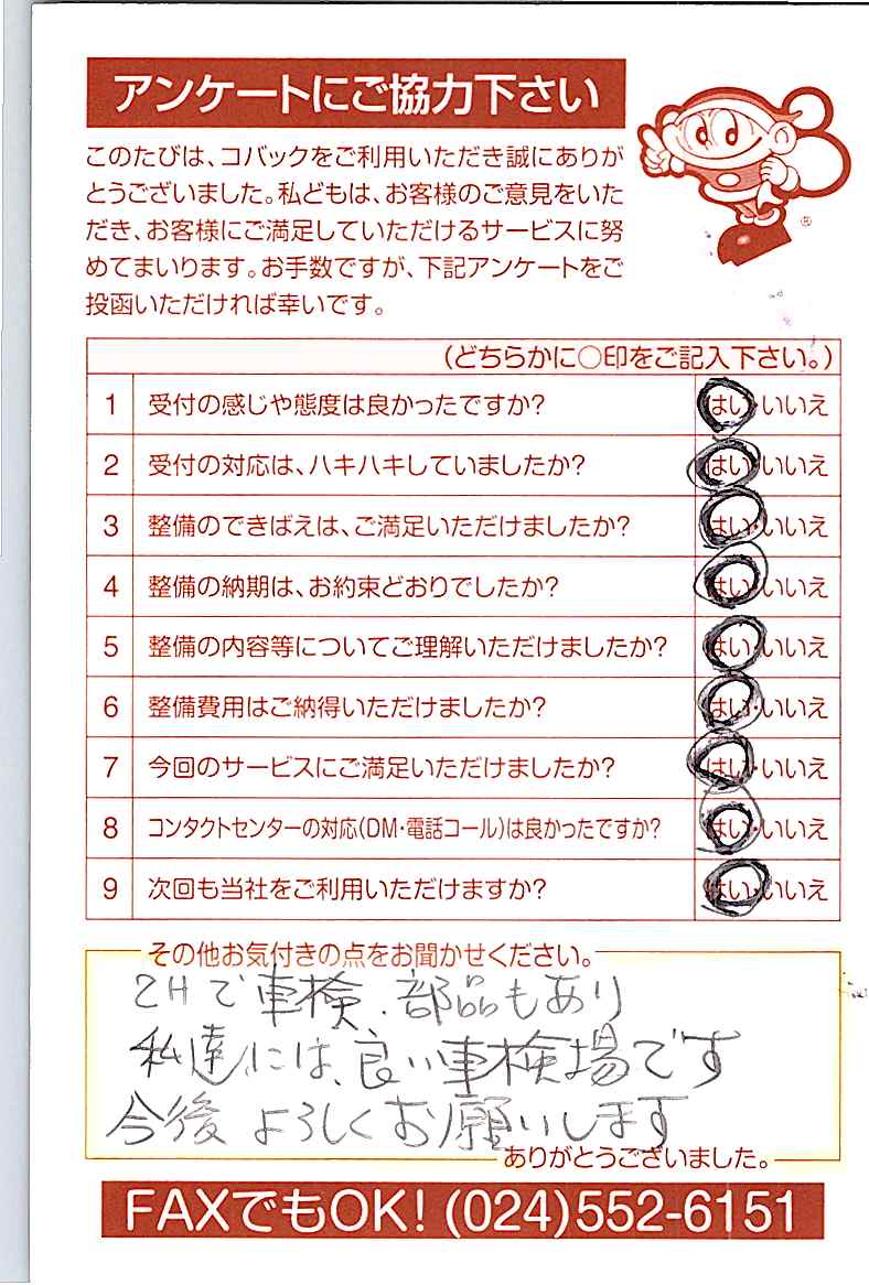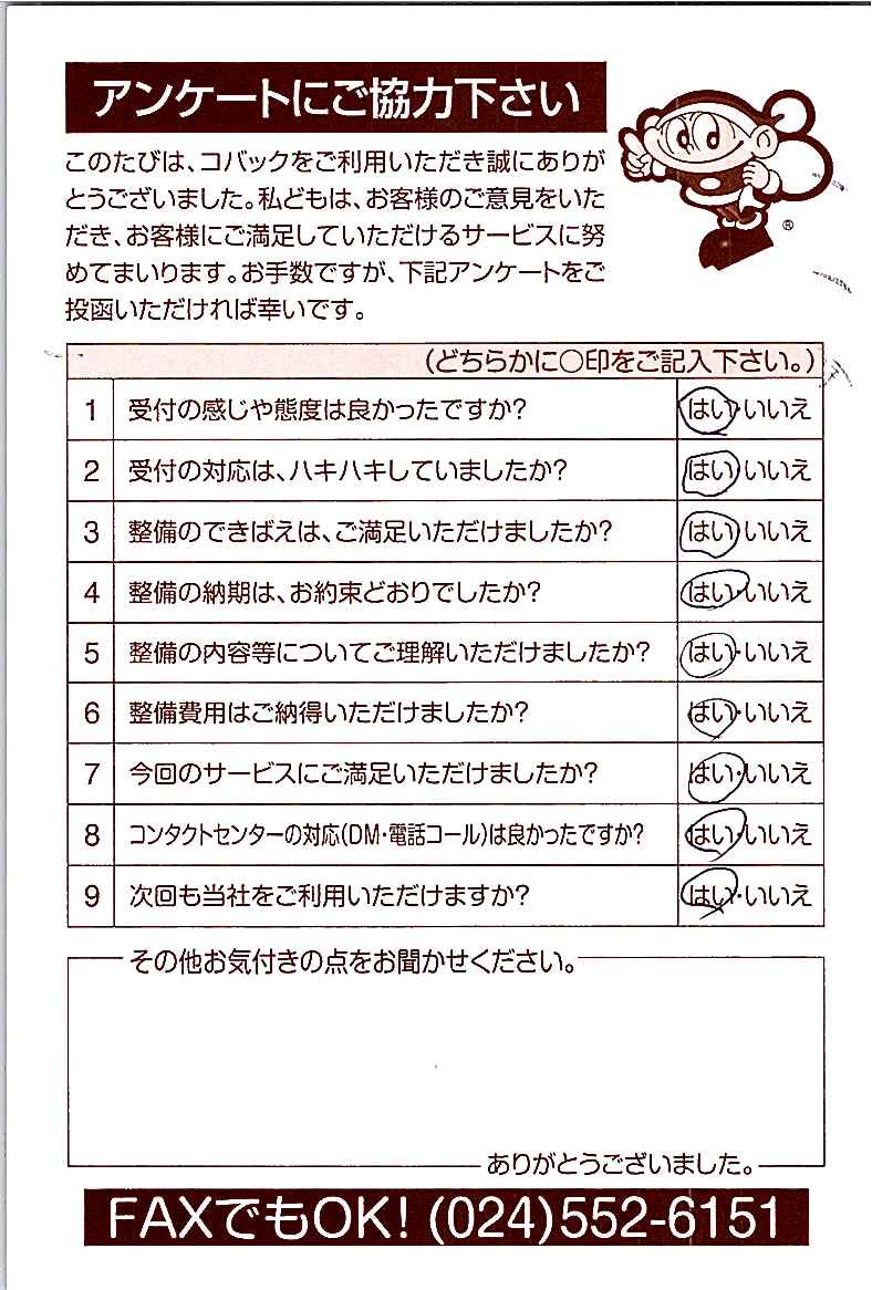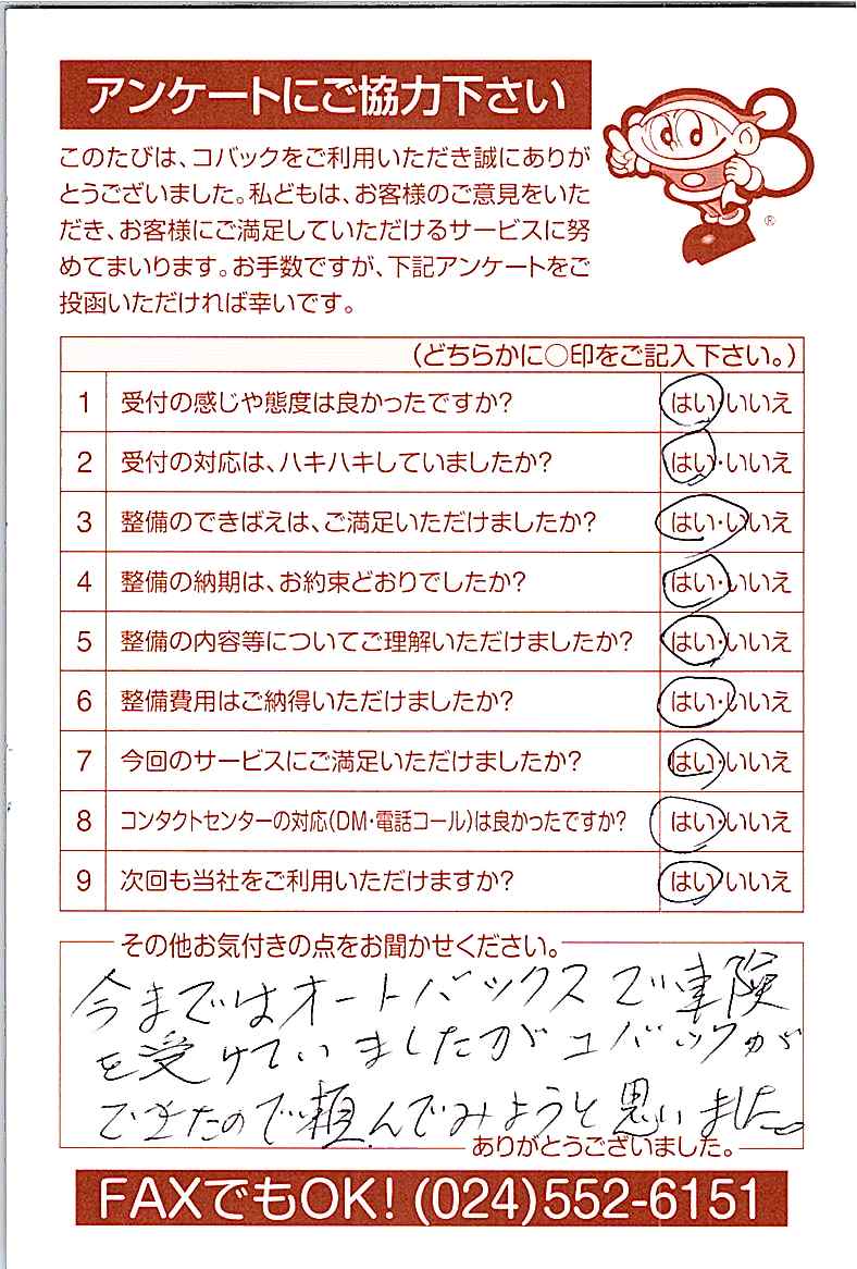 車検のコバック各店をご利用後には、ぜひアンケートのご協力をよろしくお願いいたします。