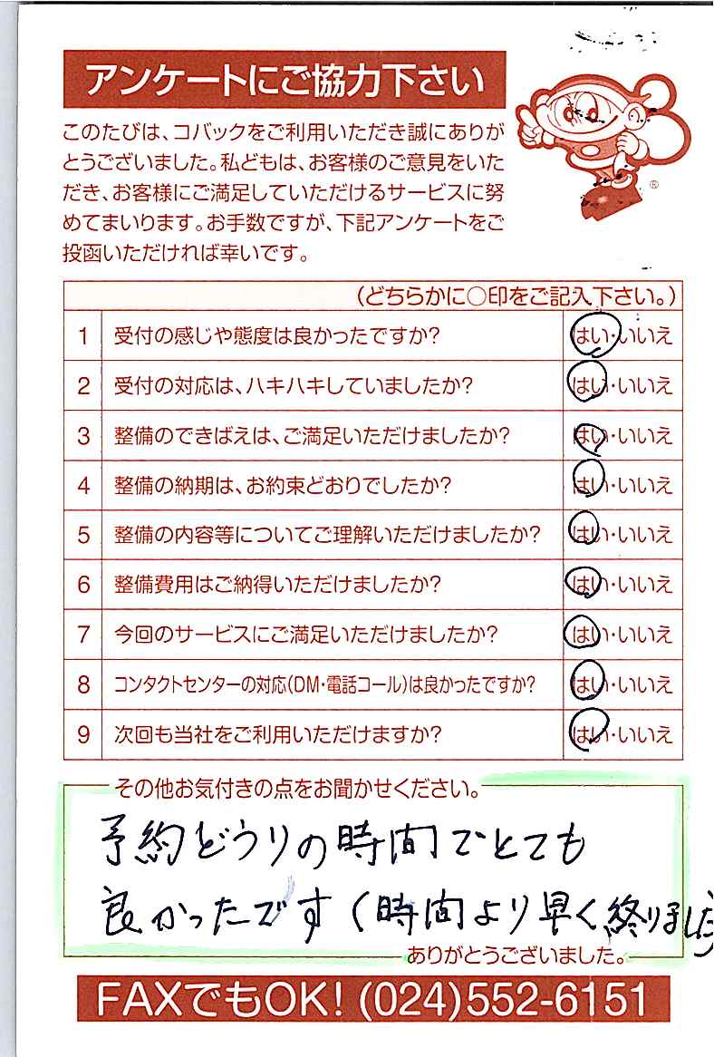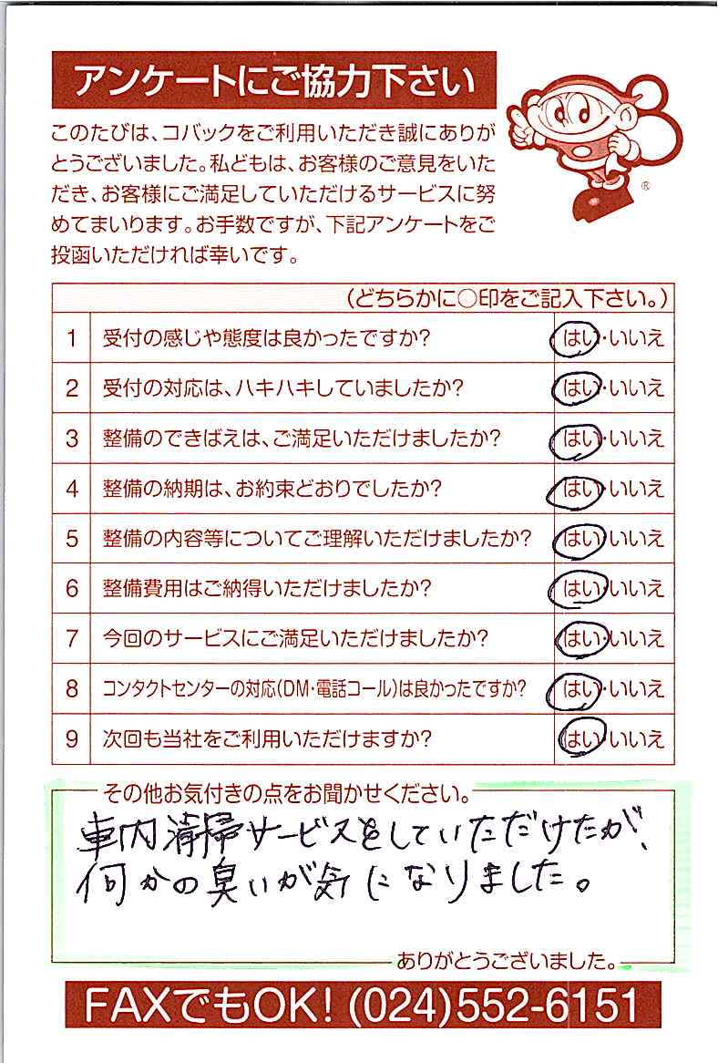お客様からいただいたアンケートハガキをご紹介いたします。お寄せいただいた貴重なご意見は、今後の大久自動車販売のより良いサービスに繋げて行きたいと思っております。