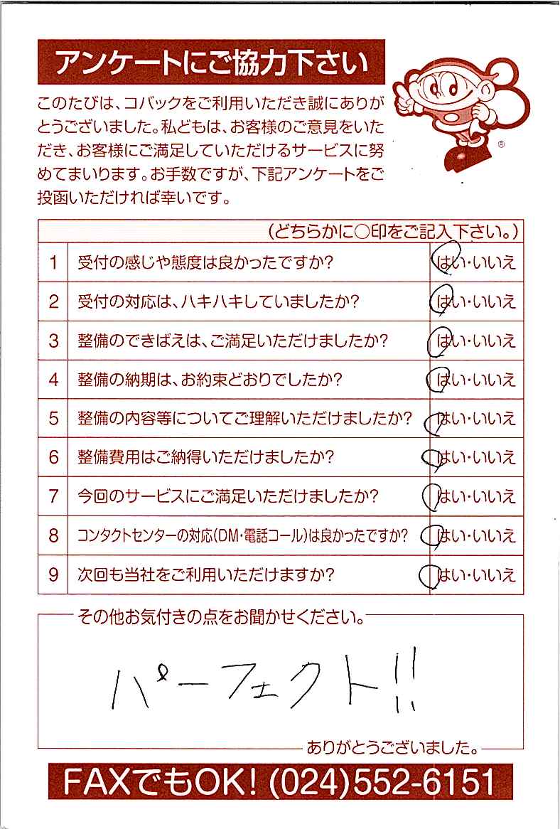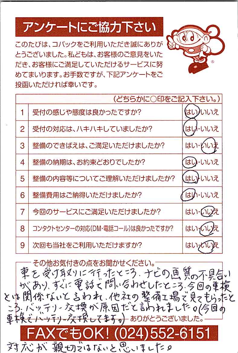 お客様からいただいたアンケートハガキをご紹介いたします。お寄せいただいた貴重なご意見は、今後の大久自動車販売のより良いサービスに繋げて行きたいと思っております。