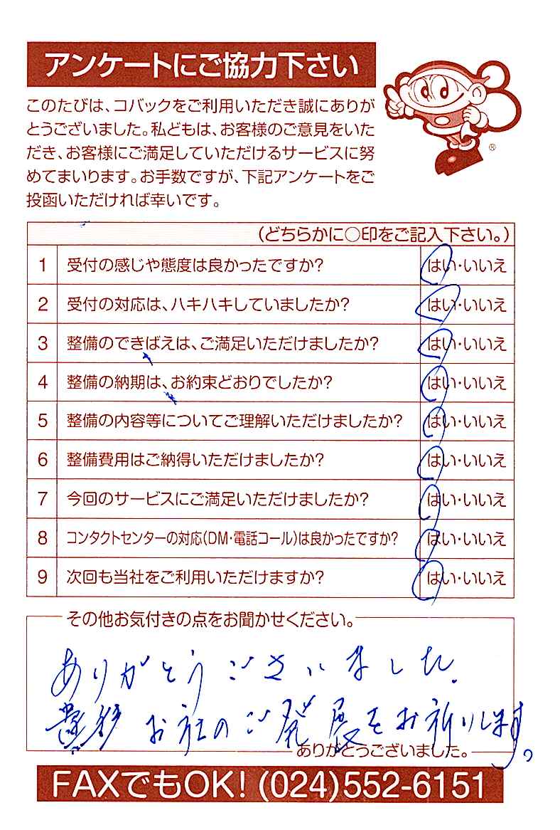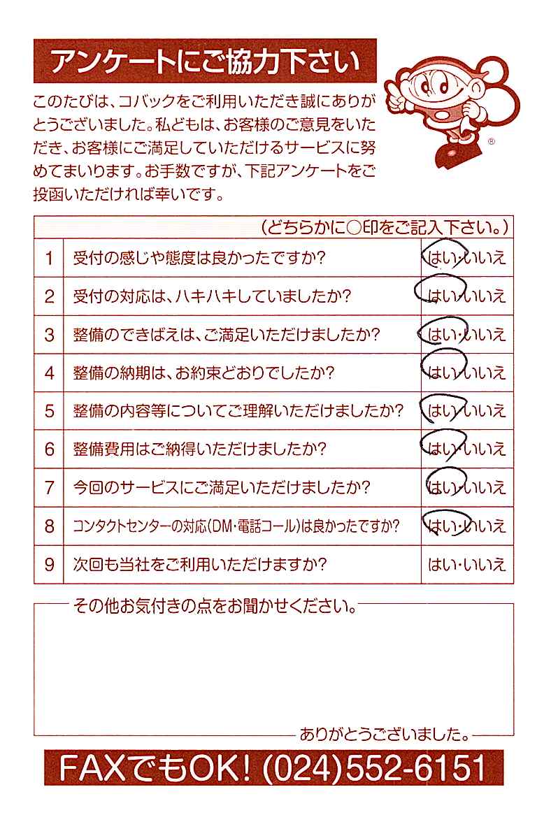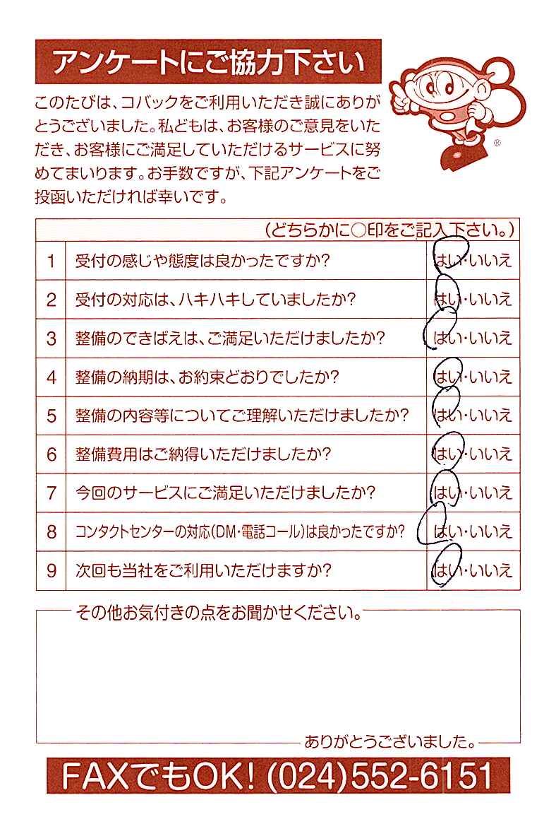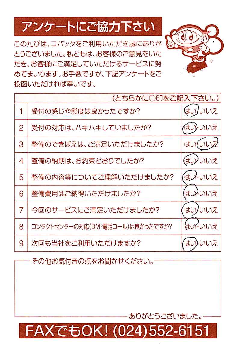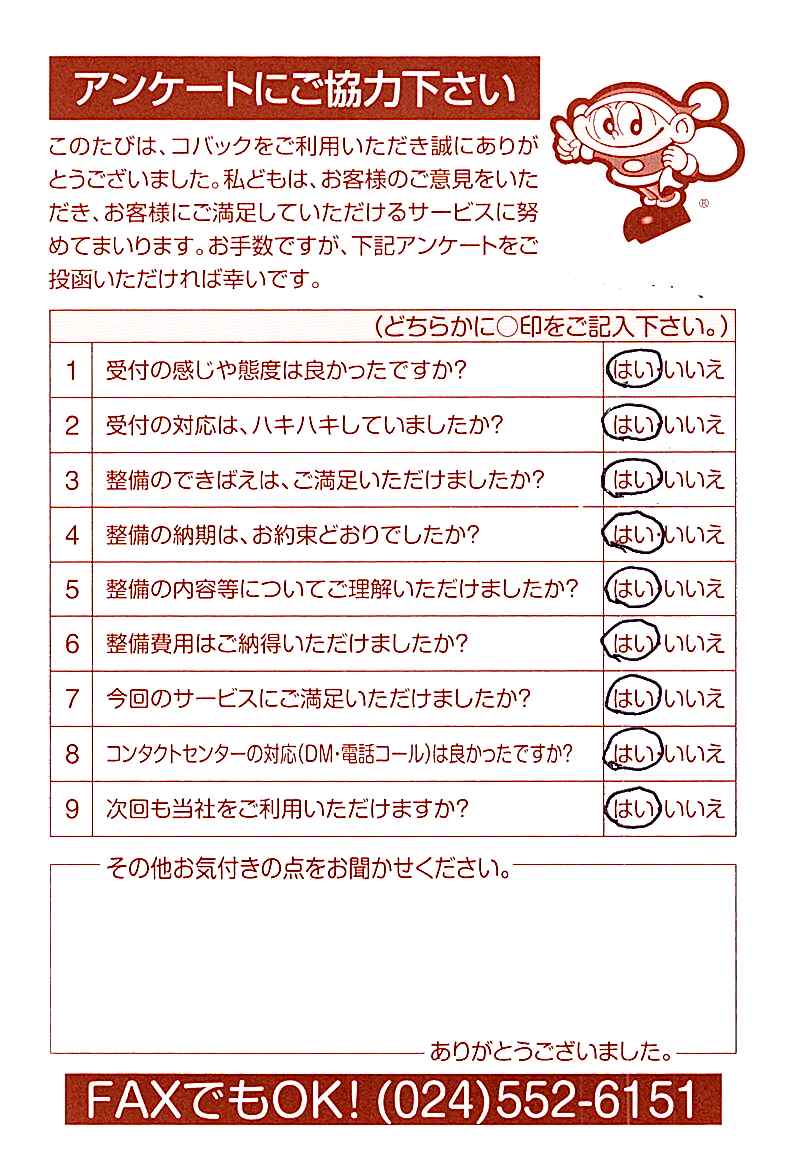 お客様からいただいたアンケートハガキをご紹介いたします。お寄せいただいた貴重なご意見は、今後の大久自動車販売のより良いサービスに繋げて行きたいと思っております。