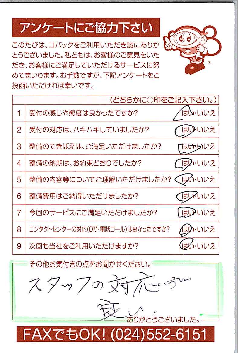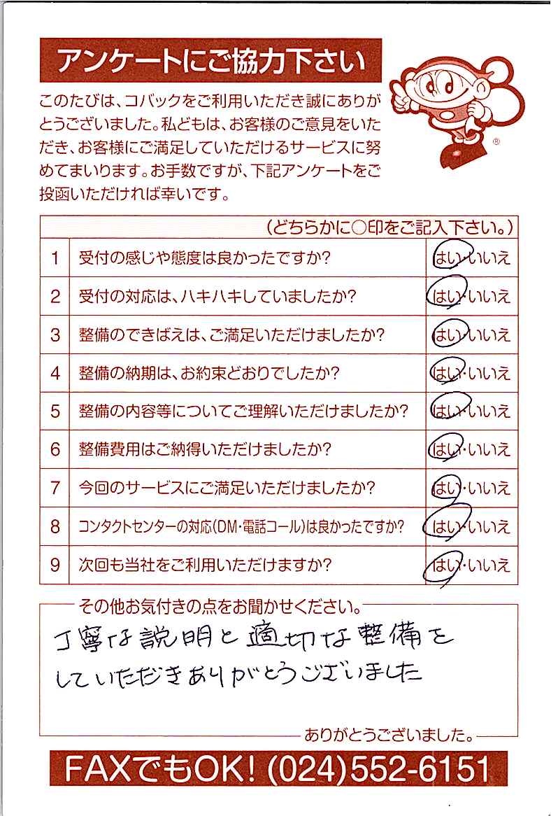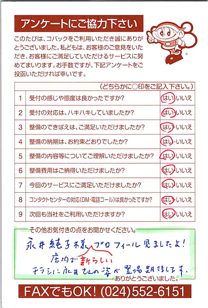 お客様からいただいたアンケートハガキをご紹介いたします。お寄せいただいた貴重なご意見は、今後の大久自動車販売のより良いサービスに繋げて行きたいと思っております。