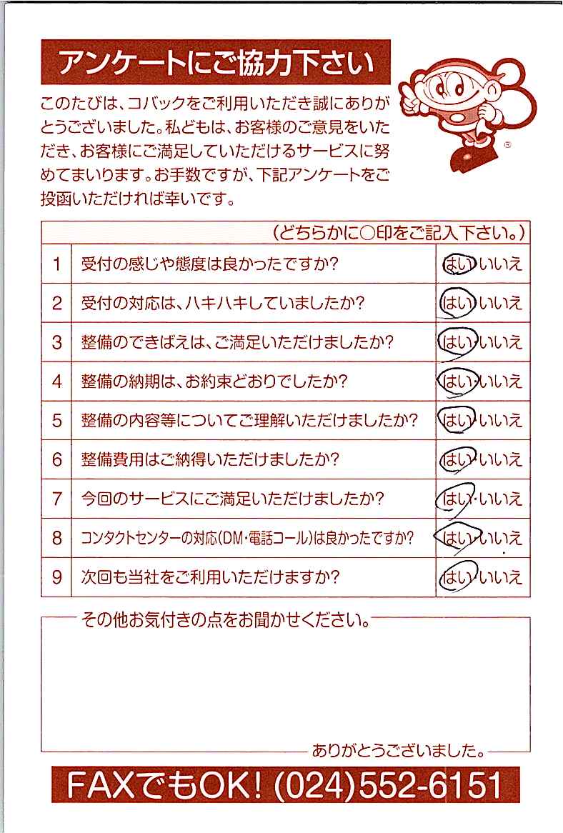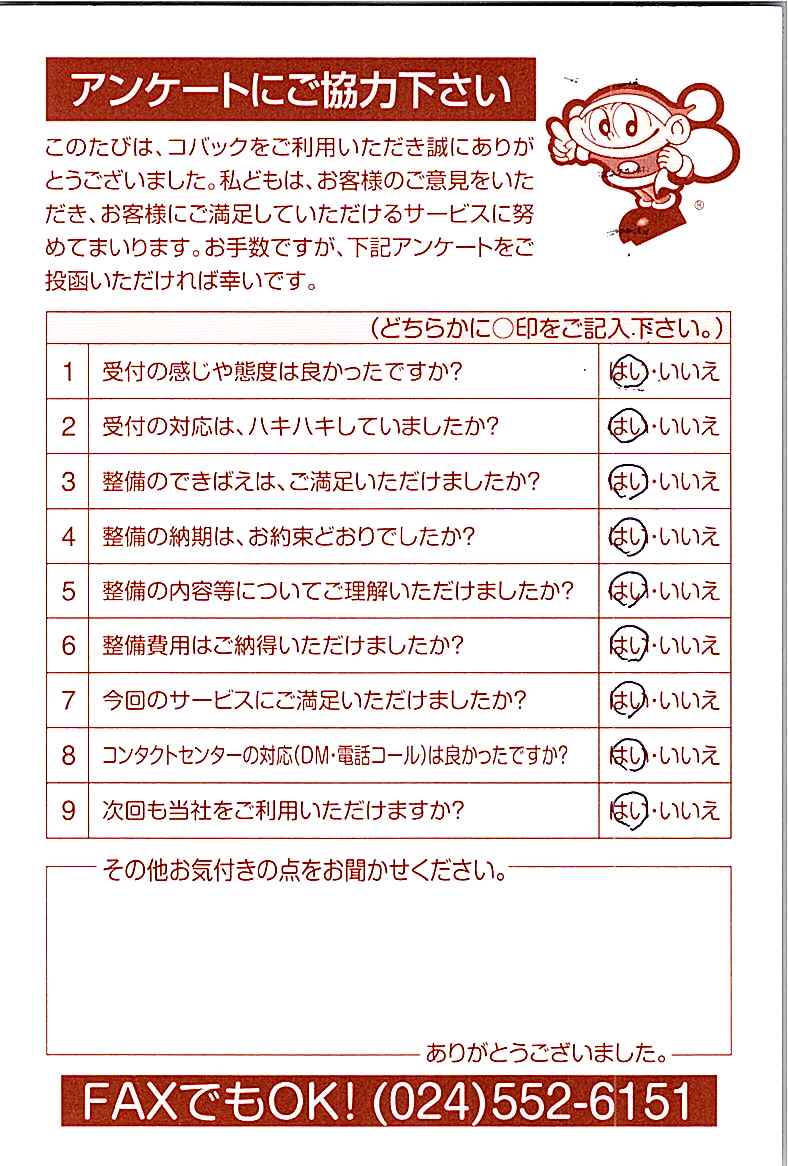 車検のコバック各店をご利用後には、ぜひアンケートのご協力をよろしくお願いいたします。