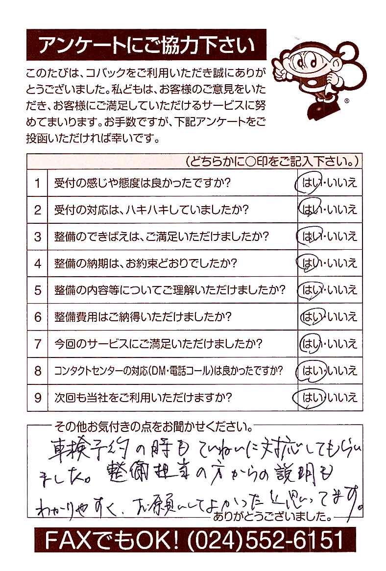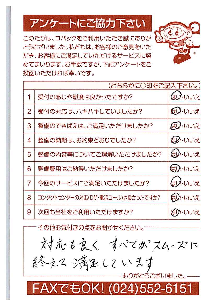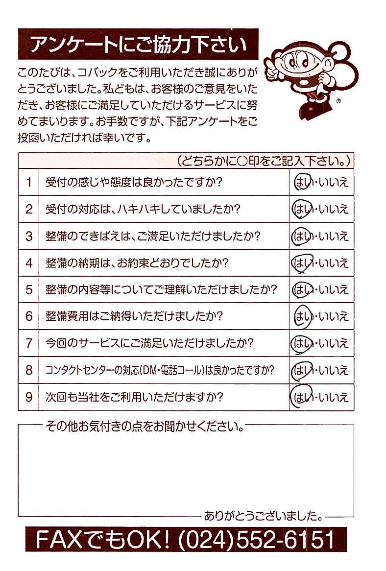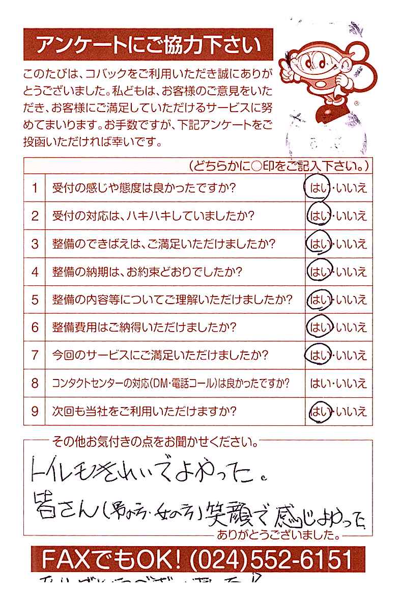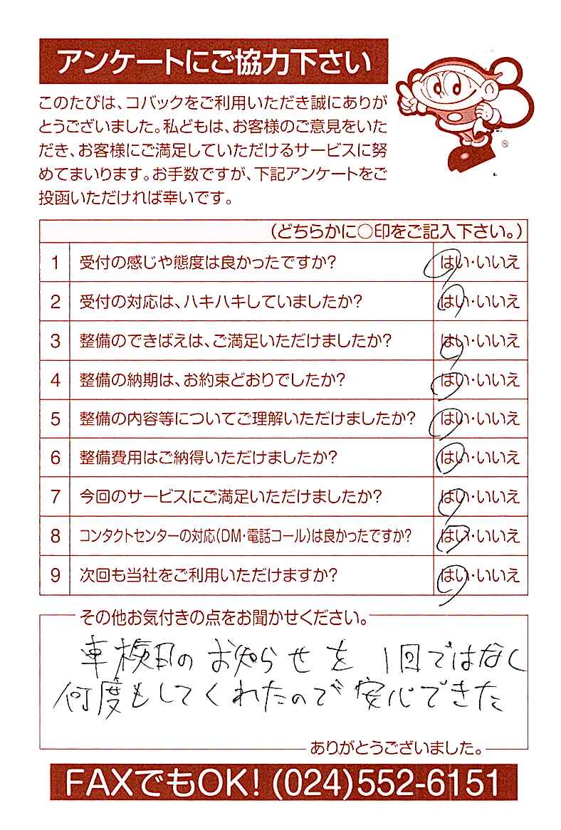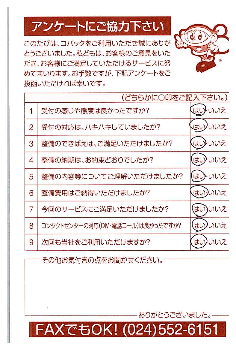 お客様からいただいたアンケートハガキをご紹介いたします。お寄せいただいた貴重なご意見は、今後の大久自動車販売のより良いサービスに繋げて行きたいと思っております。