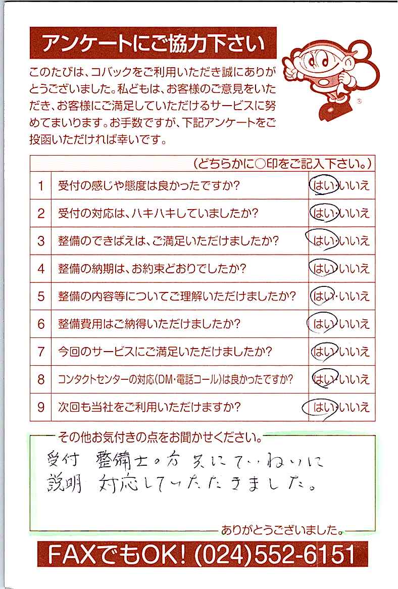 お客様からいただいたアンケートハガキをご紹介いたします。お寄せいただいた貴重なご意見は、今後の大久自動車販売のより良いサービスに繋げて行きたいと思っております。