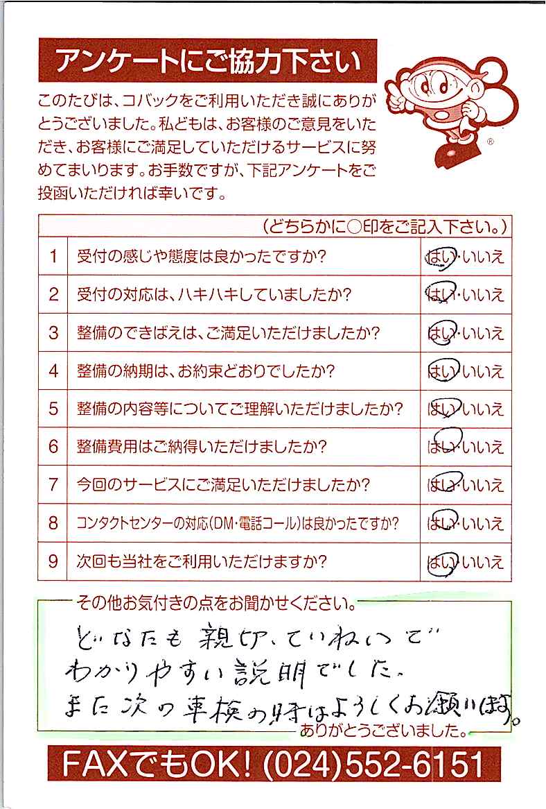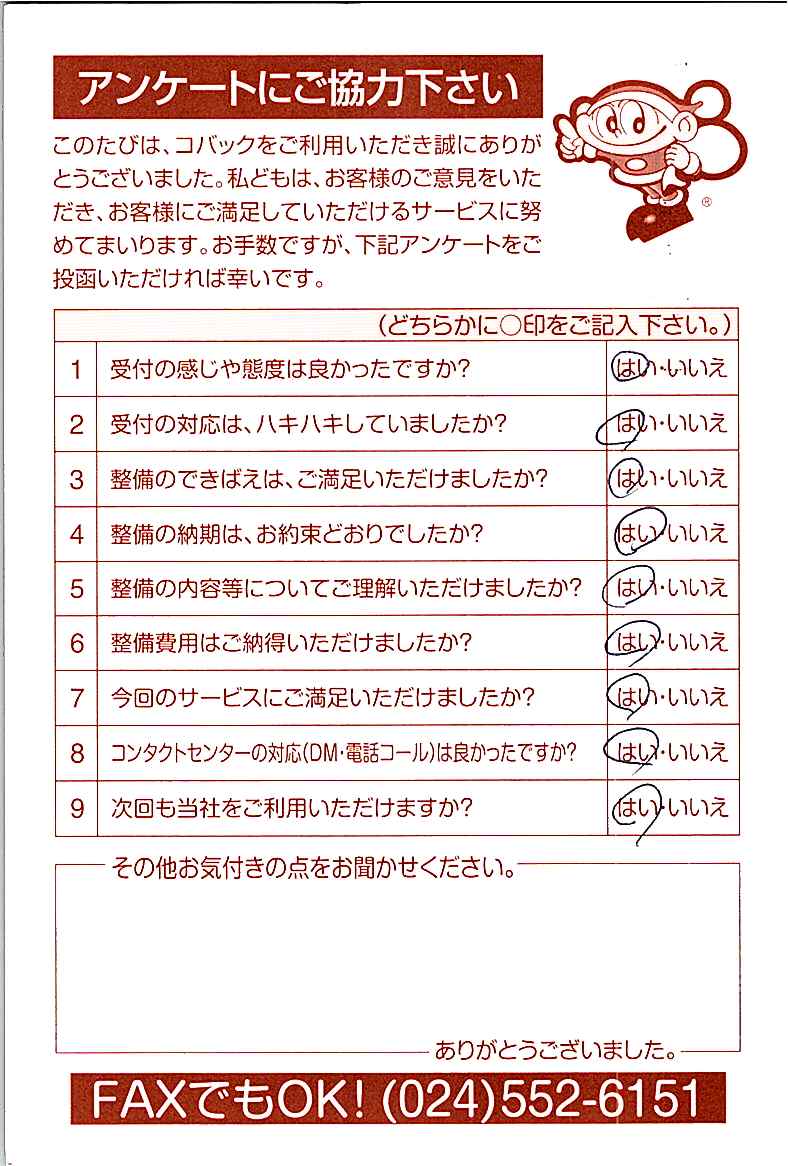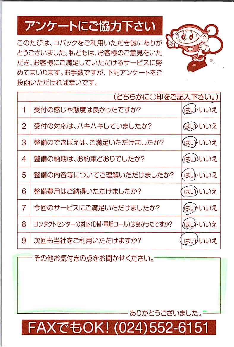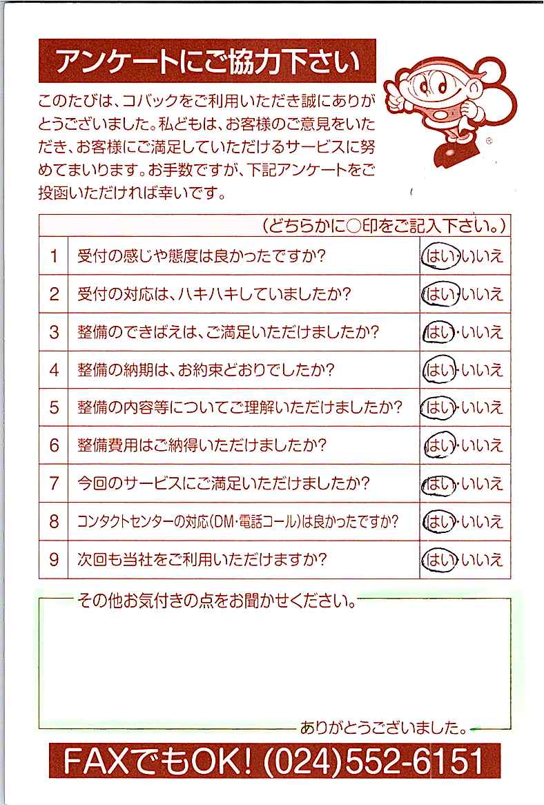 車検のコバック各店をご利用後には、ぜひアンケートのご協力をよろしくお願いいたします。