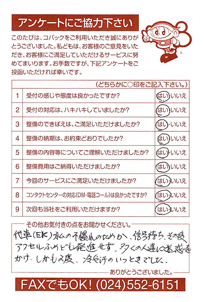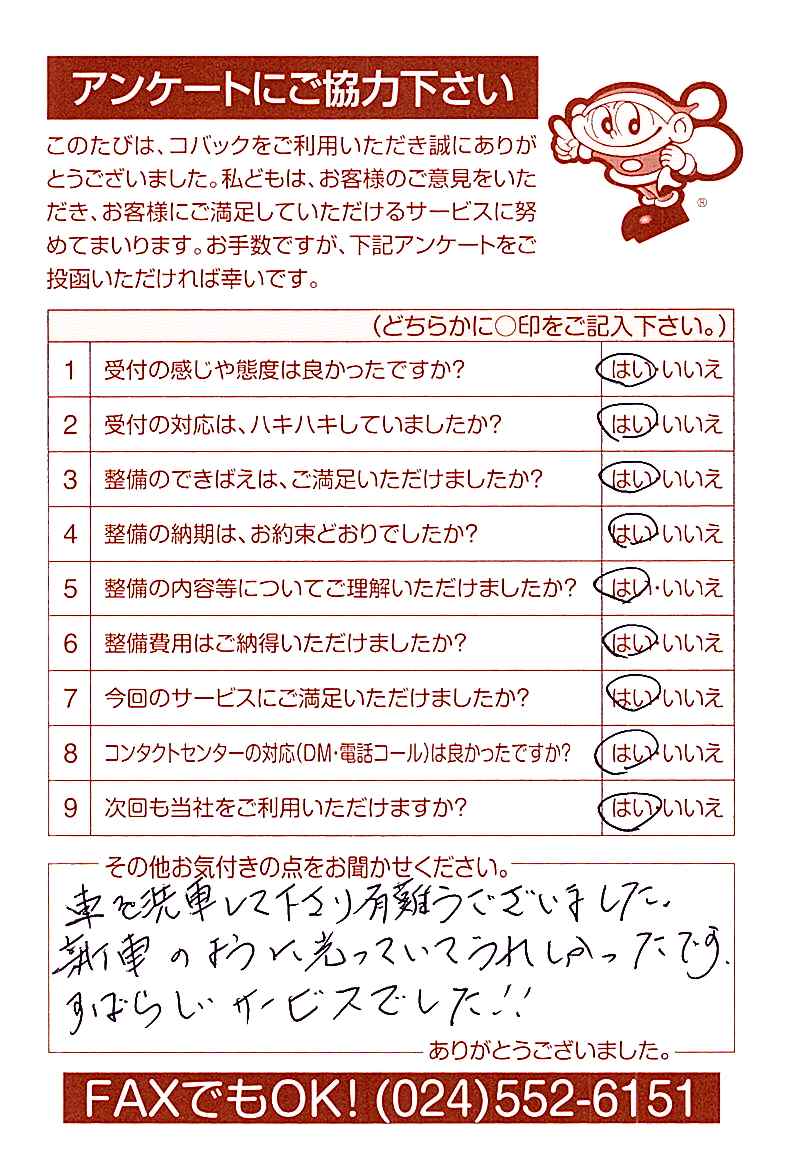 お客様からいただいたアンケートハガキをご紹介いたします。お寄せいただいた貴重なご意見は、今後の大久自動車販売のより良いサービスに繋げて行きたいと思っております。