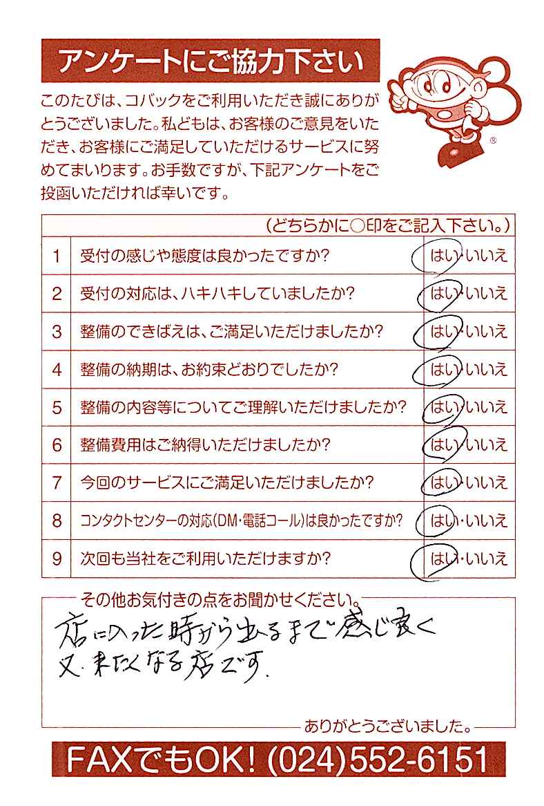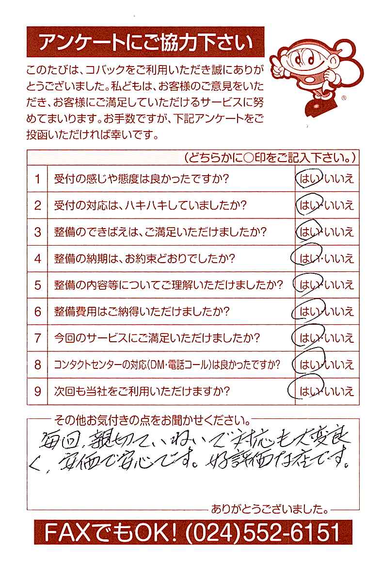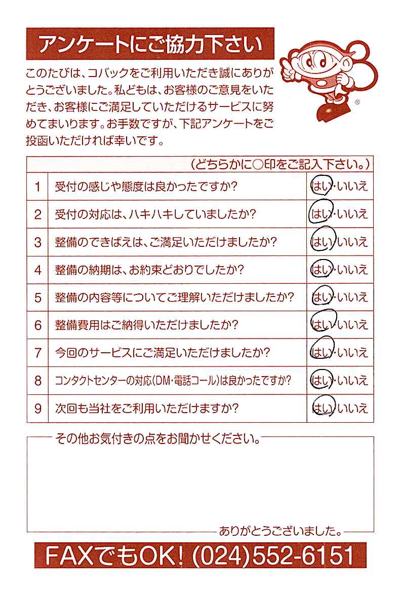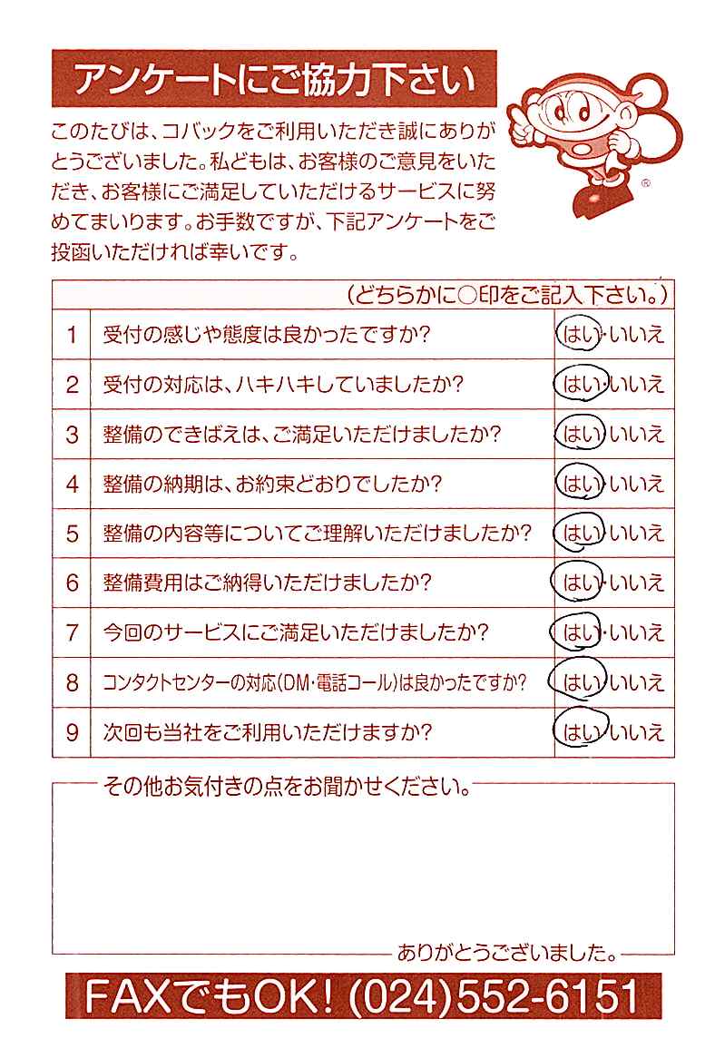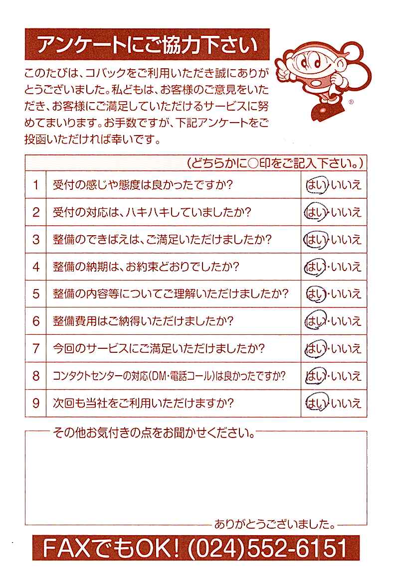 車検のコバック各店をご利用後には、ぜひアンケートのご協力をよろしくお願いいたします。