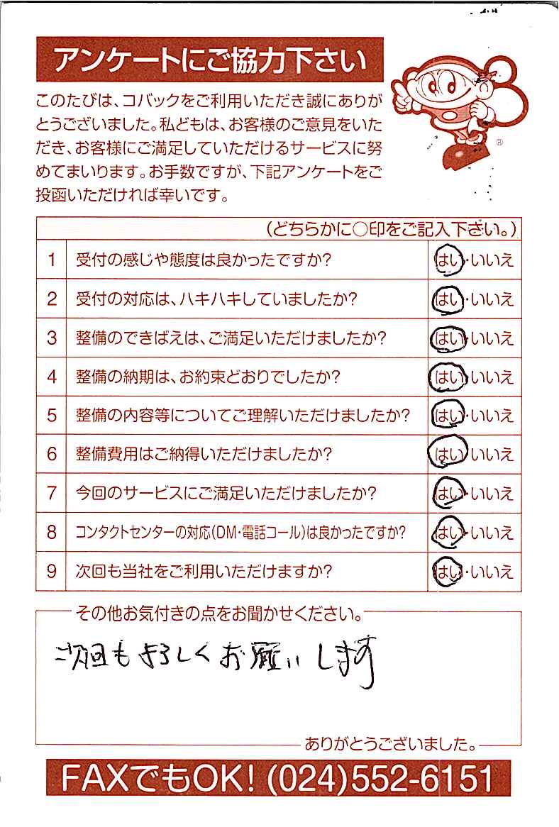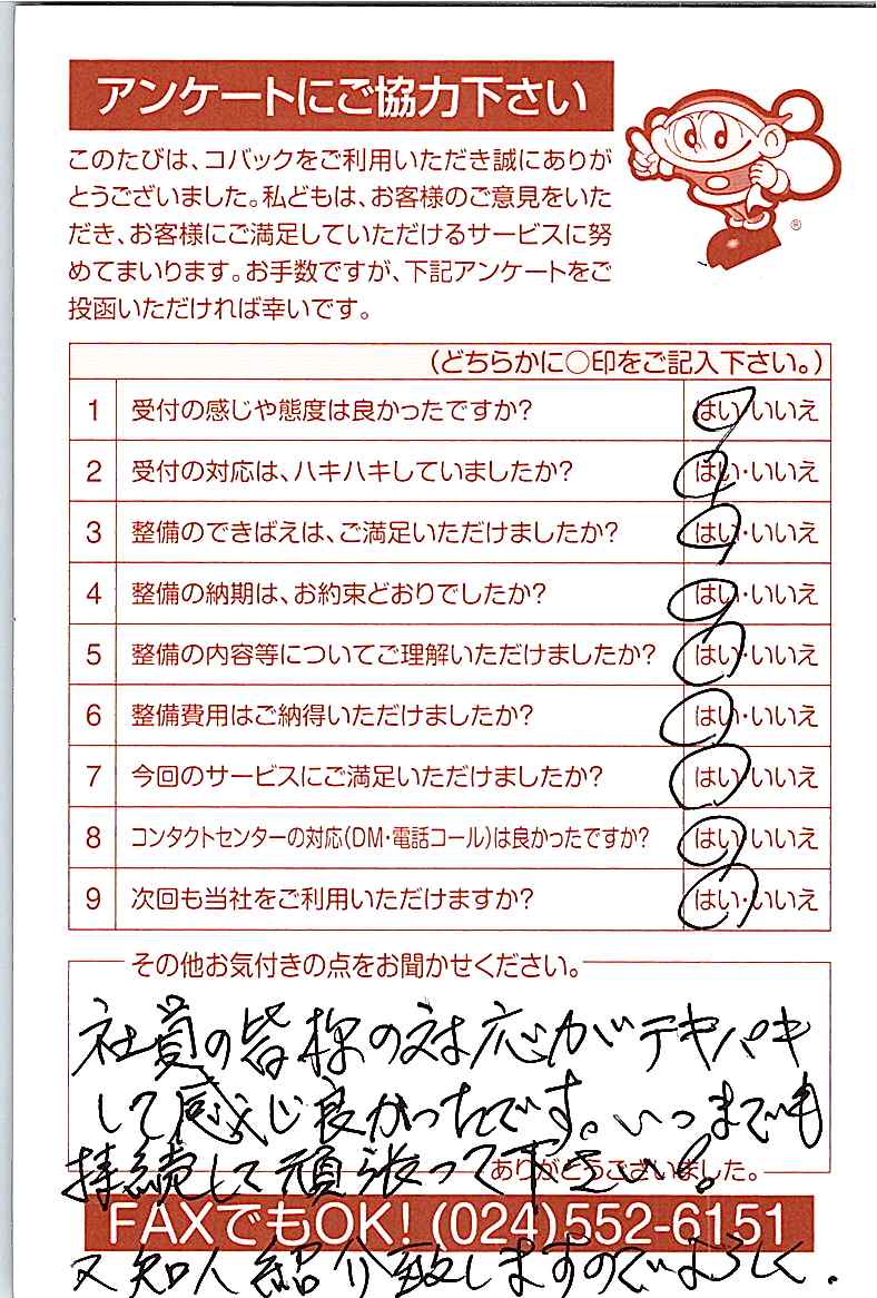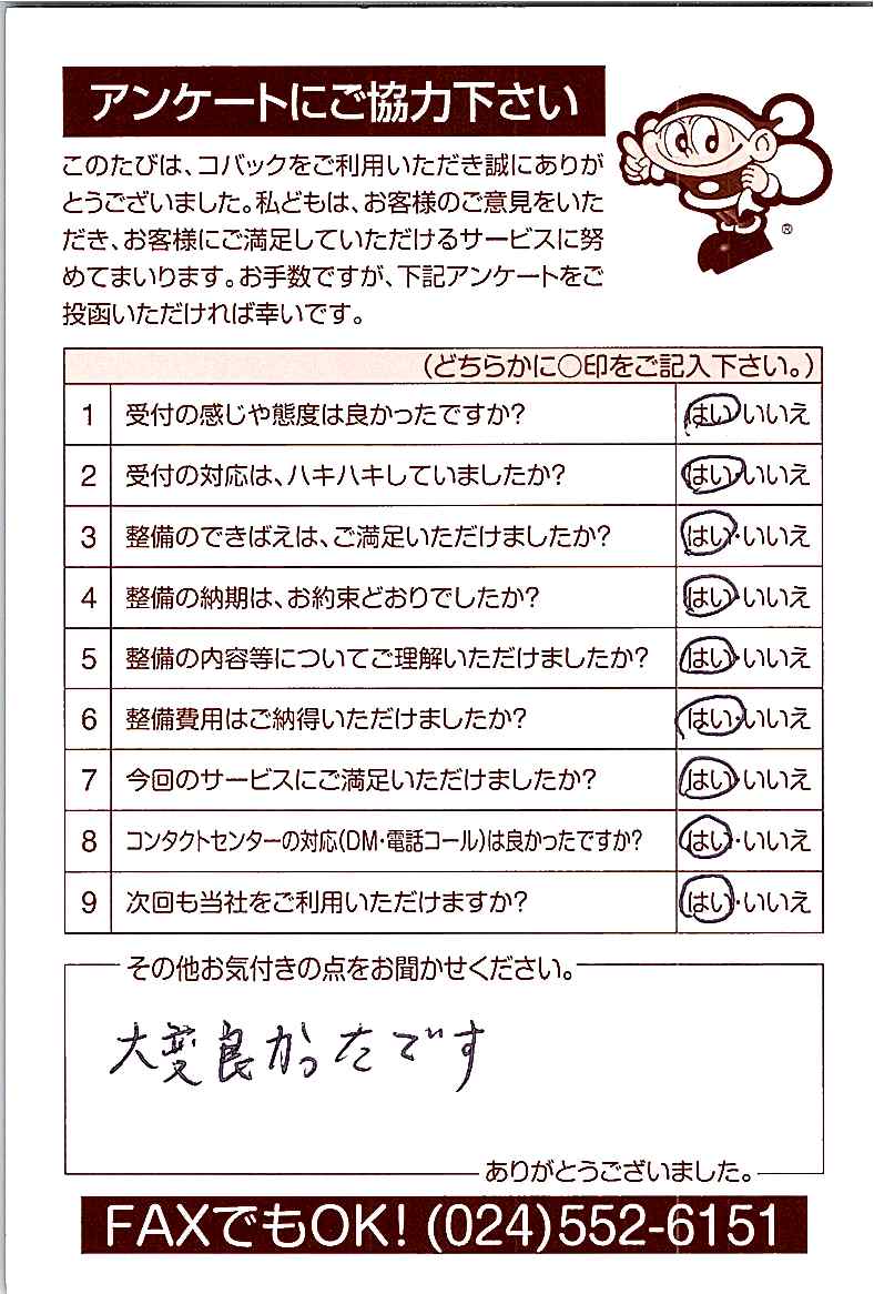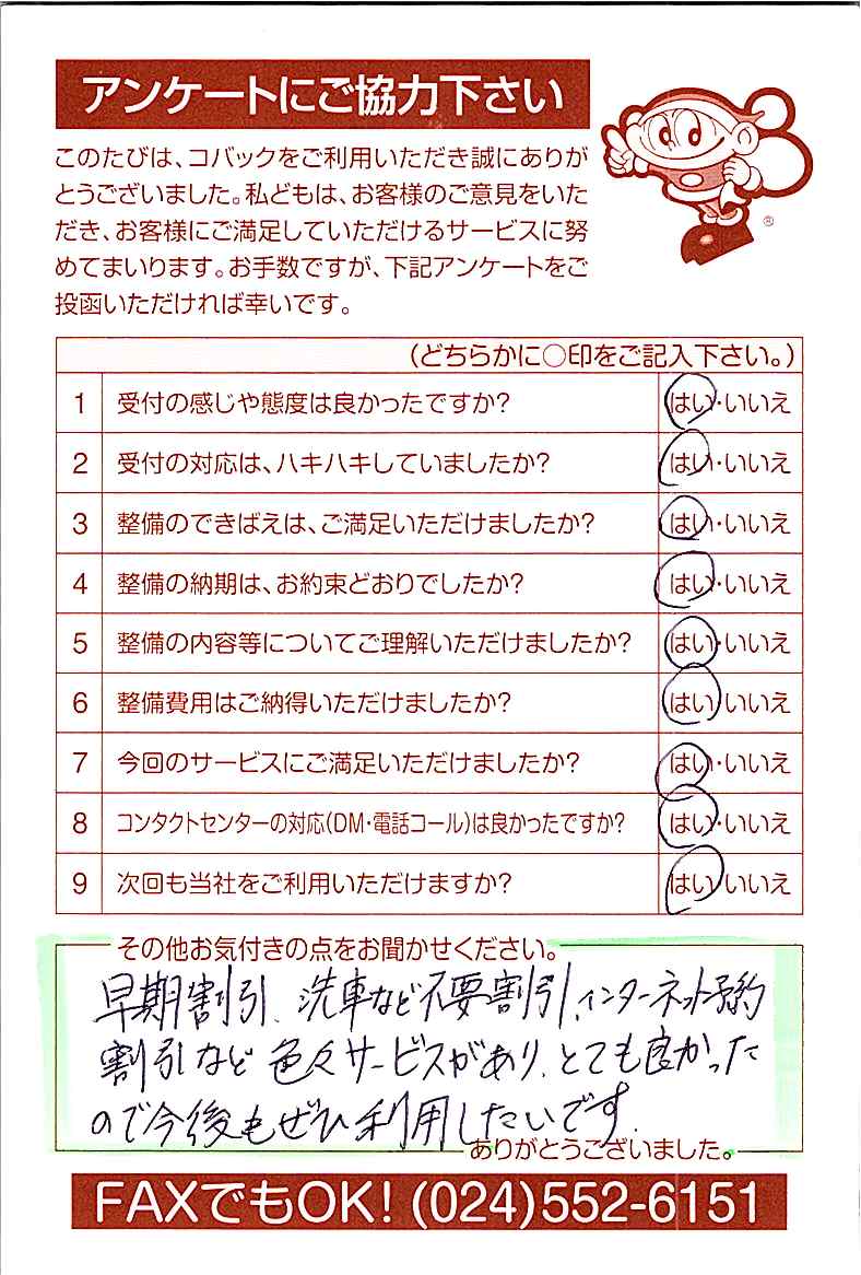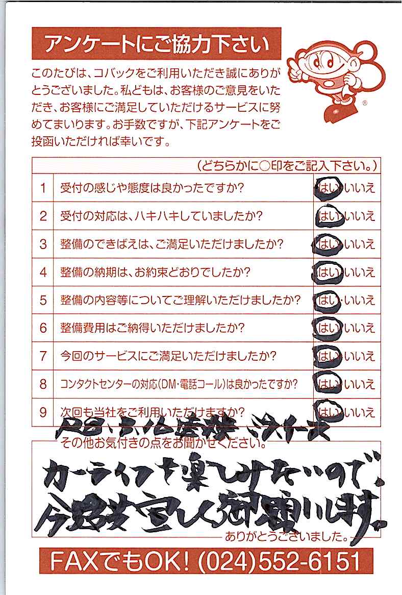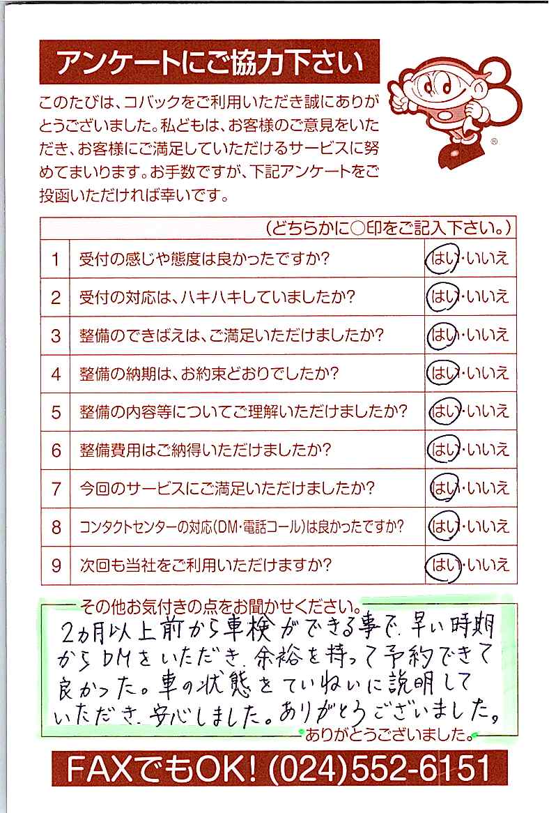 お客様からいただいたアンケートハガキをご紹介いたします。お寄せいただいた貴重なご意見は、今後の大久自動車販売のより良いサービスに繋げて行きたいと思っております。