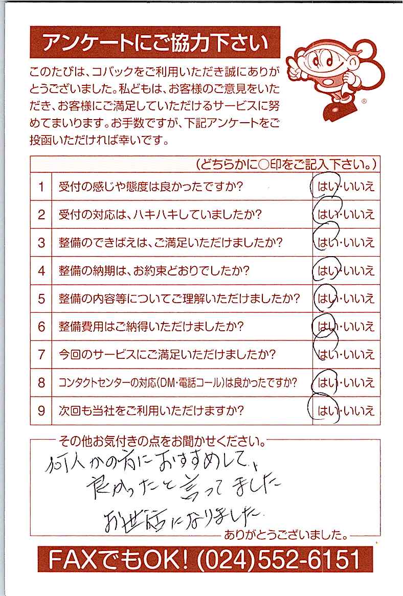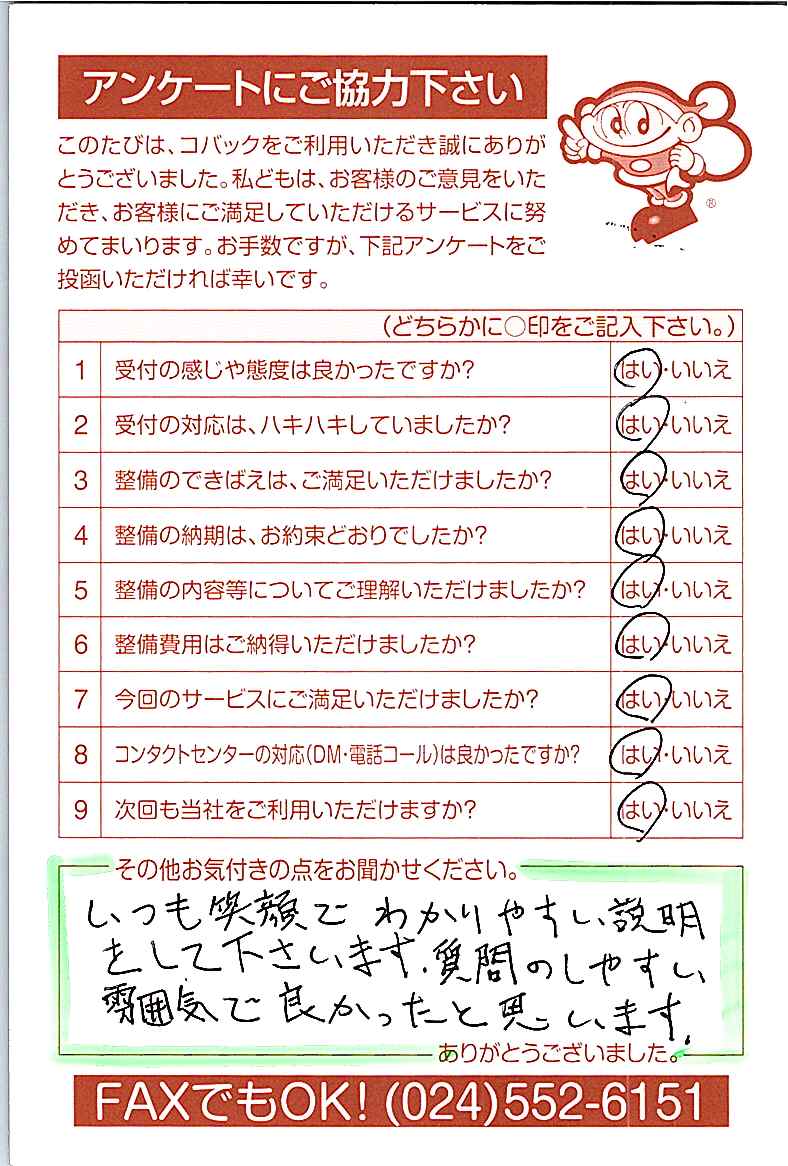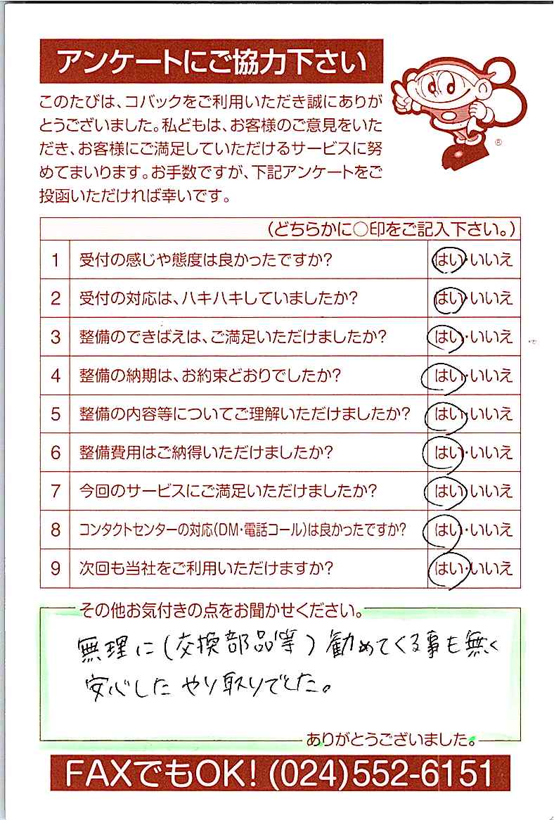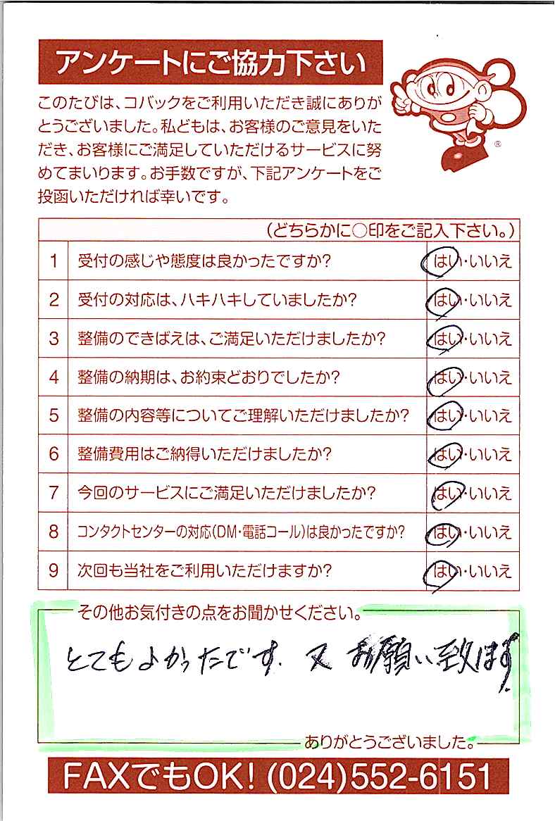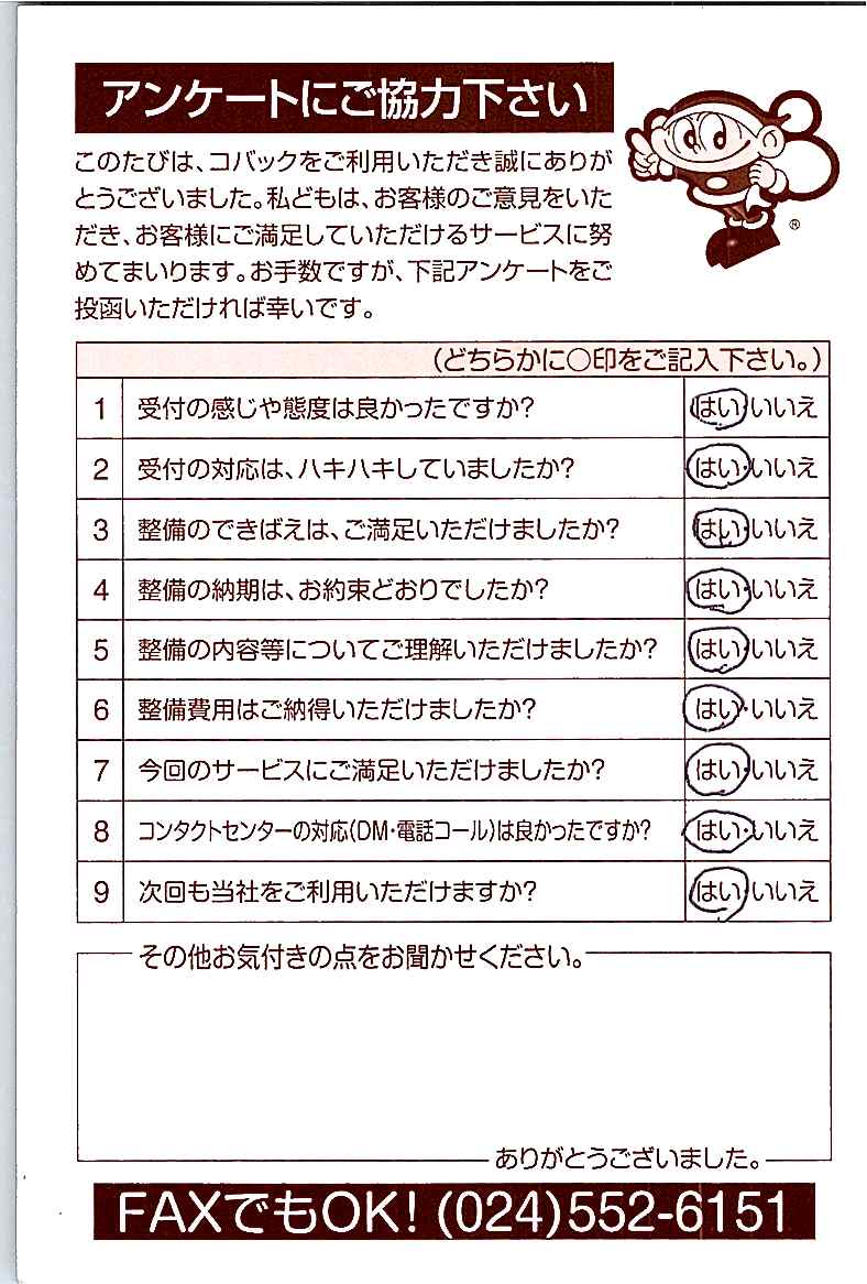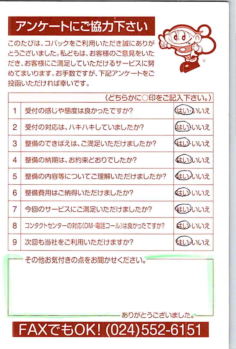 お客様からいただいたアンケートハガキをご紹介いたします。お寄せいただいた貴重なご意見は、今後の大久自動車販売のより良いサービスに繋げて行きたいと思っております。