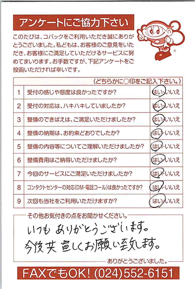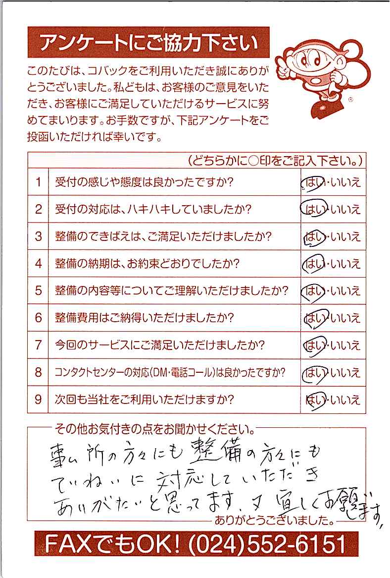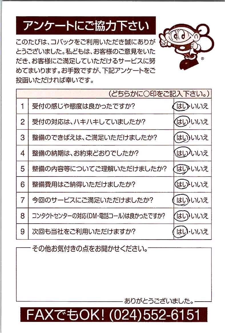 お客様からいただいたアンケートハガキをご紹介いたします。お寄せいただいた貴重なご意見は、今後の大久自動車販売のより良いサービスに繋げて行きたいと思っております。