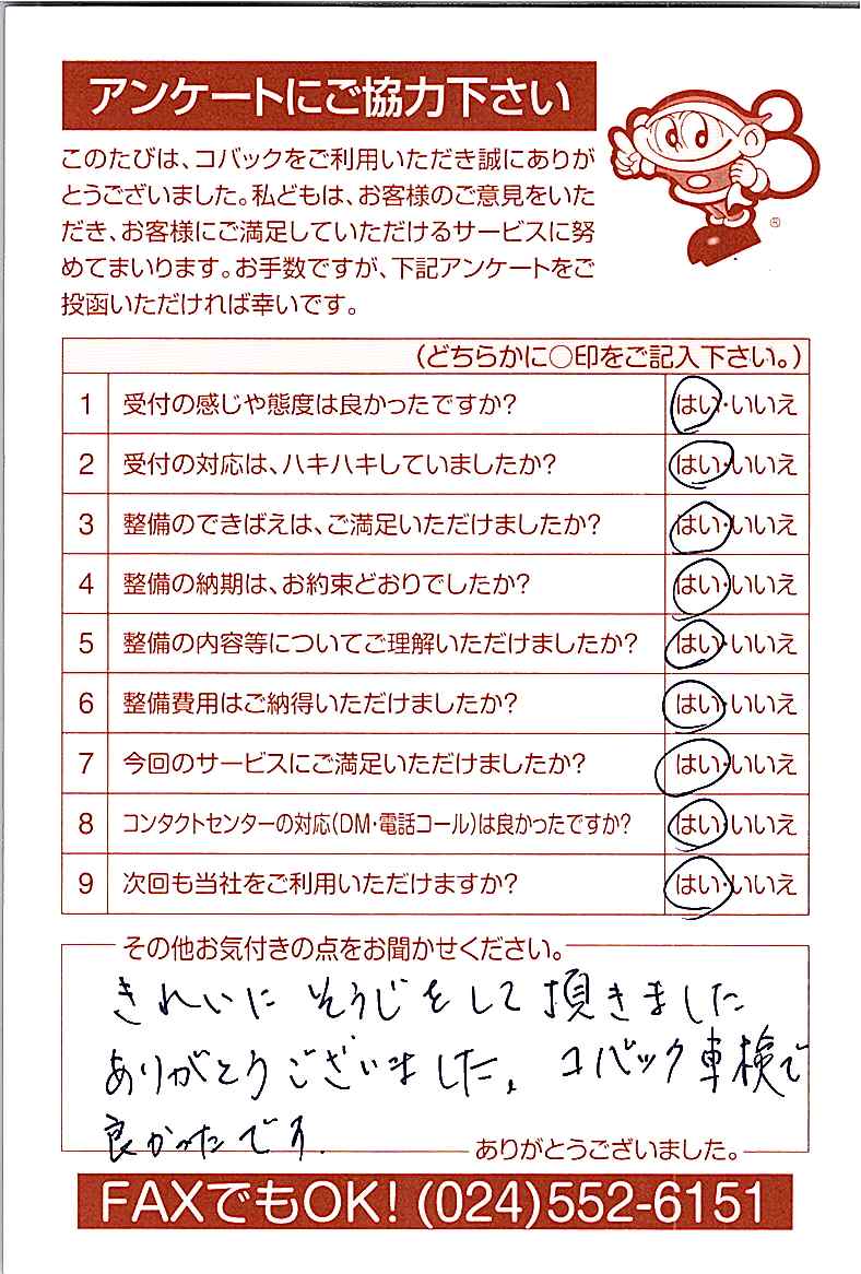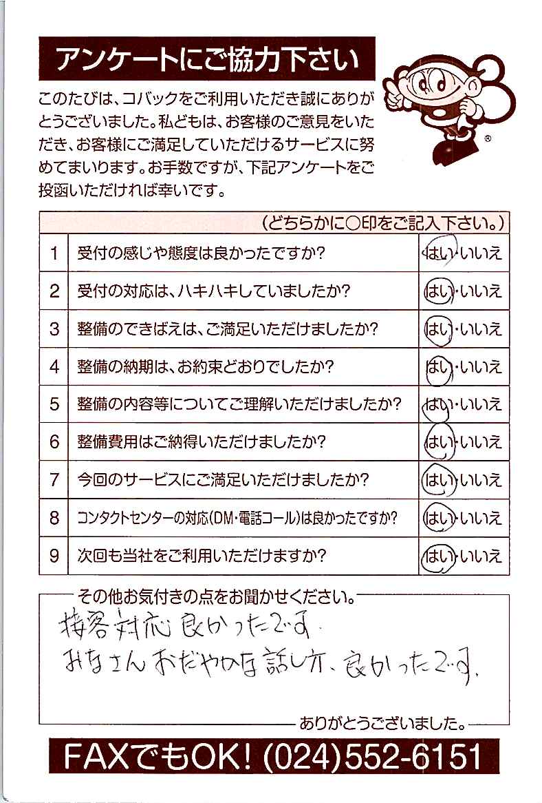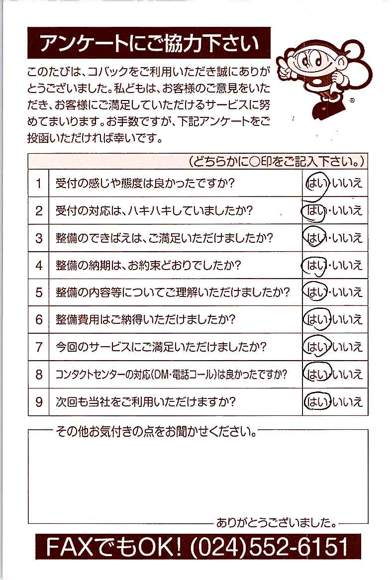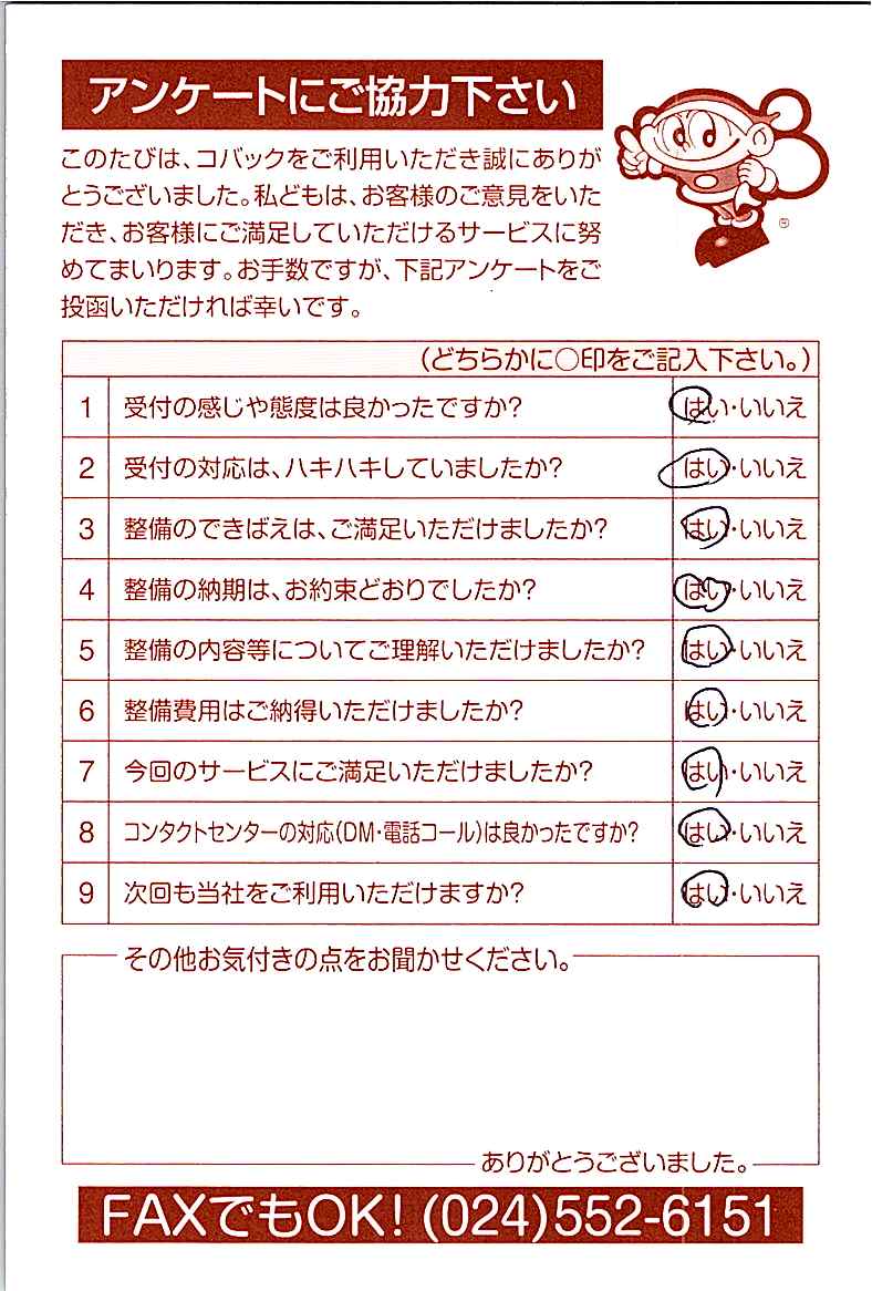 お客様からいただいたアンケートハガキをご紹介いたします。お寄せいただいた貴重なご意見は、今後の大久自動車販売のより良いサービスに繋げて行きたいと思っております。