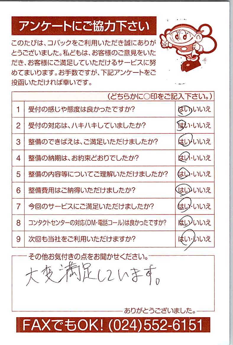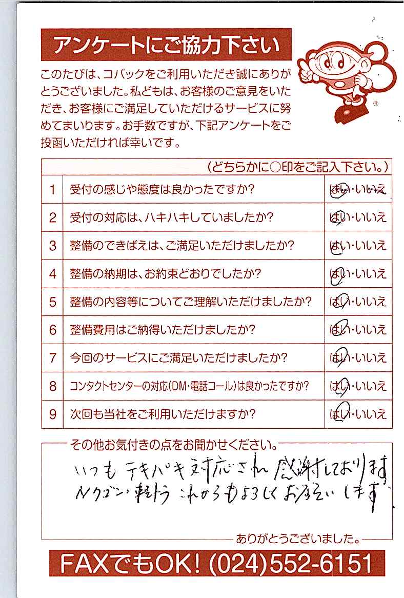 お客様からいただいたアンケートハガキをご紹介いたします。お寄せいただいた貴重なご意見は、今後の大久自動車販売のより良いサービスに繋げて行きたいと思っております。