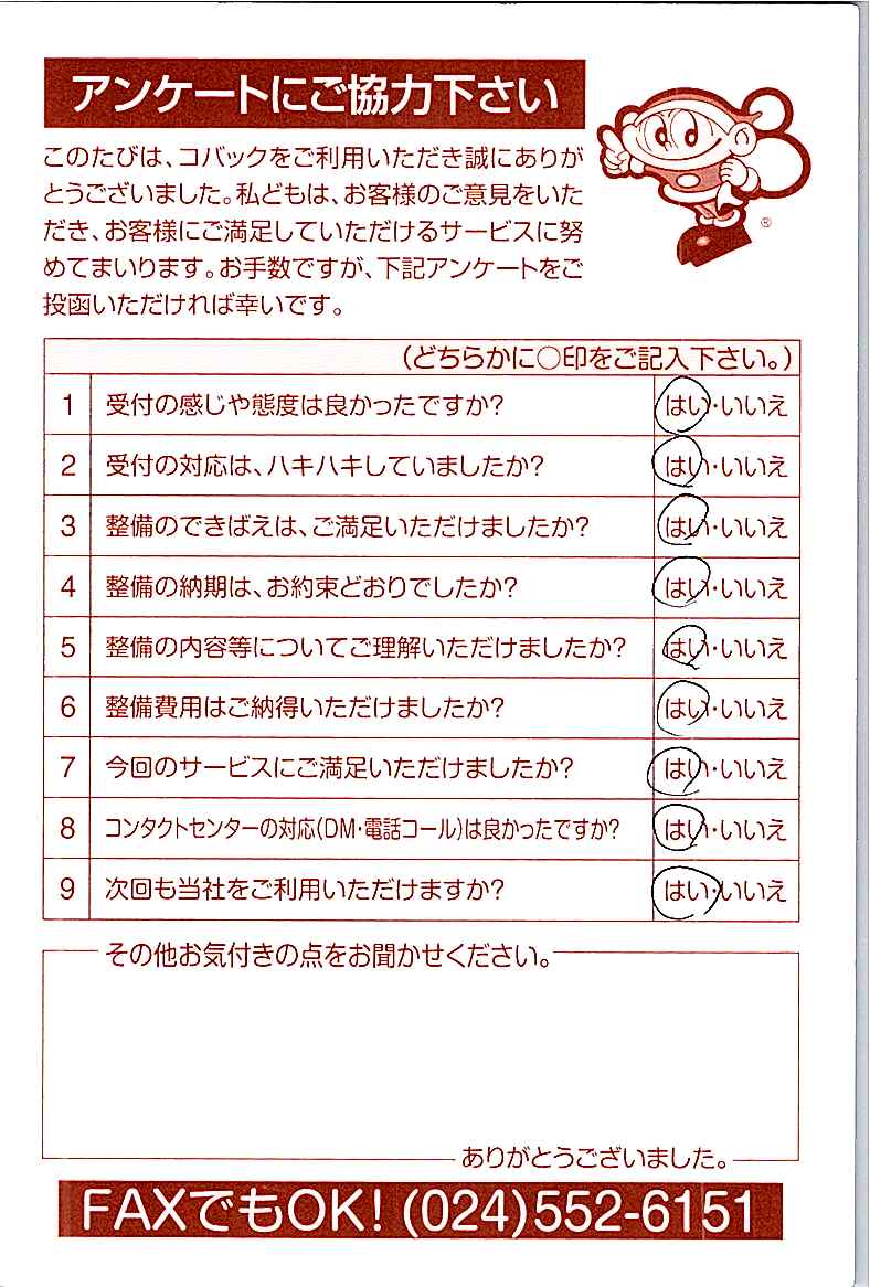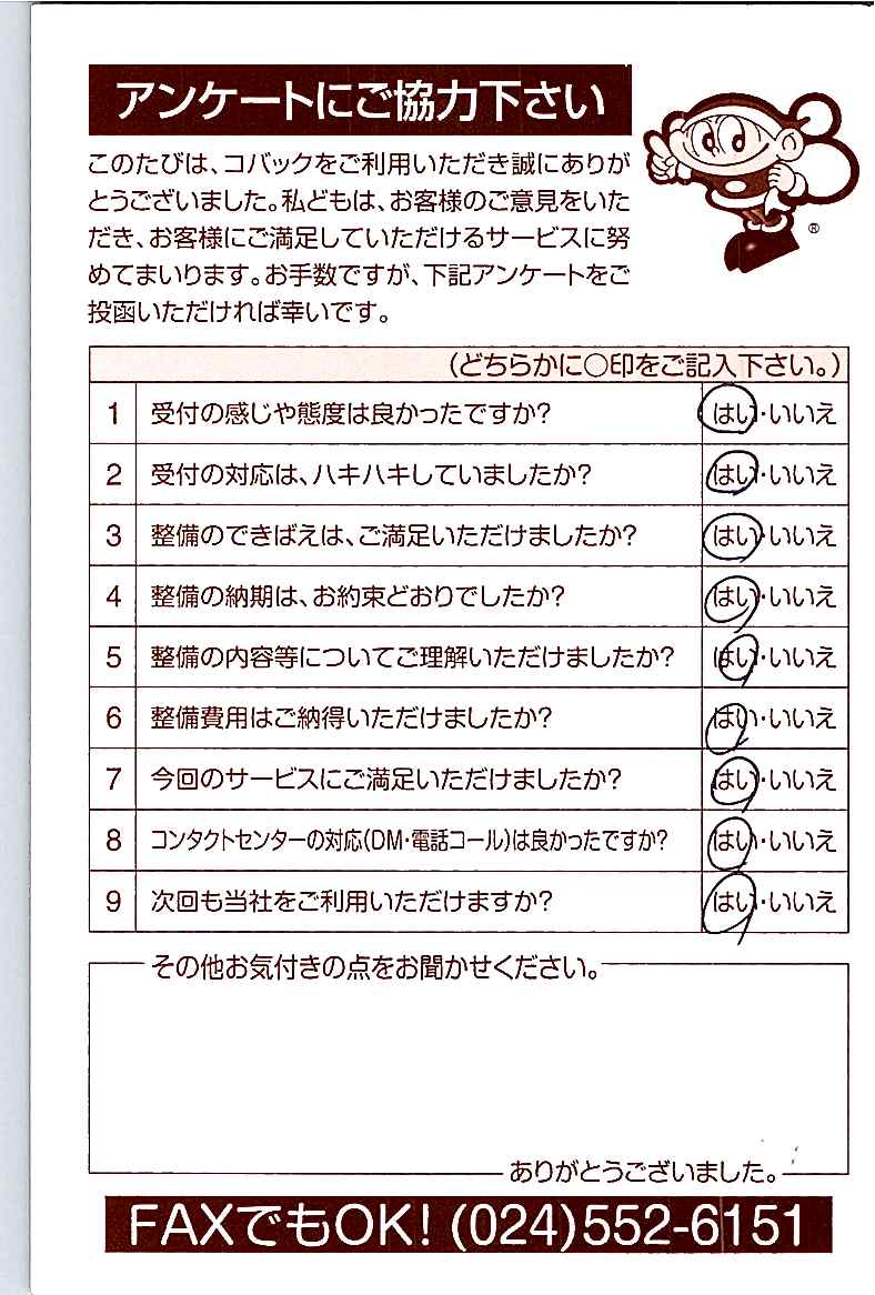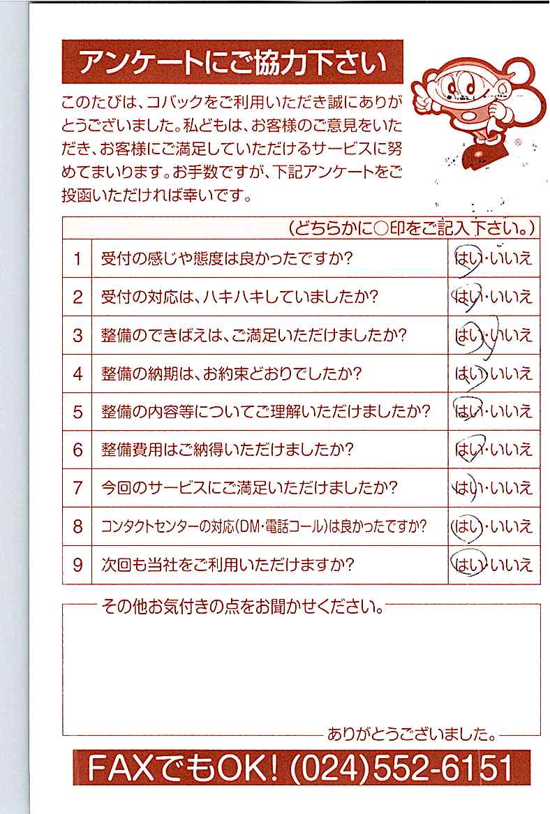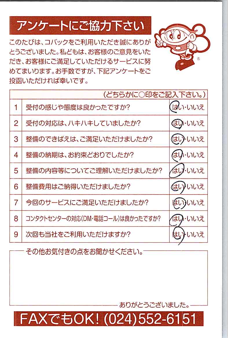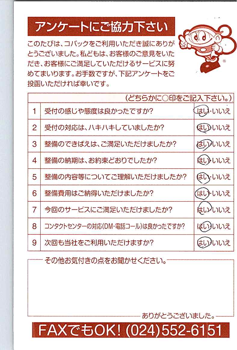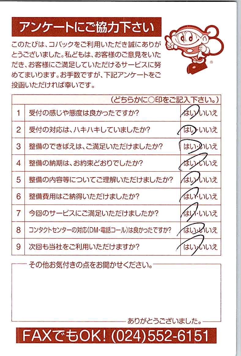 車検のコバック各店をご利用後には、ぜひアンケートのご協力をよろしくお願いいたします。