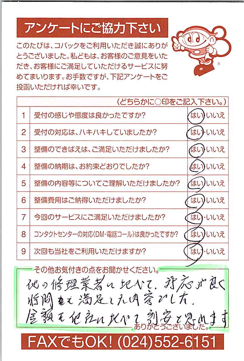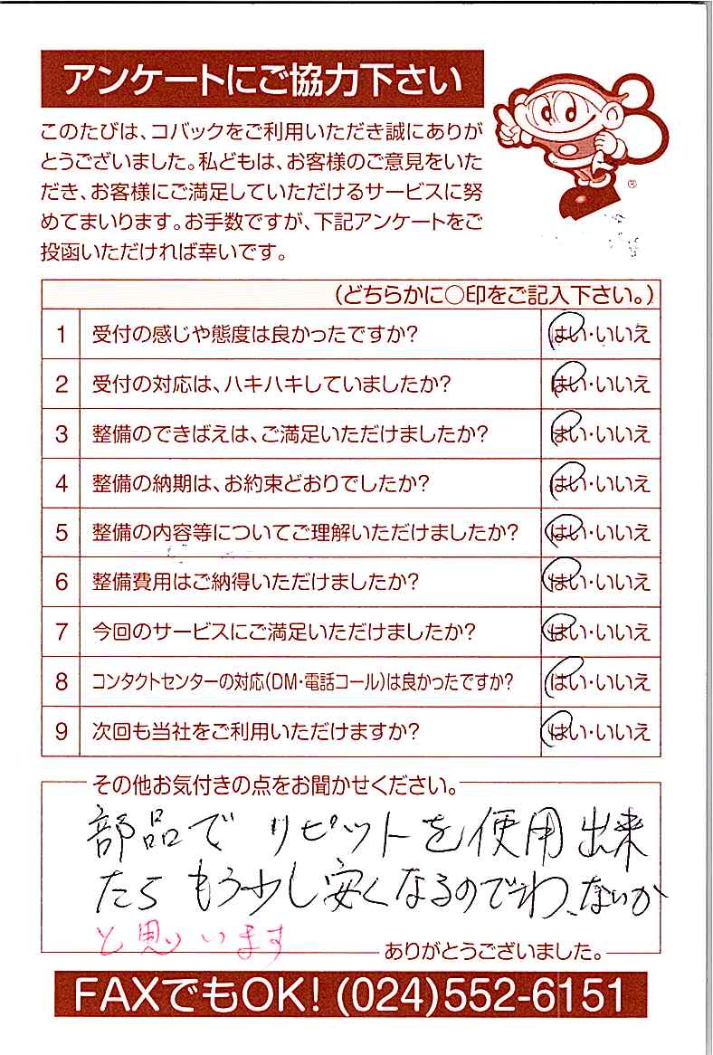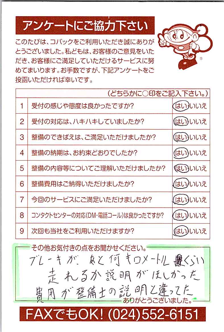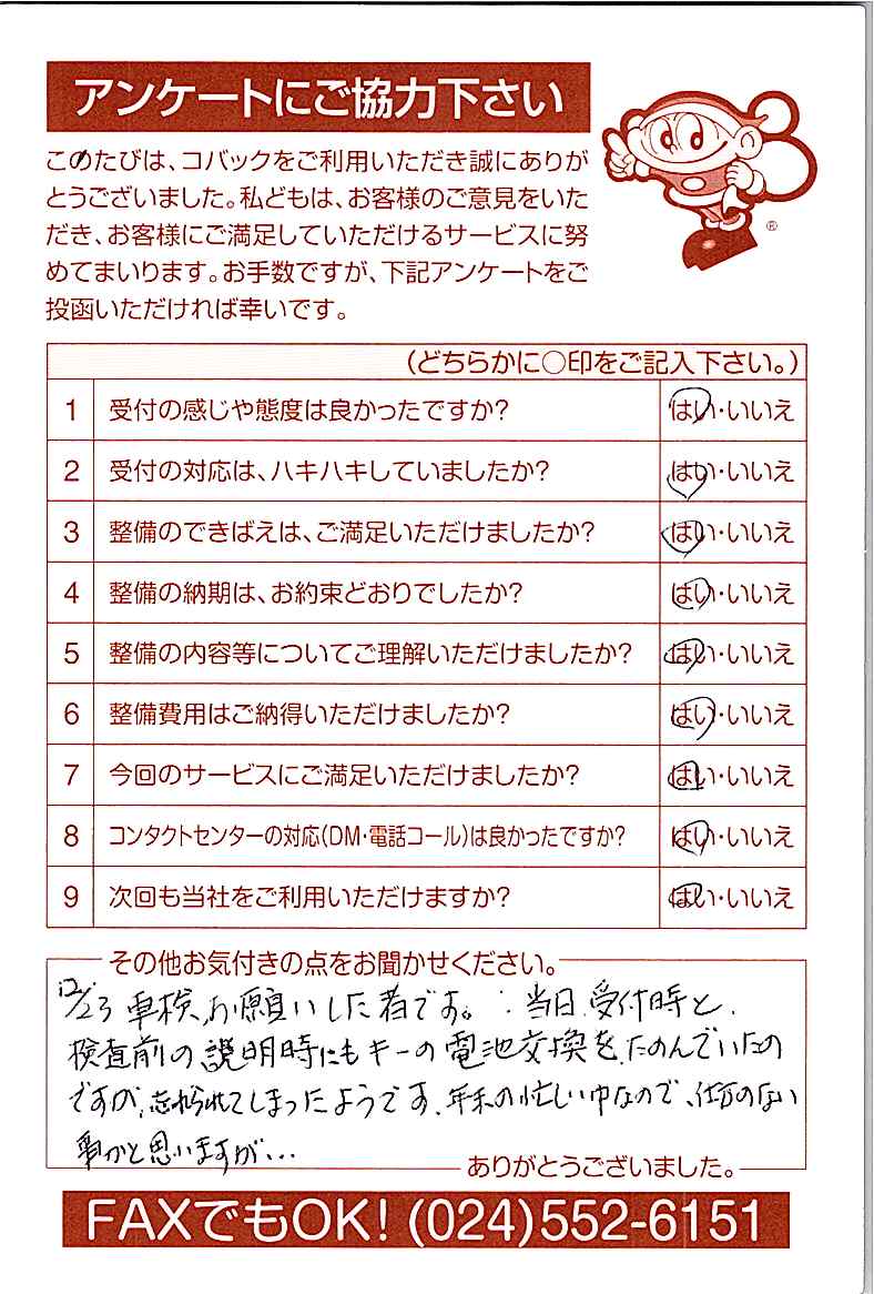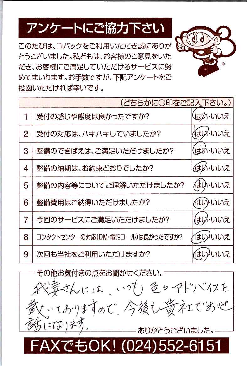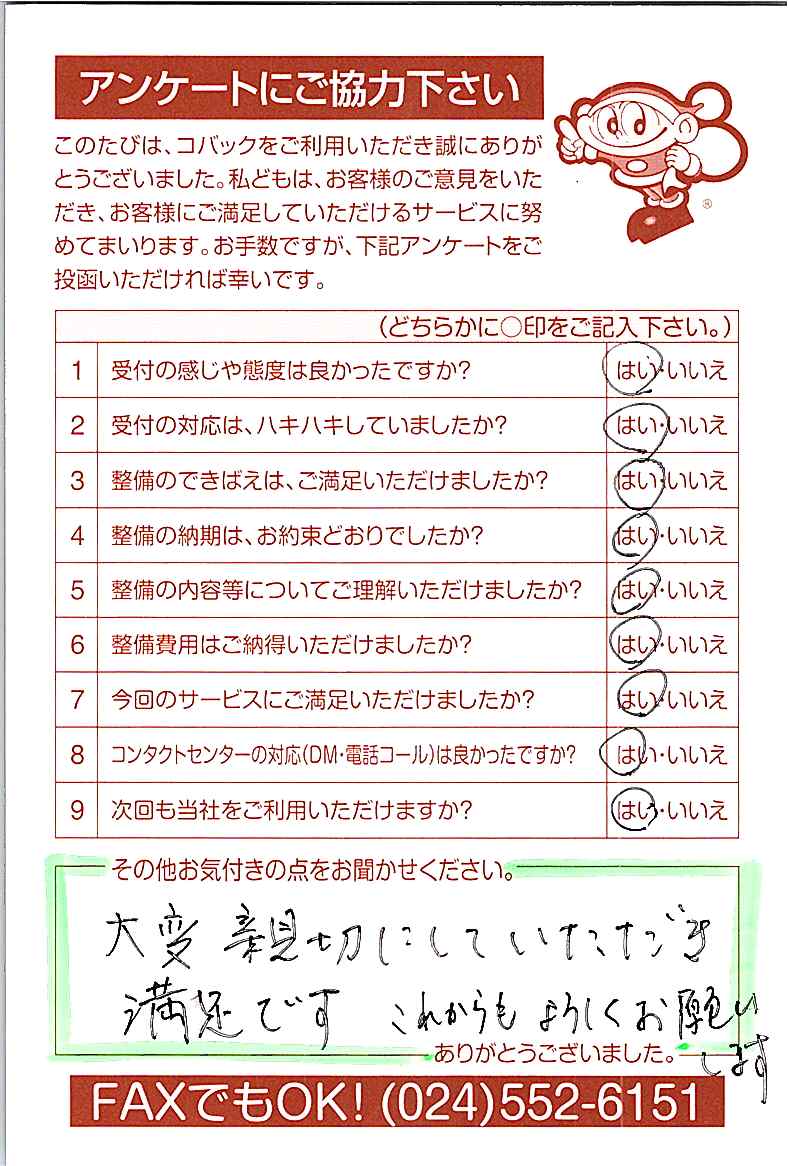 お客様からいただいたアンケートハガキをご紹介いたします。お寄せいただいた貴重なご意見は、今後の大久自動車販売のより良いサービスに繋げて行きたいと思っております。