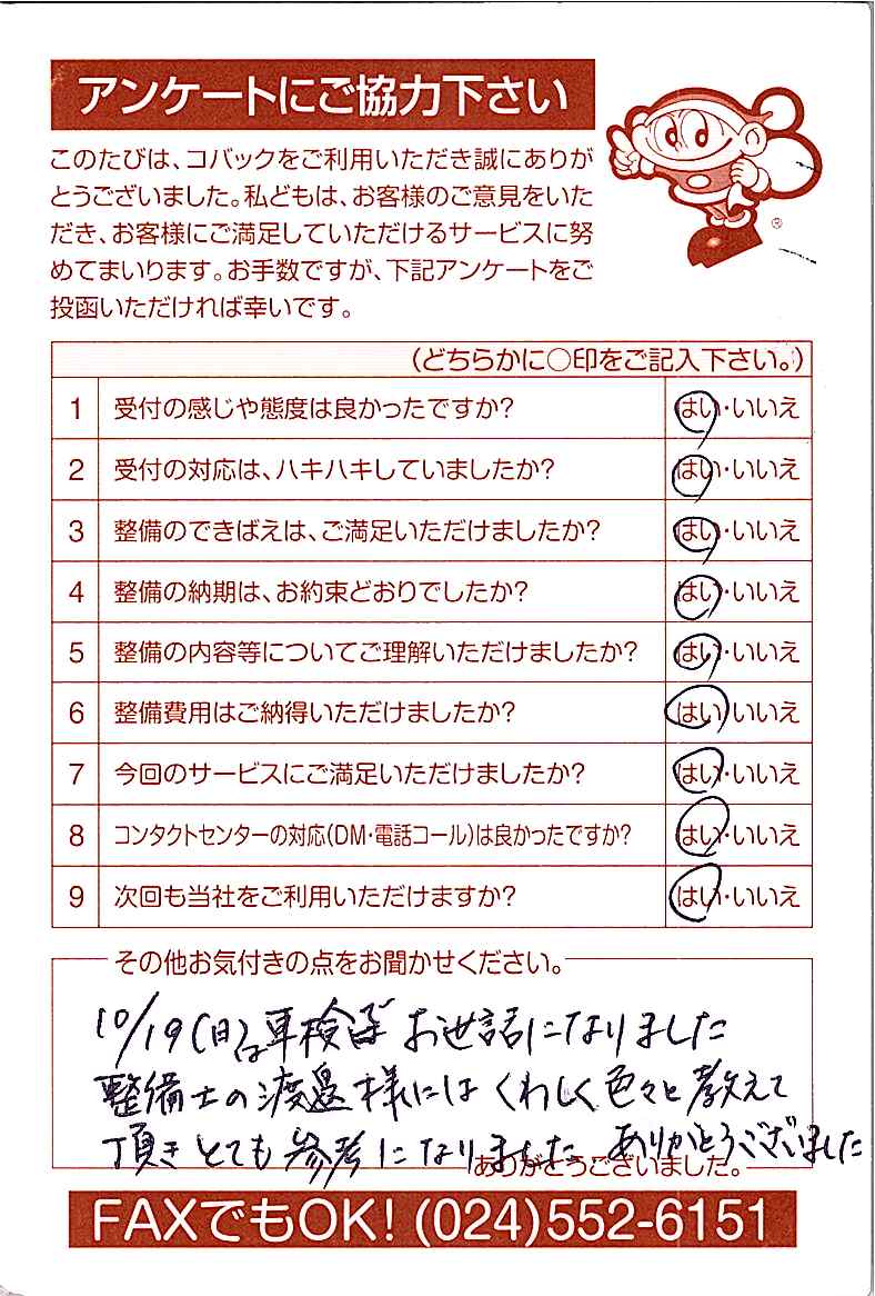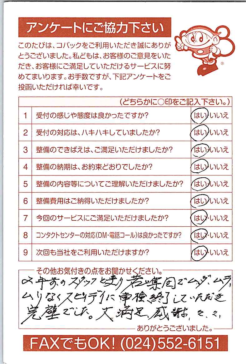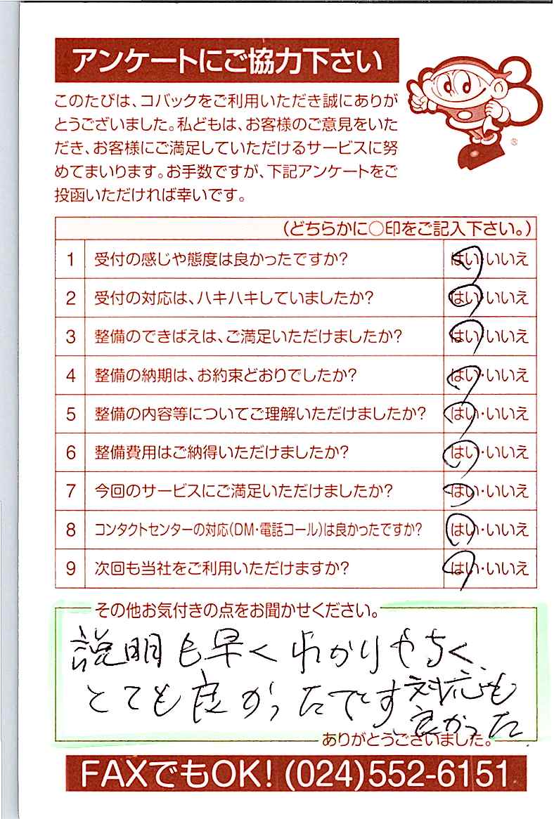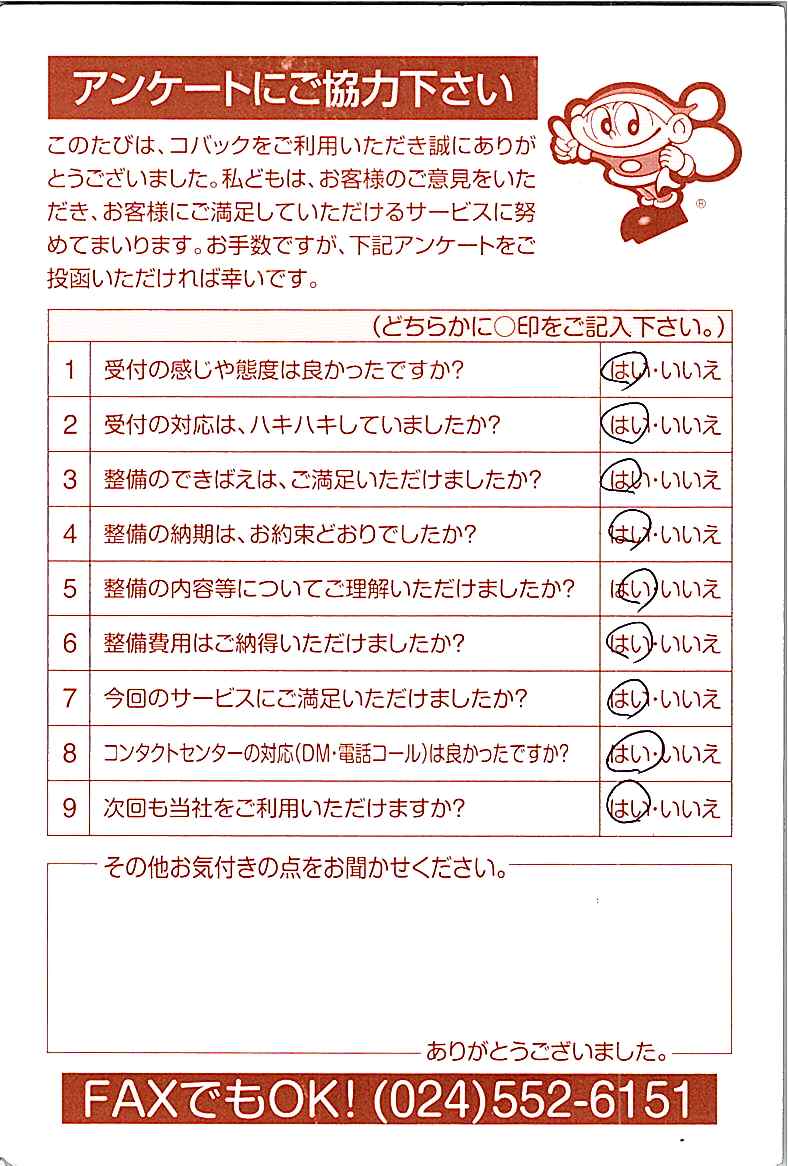 お客様からいただいたアンケートハガキをご紹介いたします。お寄せいただいた貴重なご意見は、今後の大久自動車販売のより良いサービスに繋げて行きたいと思っております。