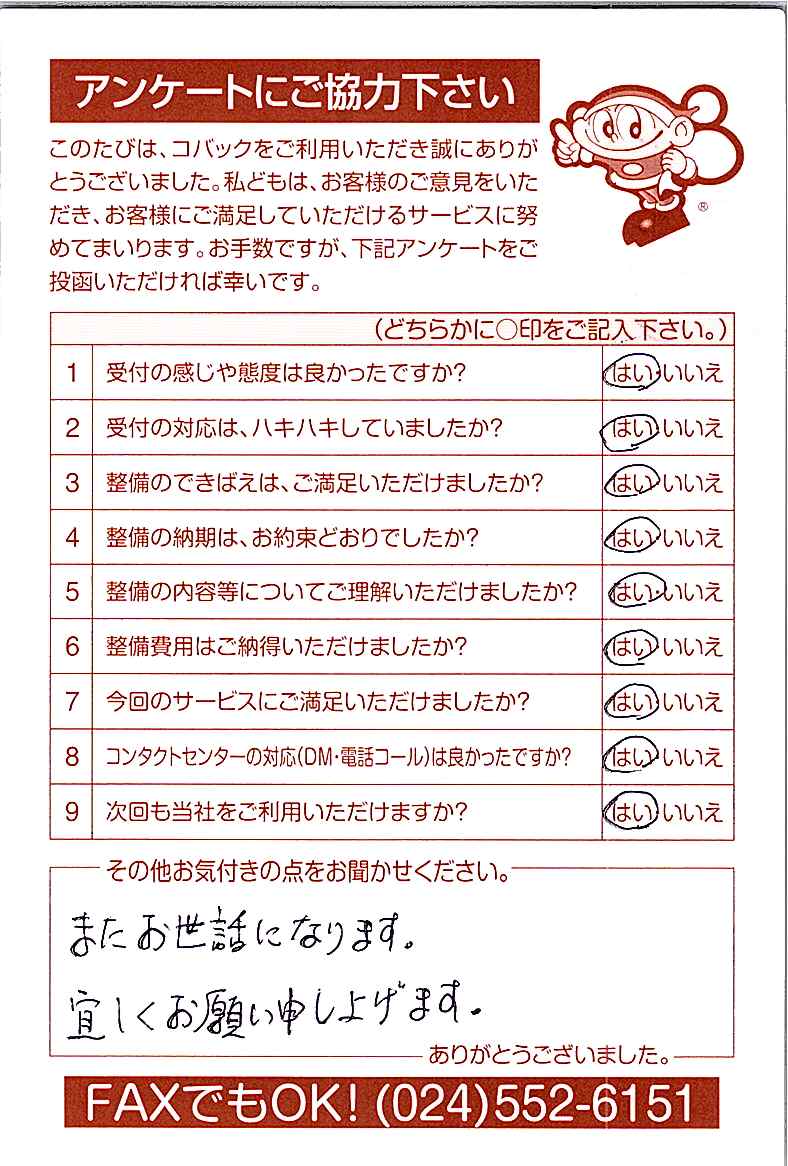 お客様からいただいたアンケートハガキをご紹介いたします。お寄せいただいた貴重なご意見は、今後の大久自動車販売のより良いサービスに繋げて行きたいと思っております。