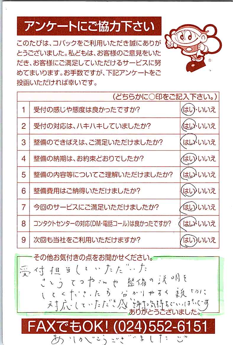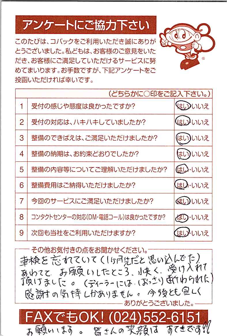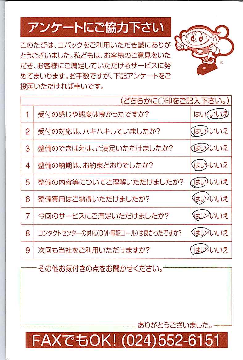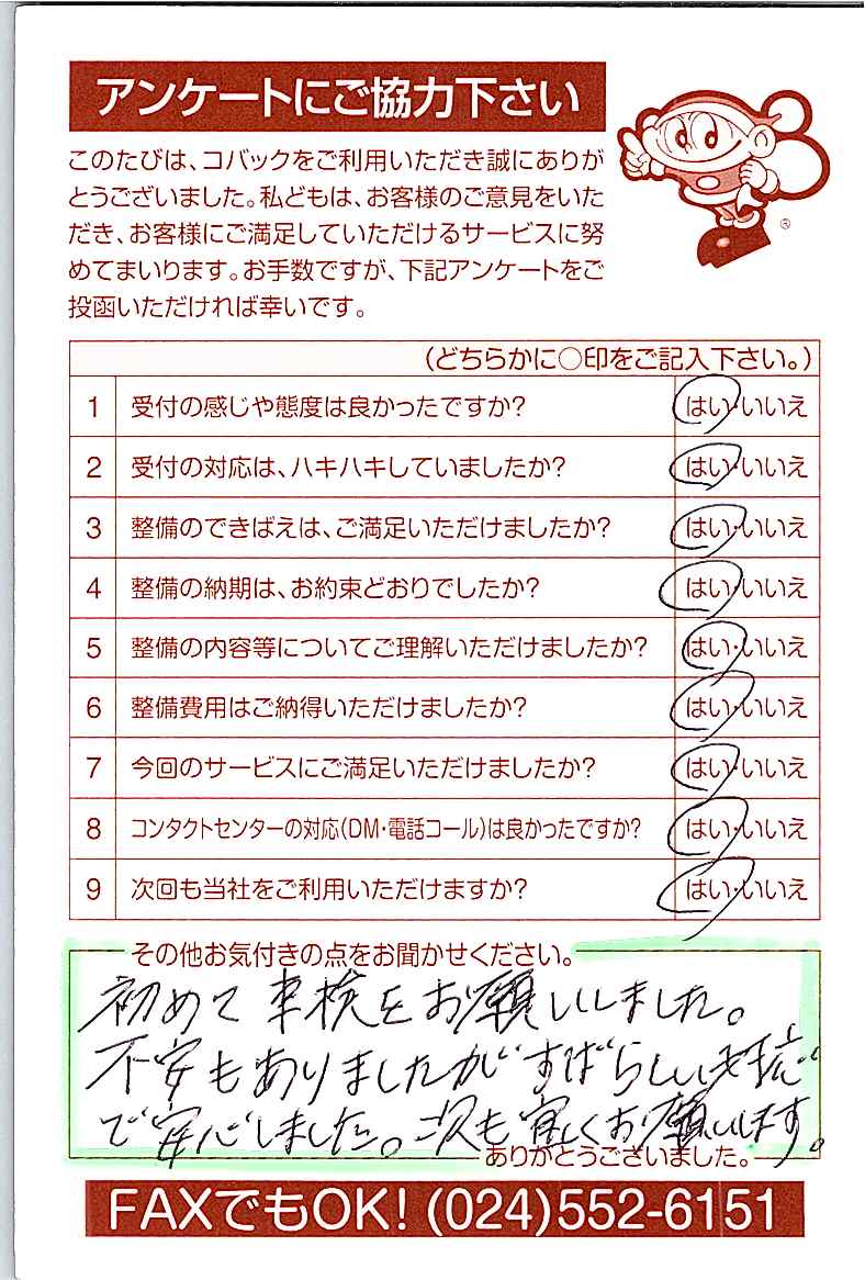 お客様からいただいたアンケートハガキをご紹介いたします。お寄せいただいた貴重なご意見は、今後の大久自動車販売のより良いサービスに繋げて行きたいと思っております。
