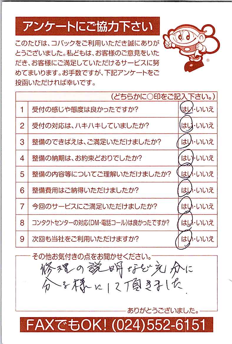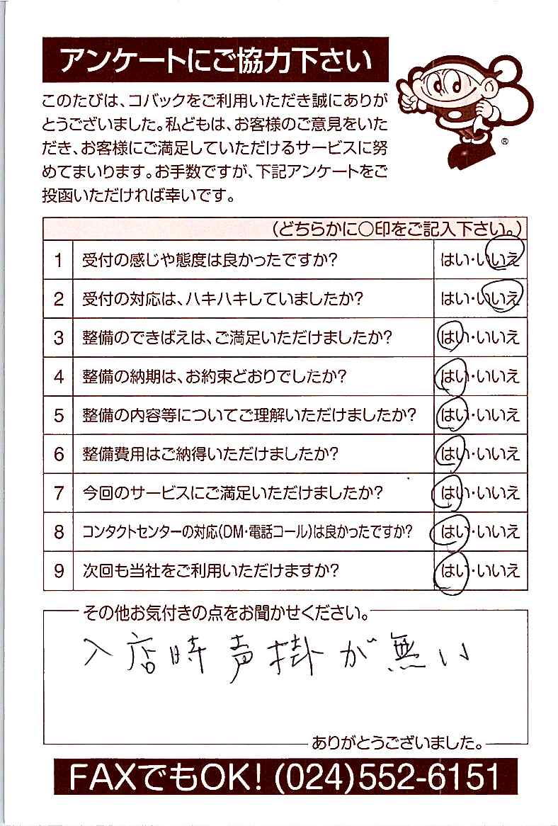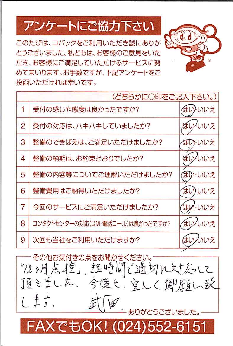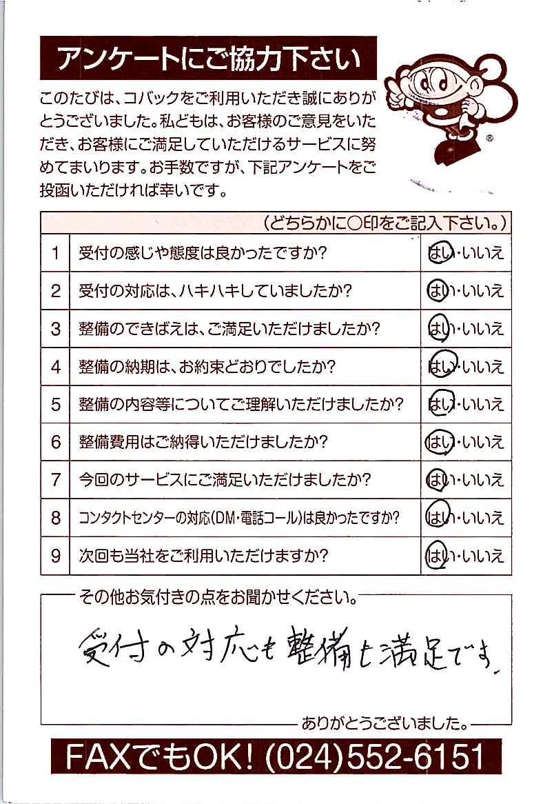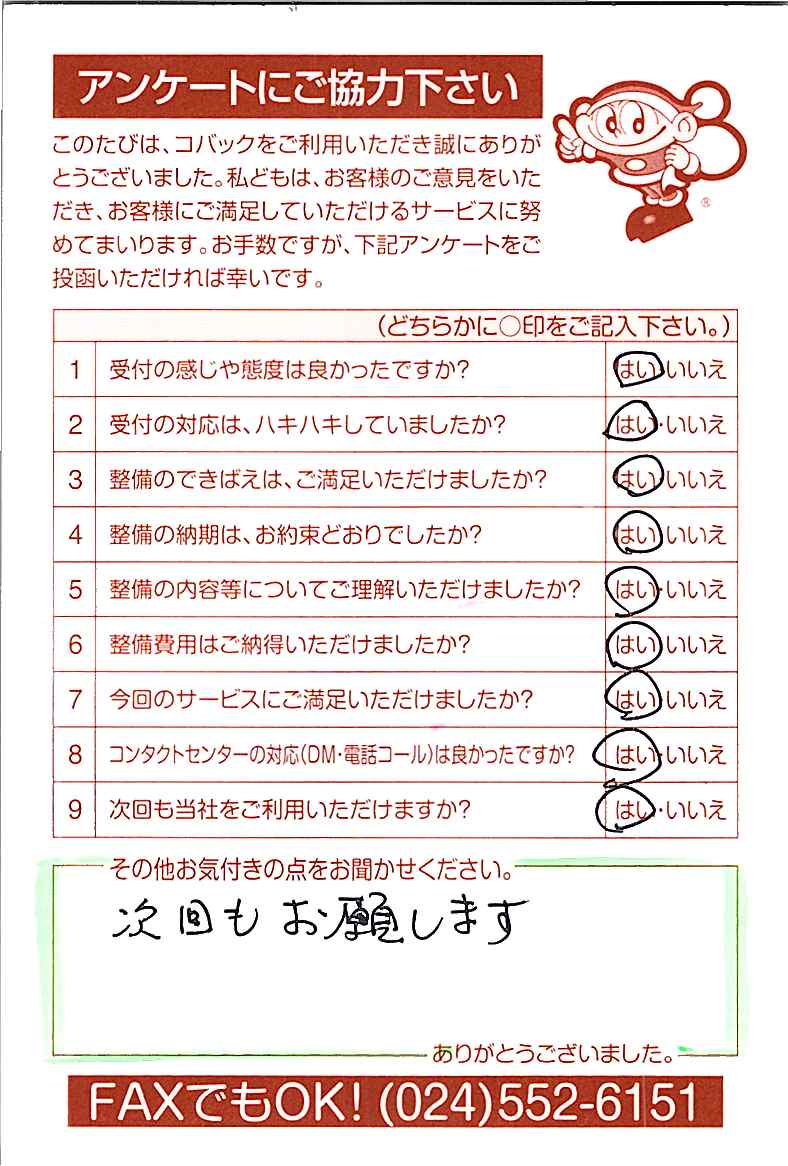お客様からいただいたアンケートハガキをご紹介いたします。お寄せいただいた貴重なご意見は、今後の大久自動車販売のより良いサービスに繋げて行きたいと思っております。